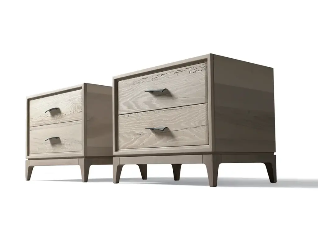 Models M-632 and M-633 from the Dale Italia collection are also available in a natural grey walnut version. Revealing the irregular grain of the wood, the special textural effect gives your bedroom a sense of relaxation with a breath of fresh air.Bedside table in walnut veneer blockboard. Two drawers in antique oak.• Colour: Natural grey walnut• Finish: Oil