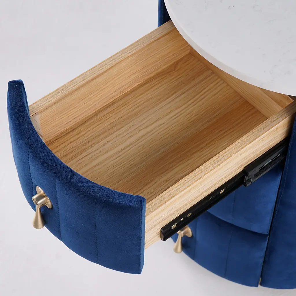 This sintered stoner top round nightstand combines style and function with a velvet-upholstered design. It features 3 spacious drawers for storing essentials. The durable stone top ensures long-lasting elegance.