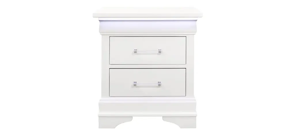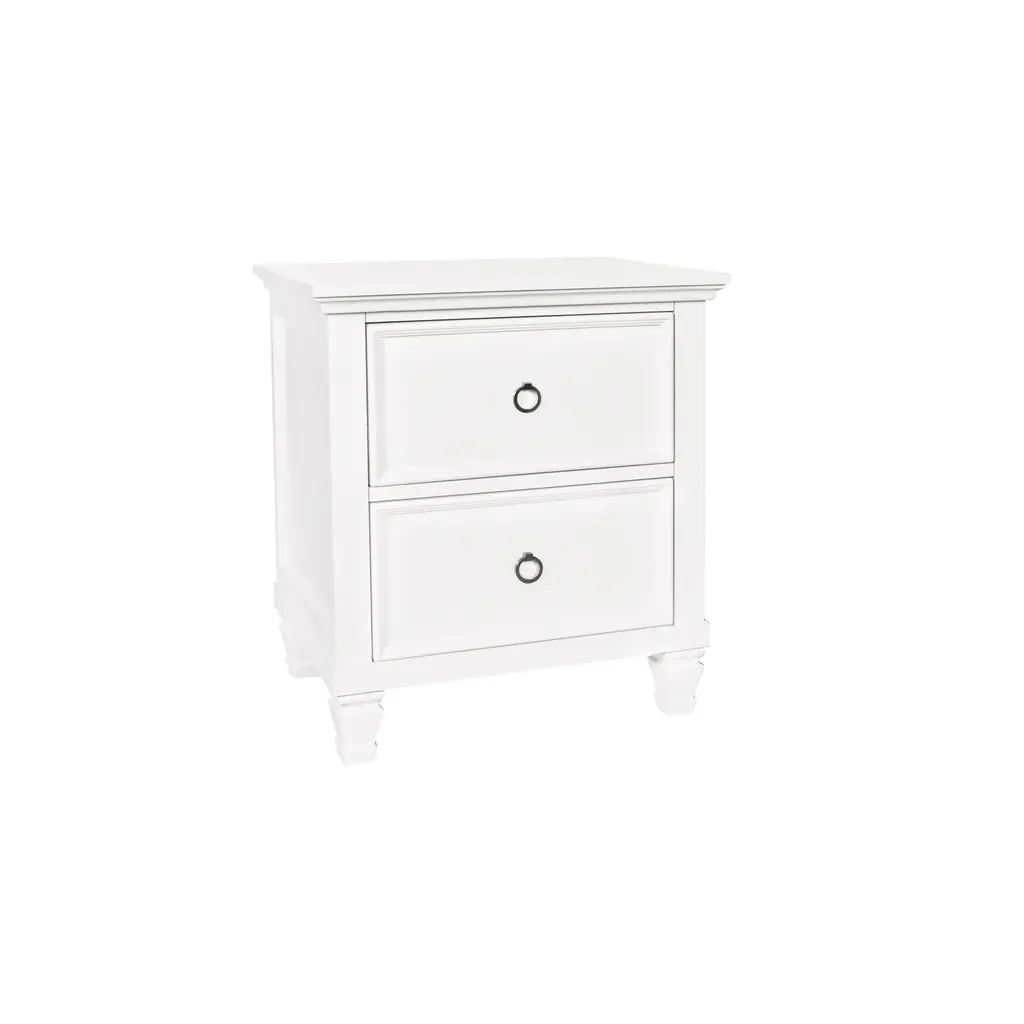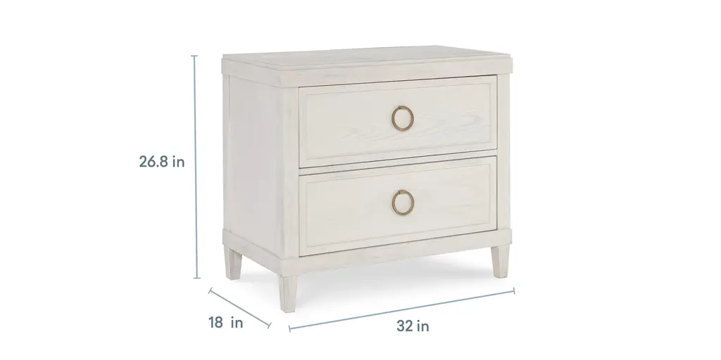 This Ventura Nightstand is beautifully scaled for almost any size bedroom. Styled with 2 drawers with a body-scaled pull ring, finished with self-closing drawer guides and; a display shelf. Available in two finishes: Chalk Slate and Shell White.