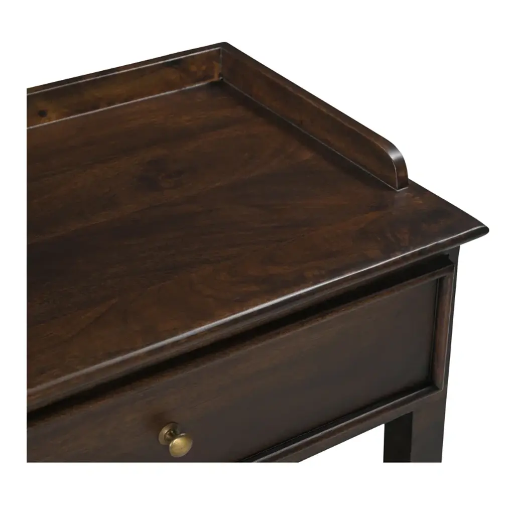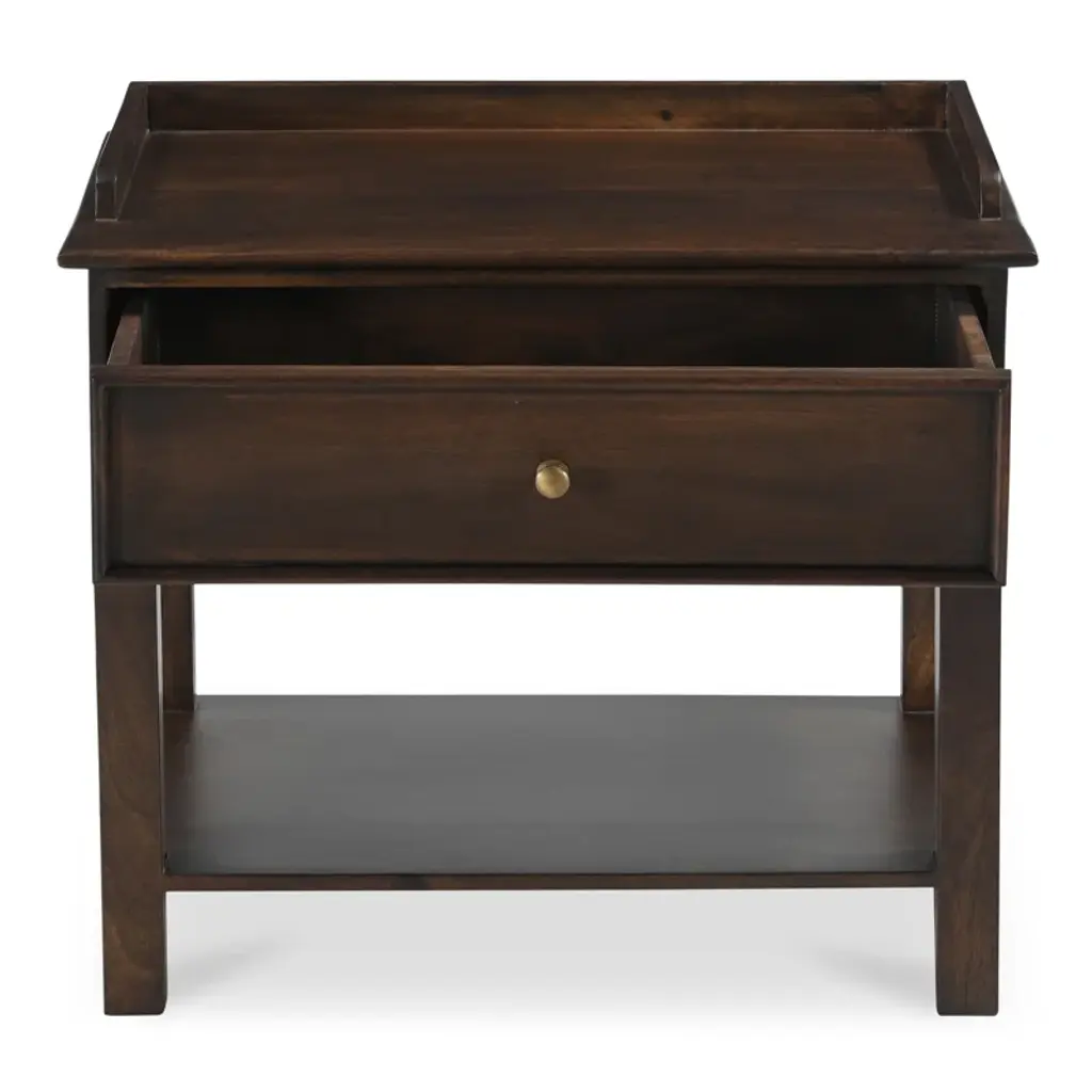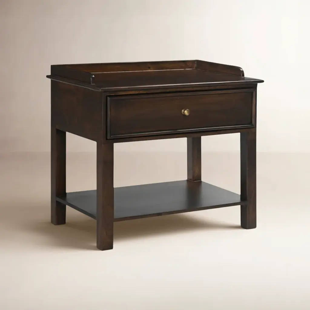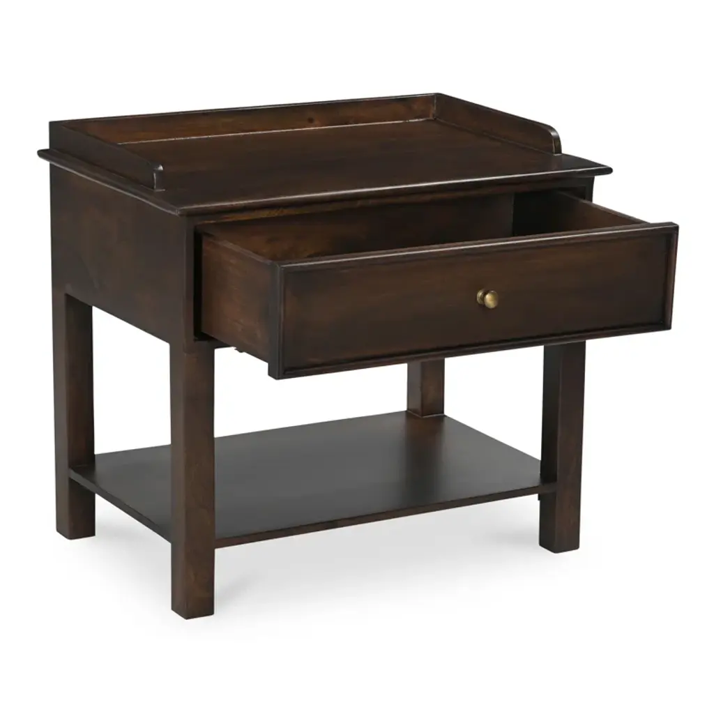 Staying true to traditional dimensions but elevated with leggy, modern proportions, the Vianna nightstand features distinctive lip detailing and an added shelf to harmonize its height. Crafted from mango wood and accented with brass-finished iron handles, it blends classic appeal with fresh touches for a sophisticated fusion.