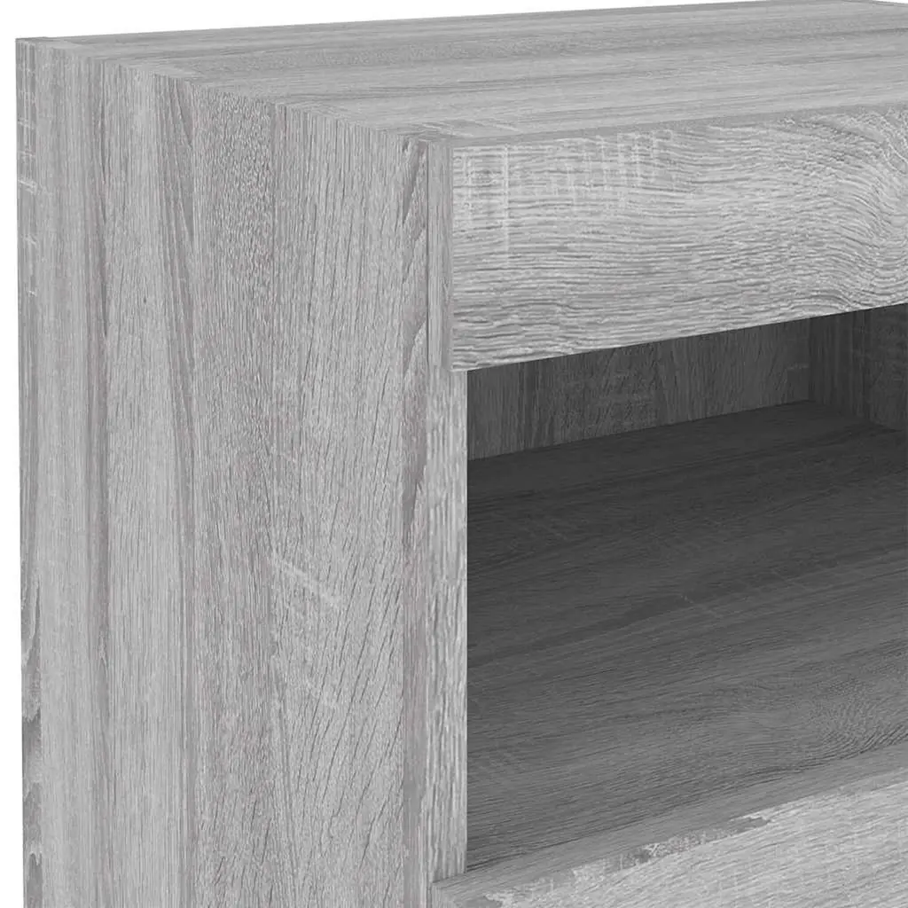 This modern bedside cabinet set has two stylish nightstands made for efficiency and looks in any bedroom. Their grey sonoma finish blends contemporary style with practicality, making it a great spot for lamps or keeping your essentials organized. Ample Storage: Each cabinet has plenty of compartments to keep everything organized, from books and glasses to chargers and gadgets, ensuring your nightstand stays tidy. Integrated Lighting: The RGB LED lights provide a lovely glow, with options to change colors to set the perfect atmosphere. Ideal for reading or just relaxing at night. Modern Design: With sleek lines and a simple rectangular shape, these cabinets show modern design at its best. Their matte finish enhances any bedroom style, from simple to trendy. Easy Assembly: Each cabinet can be put together quickly with just a few tools. The included USB plug makes it easy to power the LED lights, so you can set them up without any hassle. Quality Materials: Built from engineered wood, these cabinets are tough and feature a smooth surface. They handle moisture well, keeping your stored items safe and lasting long.