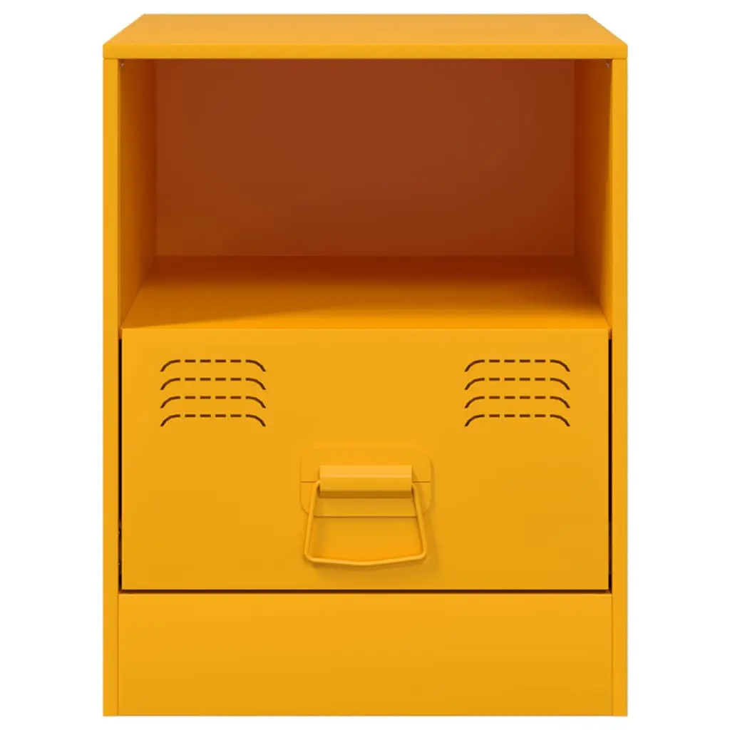 This set of two mustard yellow bedside cabinets adds a vibrant touch to your bedroom, balancing style and practicality. Each cabinet showcases a sleek metal frame with a smooth surface that not only looks great but also provides useful storage for your nighttime essentials. Stylish Modern Design: The contemporary look of these cabinets fits right in with any modern decor, making them a great addition to your space. Sturdy Steel Construction: Made from high-quality cold-rolled steel, these cabinets are tough, supporting a max weight of 61.7 lbs while looking great. Versatile Storage Options: Each cabinet has a traditional drawer and a roomy shelf, just right for lamps, books, or personal items you've got close at hand. Easy to Clean: With a powder-coated finish, keeping these cabinets fresh and clean is super easy; just wipe with a damp cloth. Compact Dimensions: At 15.4 in wide and 13.6 in long, these cabinets are perfect for snug spaces, ensuring you’ve got storage without crowding your room.