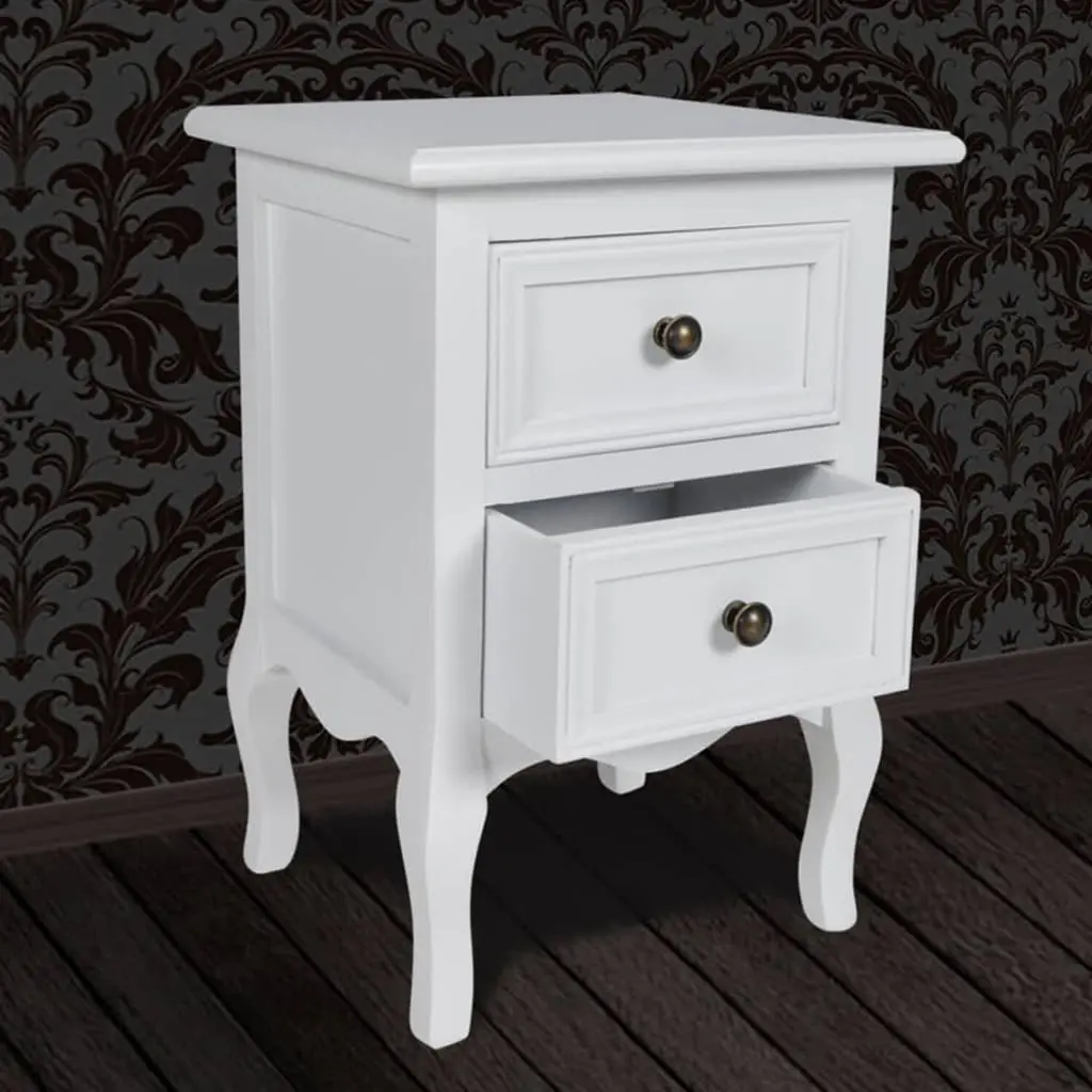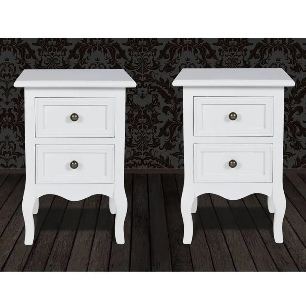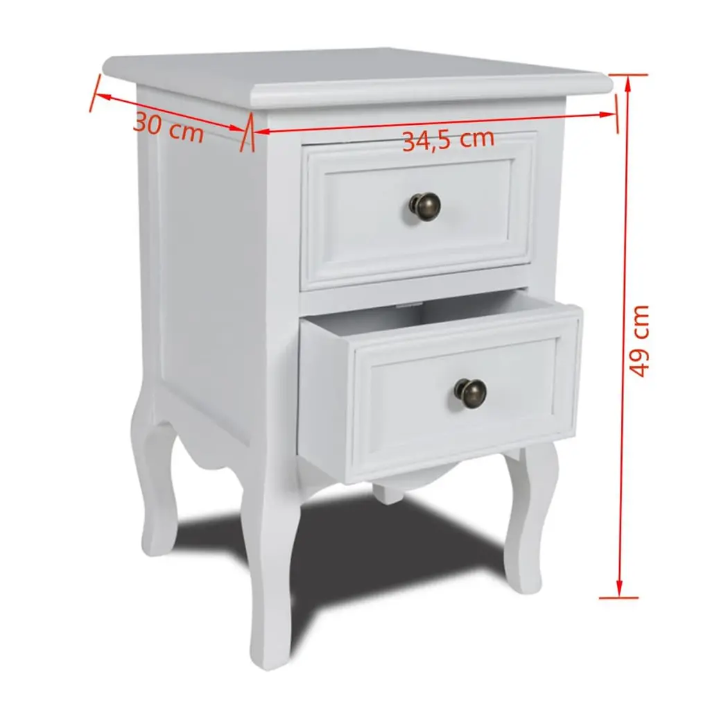 This vintage white bedside cabinet set elegantly combines aesthetic appeal with functional design, making it an ideal addition to any bedroom. Whether you're looking to enhance your decor or add practical storage solutions, these stylish nightstands serve well, offering a delightful place for essentials like lamps, books, or personal items, while effortlessly blending with various interior styles. Charming Vintage Design: The vintage style of these bedside cabinets gives off nostalgia while enhancing your bedroom's look. Their elegant finish fits in well with a range of decor, making integration a breeze. Ample Storage Capability: With two roomy drawers in each cabinet, there's loads of space for your bedside items. Keep clutter at bay and easily organize your essentials, making your space feel neater and more tranquil. Sturdy Construction: Built from tough MDF with solid pine legs, these nightstands are made to last. They're ready to withstand daily use while keeping their charm and usefulness for ages. Smooth Finishing: The painted surface doesn’t just look good; it’s also simple to maintain. A quick wipe with a damp cloth is all you need to keep these cabinets looking top-notch. Versatile Usage: Perfect for any adult bedroom, these bedside tables boost both style and function. With a design that suits various decor, they're a genuinely versatile pick for any household.