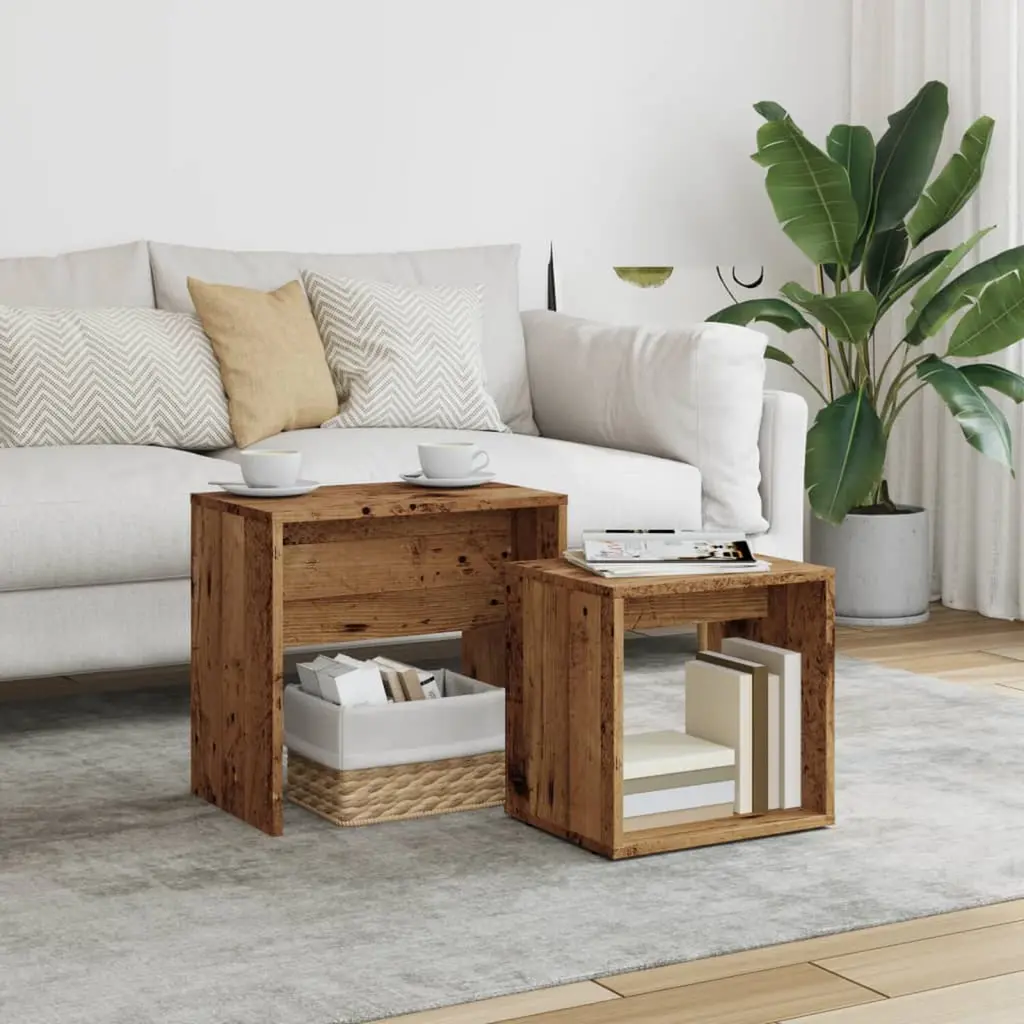 This nesting coffee table set is a smart way to jazz up your living space while mixing function with contemporary style. With two beautifully crafted tables in an old wood finish, they create a warm focal point in different settings like your living room, bedroom, or office, making them practical and versatile. Space-Saving Stacking: These tables can be stacked up for easy storage, making them ideal for smaller spots where every bit of space counts. Perfect for clearing room for guests or showcasing some stylish decor, this set adapts effortlessly to your needs. Contemporary Style: The sleek matte finish and modern edges give these tables a trendy touch that fits any decor. Their warm old wood look blends well with different styles, from modern to rustic, adding warmth and charm. Built to Last: Made from top-notch engineered wood, these tables aren’t just pretty but sturdy enough for everyday use. They're resistant to moisture, so spills won't ruin them, ensuring that they'll stick around in your home for ages. Versatile Usage: Great for serving coffee, as a side table by the sofa, or for extra surface space for books and decor, these tables are versatile in your home. They work well as nightstands or for hosting guests. Compact Dimensions: With a surface size of 17.7 in by 11.8 in, these tables offer plenty of space while keeping your area tidy thanks to their nesting design. They're light for easy moving around your living space.