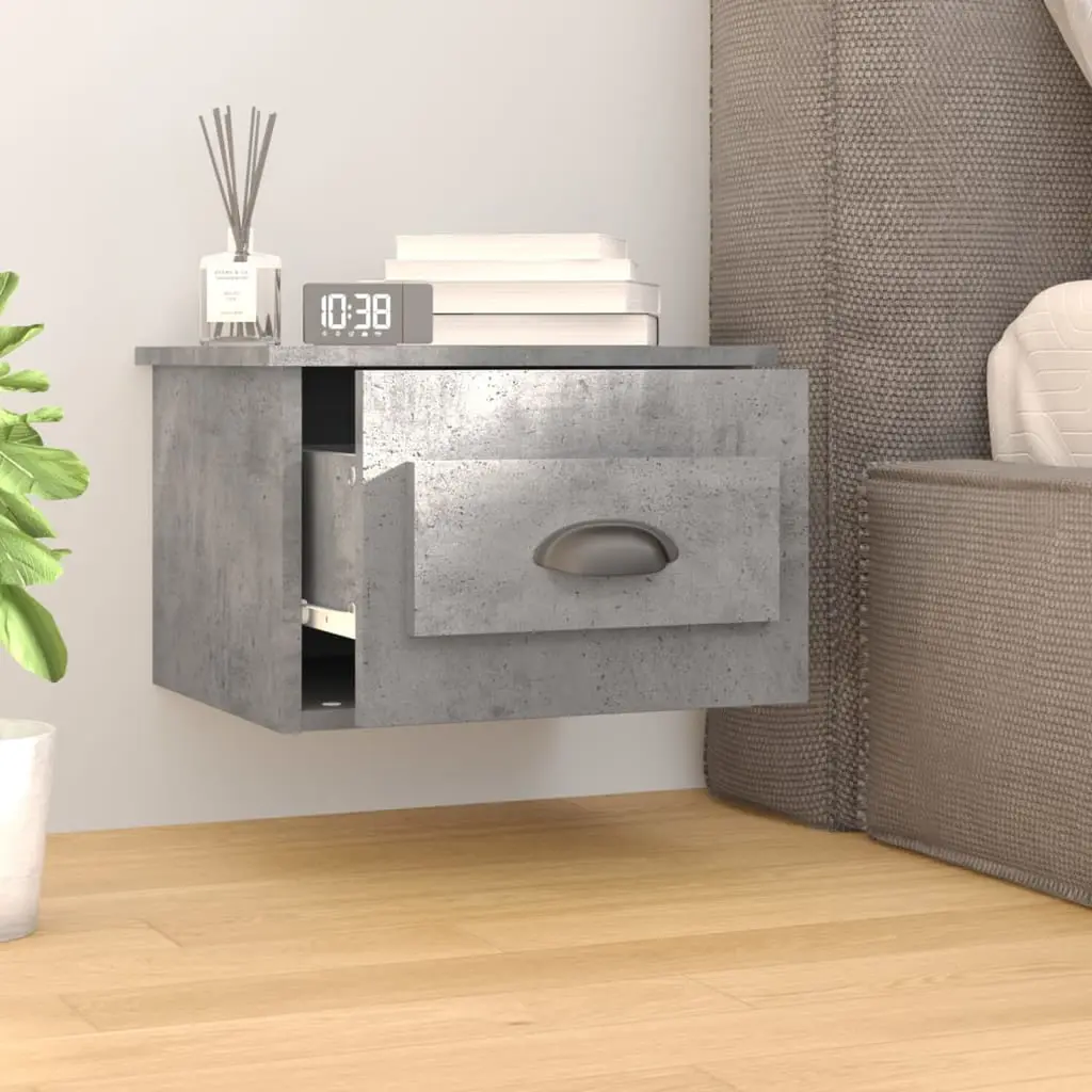 This wall-mounted bedside cabinet set offers a sleek, modern approach to bedside storage for any bedroom. Crafted from engineered wood with a concrete grey finish, it enhances the aesthetic of your space while providing a compact yet efficient storage solution for personal items. Floating Design: This clever floating design maximizes your floor space, looking great while being practical in tight spots.Modern Aesthetic: With its contemporary style and clean lines, this bedside cabinet blends in well with various decors, adding a classy touch to your bedroom.Ample Storage: The generous storage lets you keep your nighttime necessities, like books, lamps, and clocks, nicely arranged and easy to reach.Easy Maintenance: Engineered wood ensures this cabinet is sturdy and simple to clean. A quick wipe with a dry cloth keeps it looking fresh.Wall-Mounted Convenience: Great for anyone wanting a tidy appearance, this unit mounts securely to the wall, saving space and keeping it safe for kids.