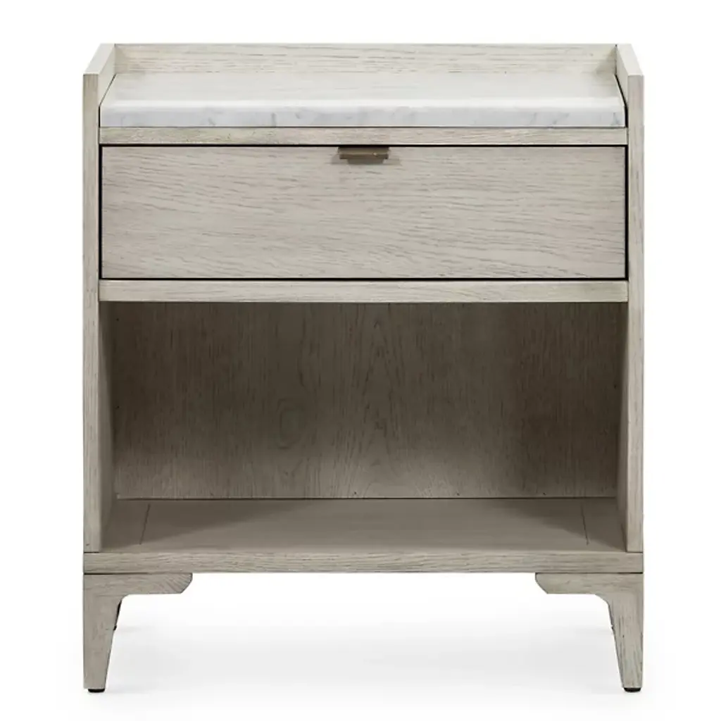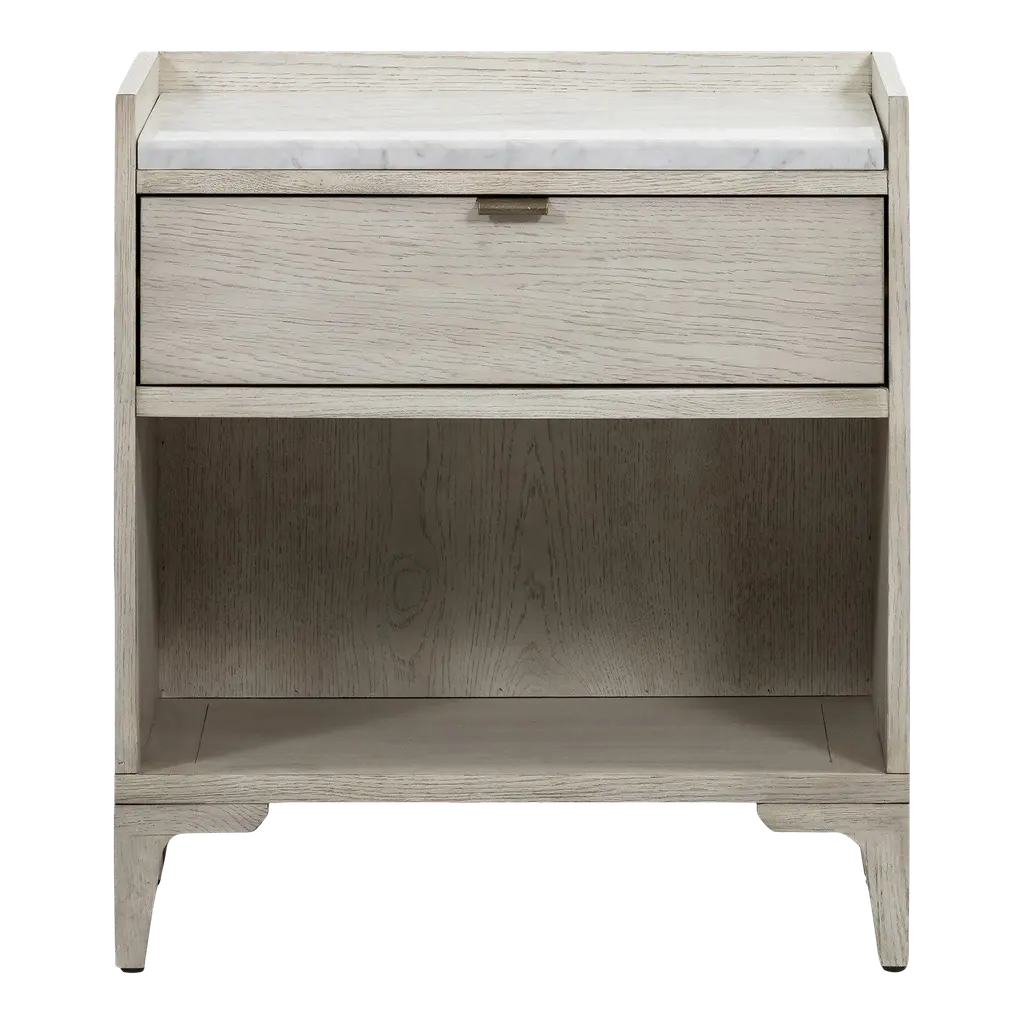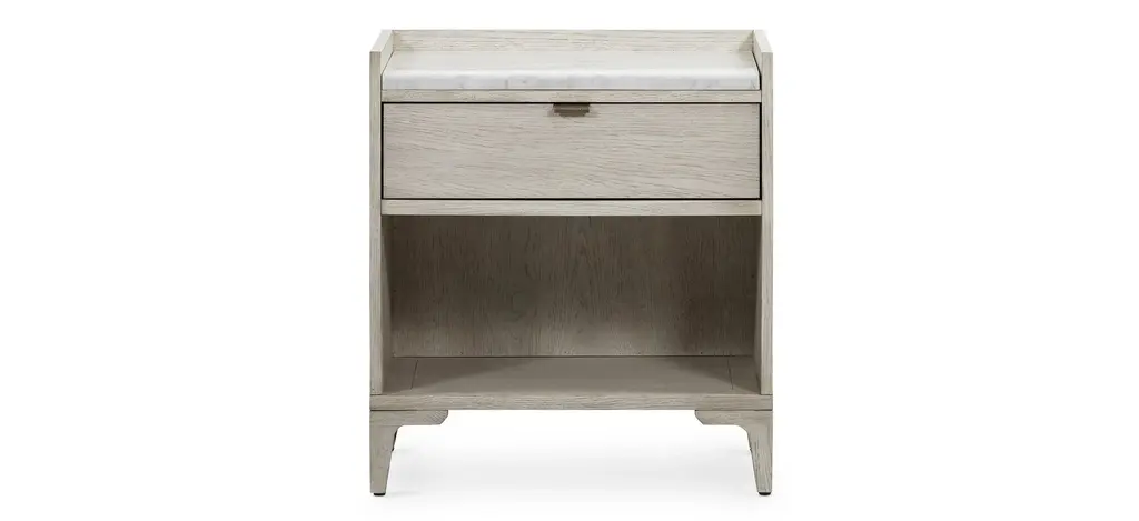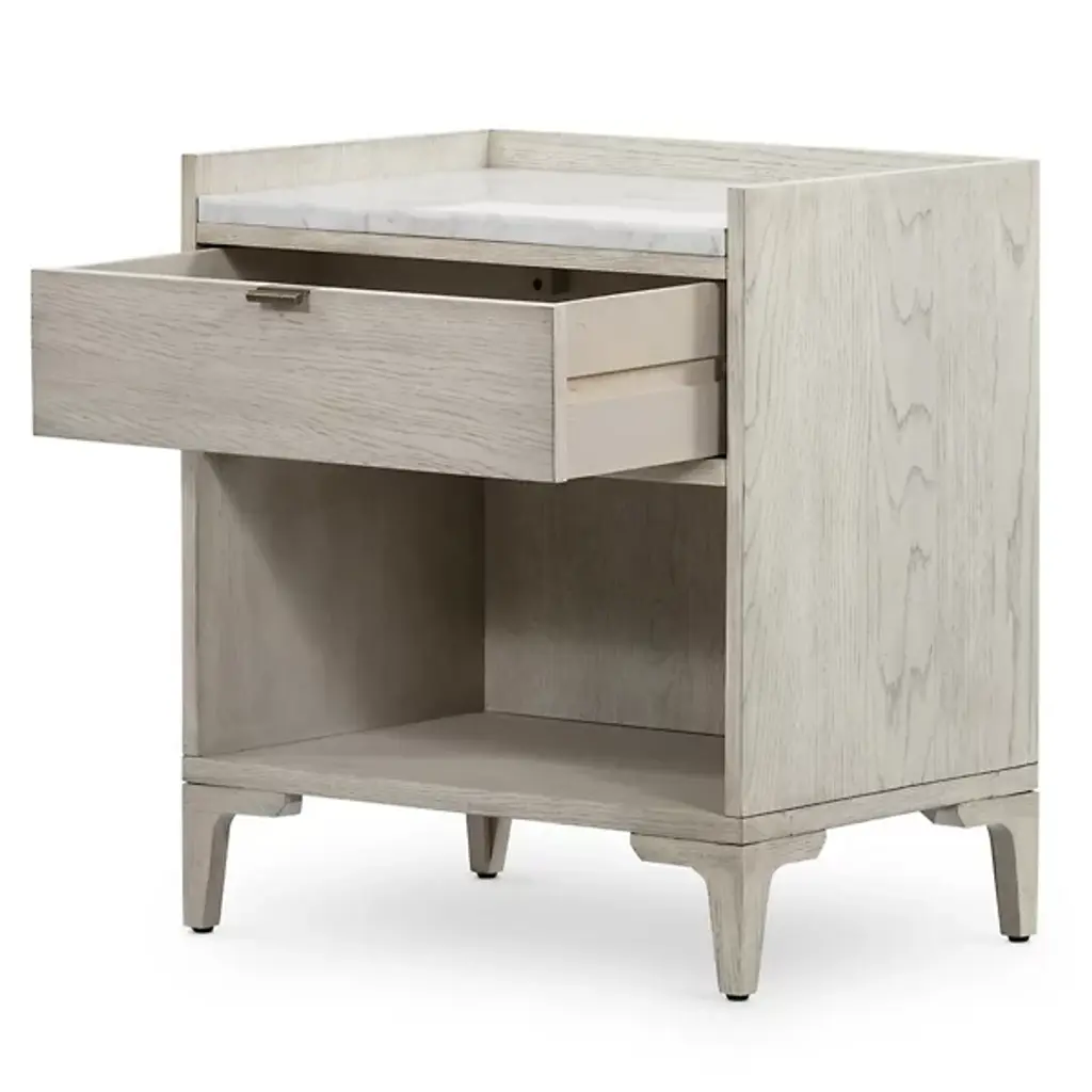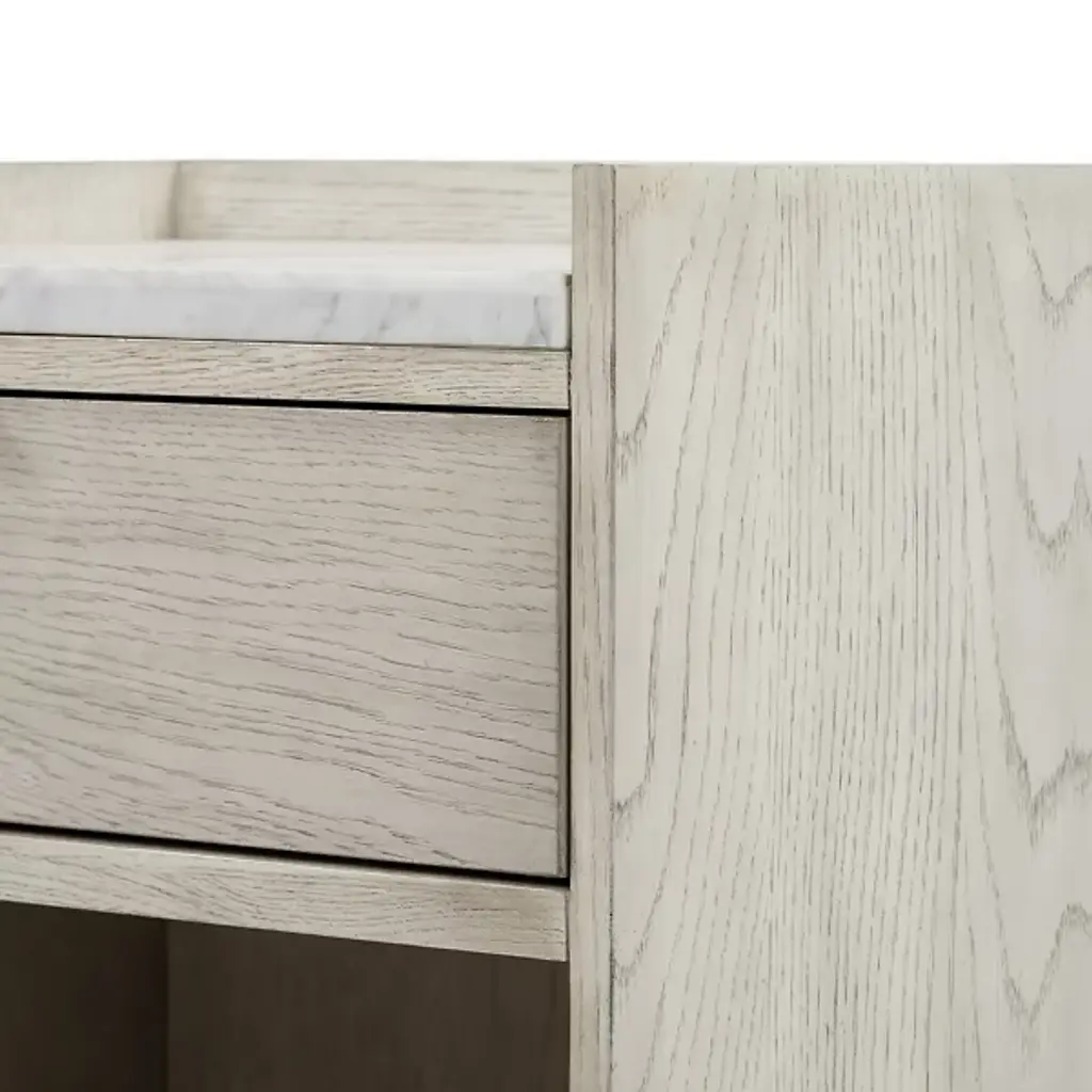 The Viggo Nightstand from Four Hands features timeless elegance. It is crafted from vintage white oak with a dry-hand finish for a light, airy aesthetic. A smooth white Italian marble top creates a sophisticated contrast, blending rustic charm with modern luxury. A spacious single drawer offers ample storage for bedside essentials, while the open lower shelf provides additional space for books or décor. This beautifully designed piece combines style and functionality, making it the perfect addition to any bedroom.