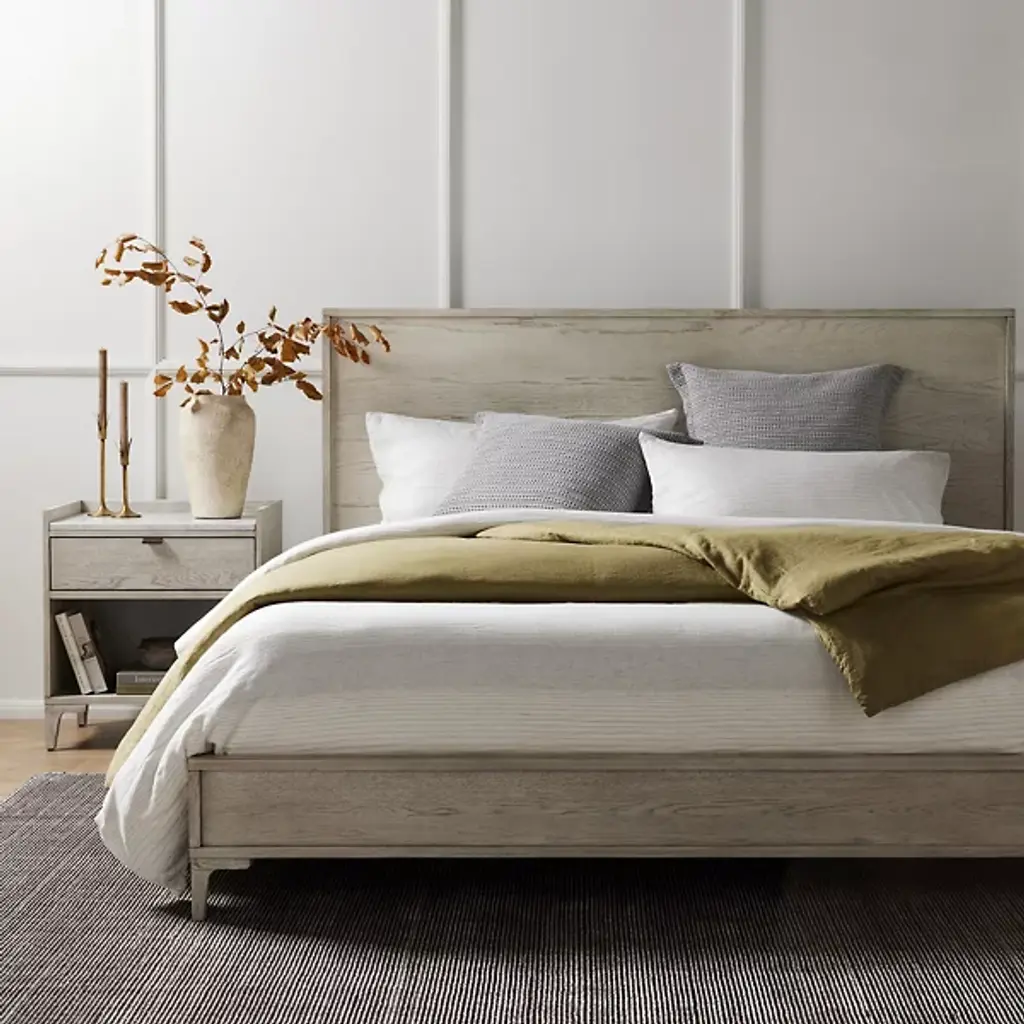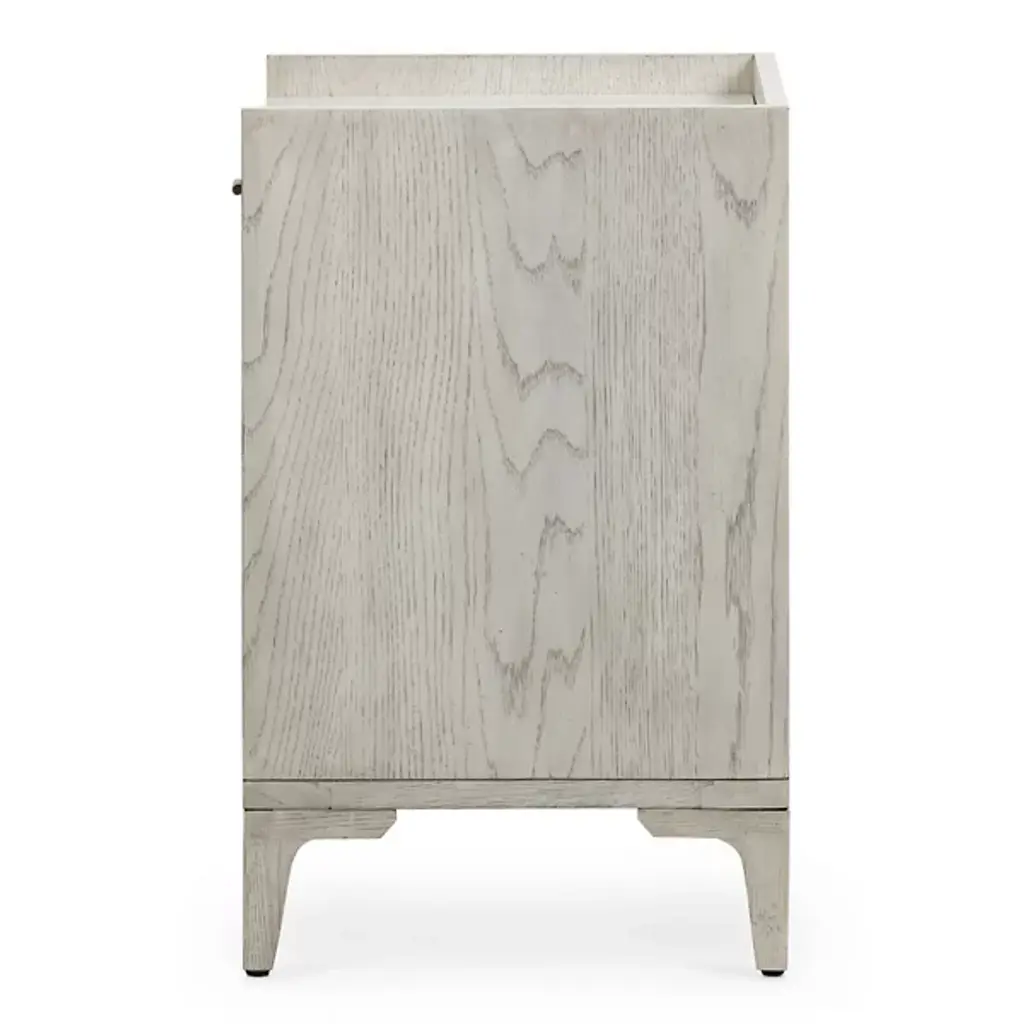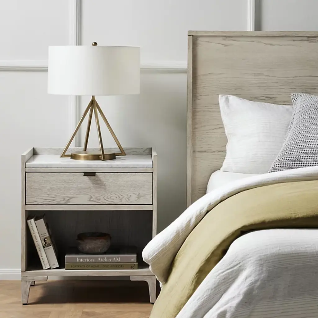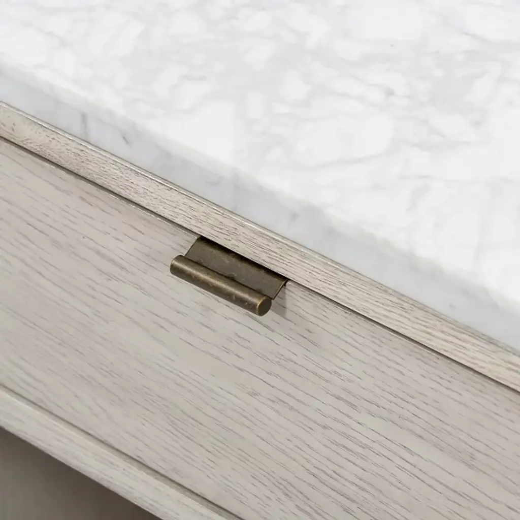 The Viggo Nightstand from Four Hands features timeless elegance. It is crafted from vintage white oak with a dry-hand finish for a light, airy aesthetic. A smooth white Italian marble top creates a sophisticated contrast, blending rustic charm with modern luxury. A spacious single drawer offers ample storage for bedside essentials, while the open lower shelf provides additional space for books or décor. This beautifully designed piece combines style and functionality, making it the perfect addition to any bedroom.