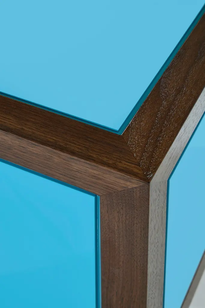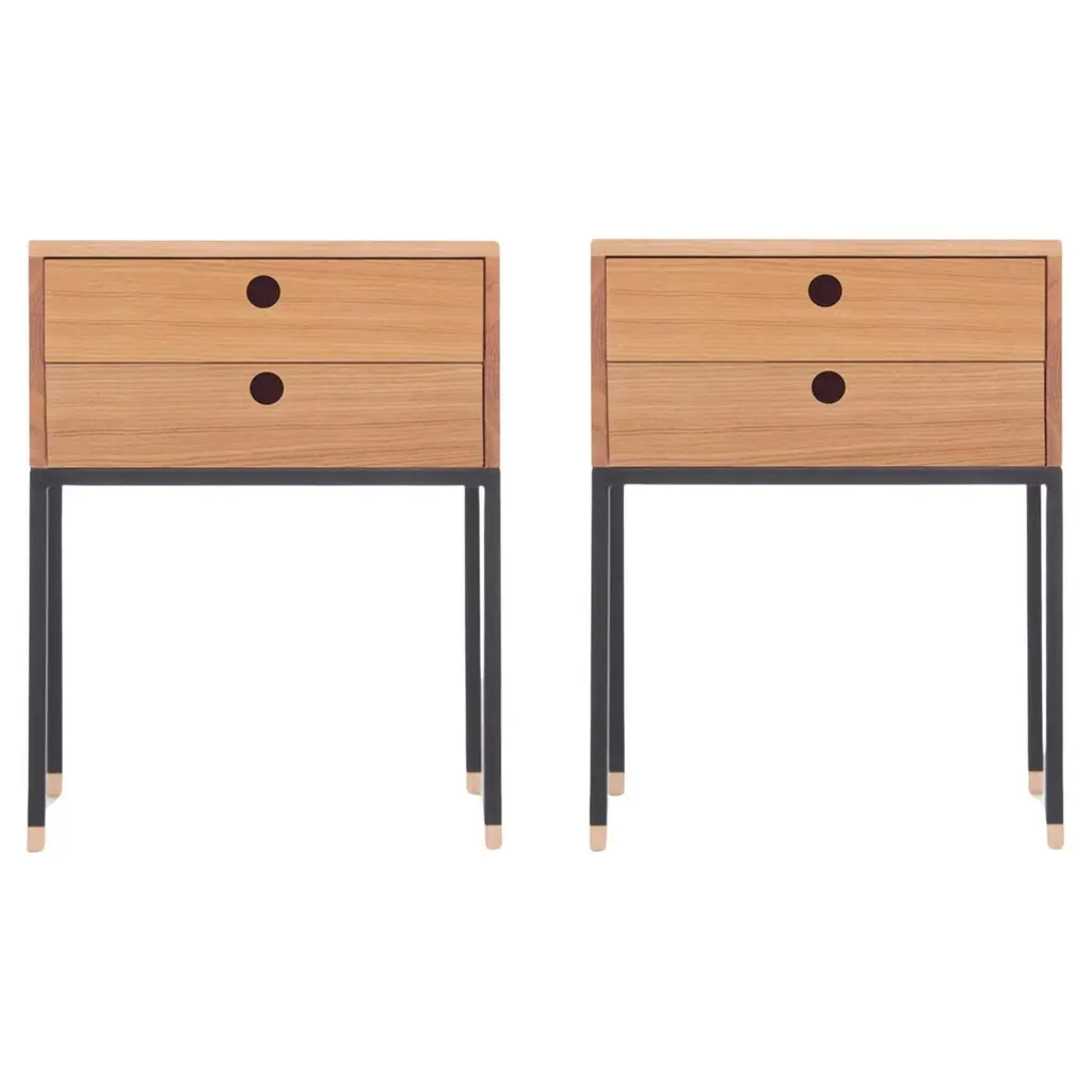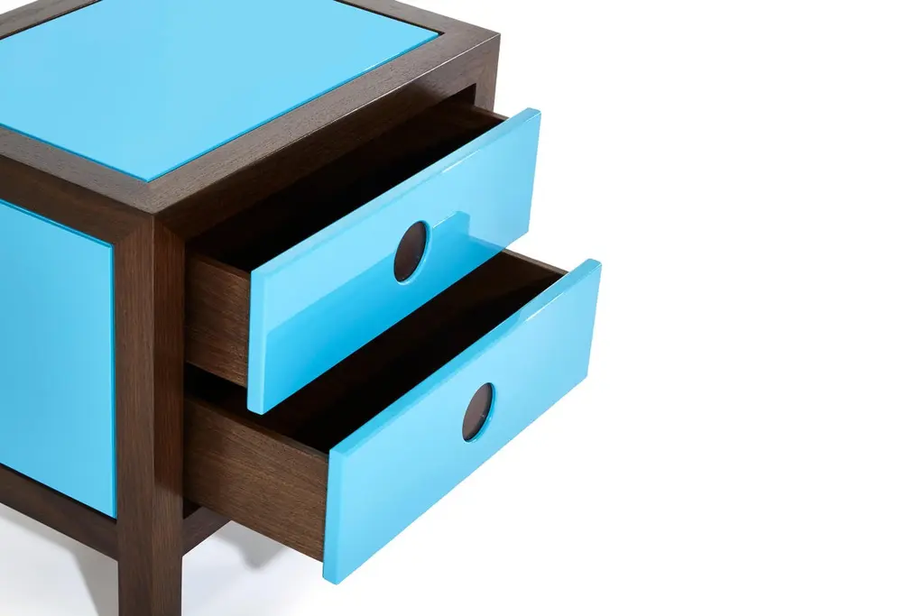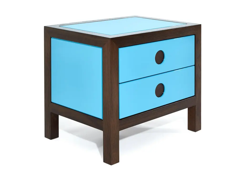 Mixing midcentury shapes with glossy lacquer, richly stained walnut, and inset circular walnut details, these single push to open drawer nightstands are the perfect mix of function and high style.