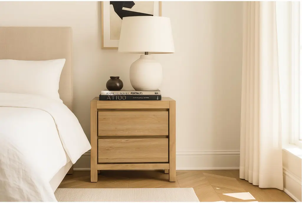 Enhance your bedroom with the Voyage Natural Wood 2-Drawer Nightstand With USB by Nate Berkus + Jeremiah Brent. This modern nightstand set features a sun drenched oak finish, bringing a warm and inviting touch to your space. Crafted from knotty white oak veneer and solid hardwood, these nightstands offer both durability and style.