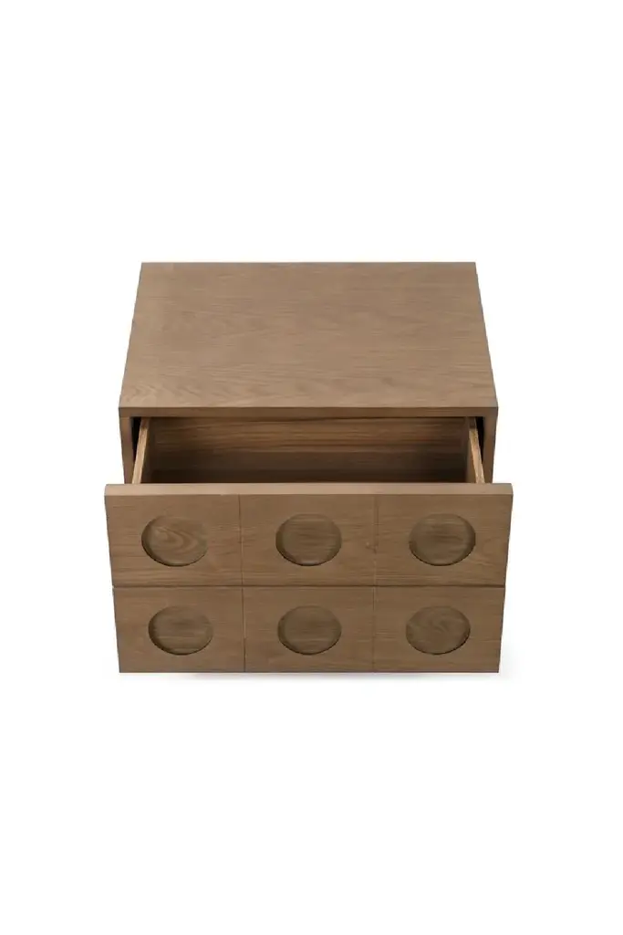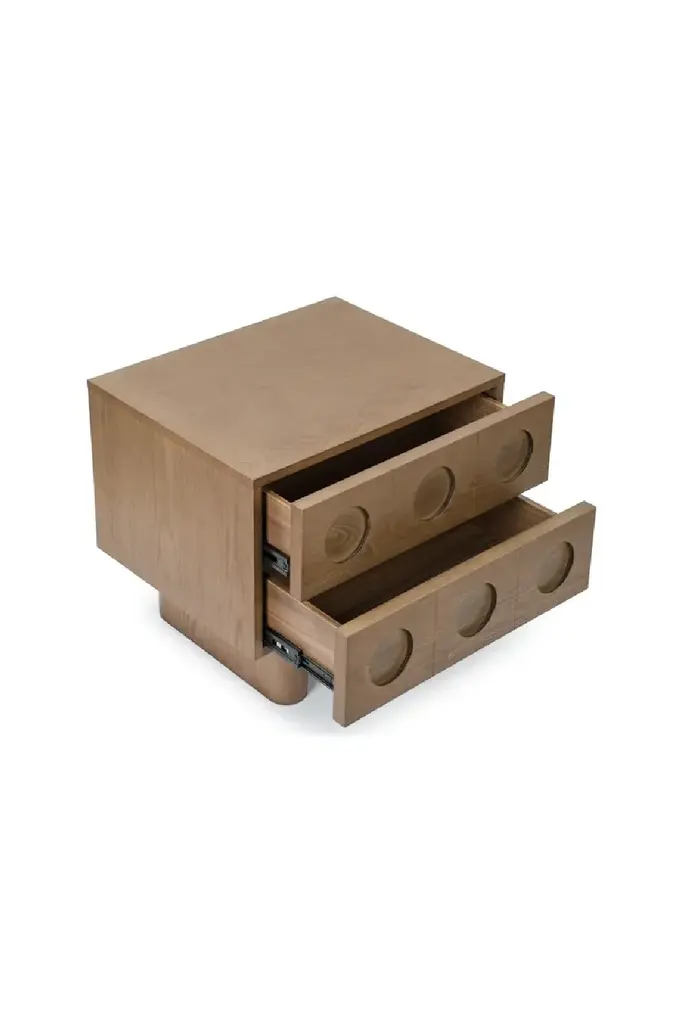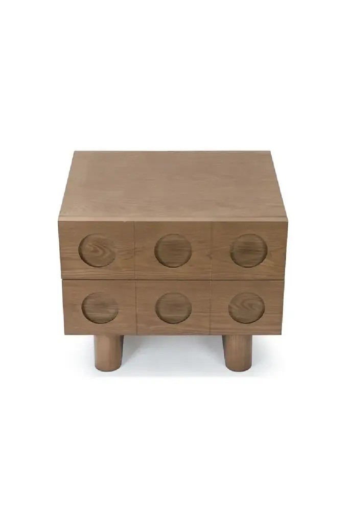 Inspired by vintage apothecary furniture, the Cooper Walnut-Stained 2-Drawer Bedside Table by NV Gallery brings a sculptural, artistic dimension to bedroom or living room spaces. Its distinctive design is marked by a series of circular door fronts, each one subtly functioning as a handle. These thoughtful details evoke a retro aesthetic while offering clever, concealed storage. Crafted from richly grained wood, Cooper's natural material adds warmth and timeless character to any interior style.