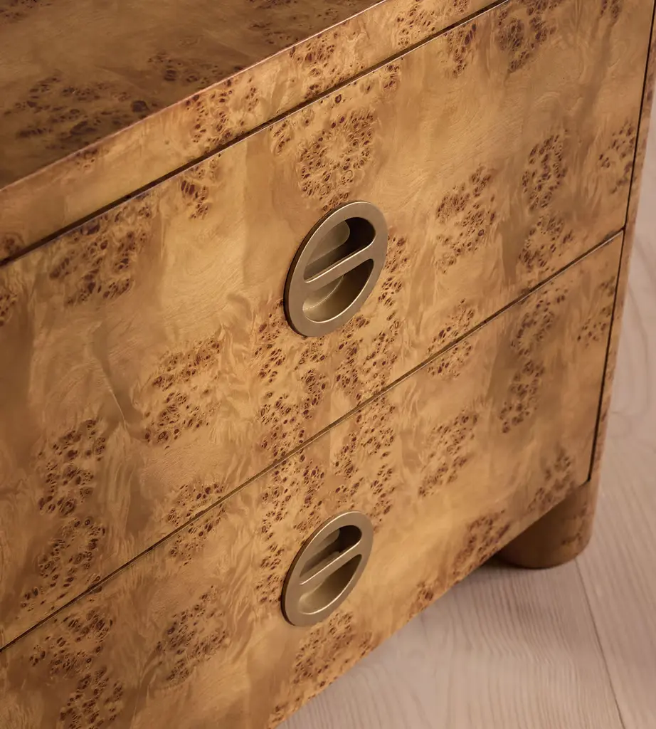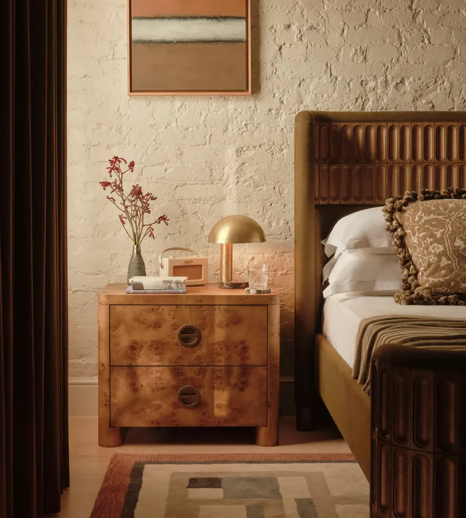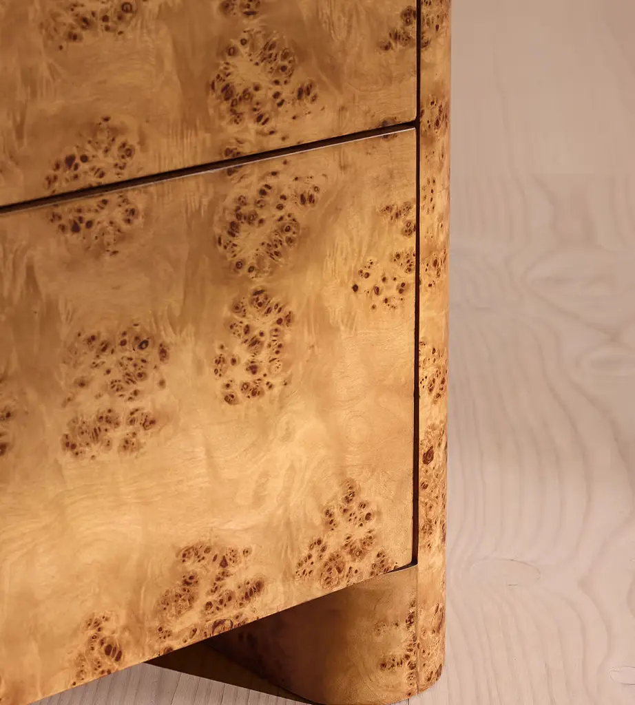 Book-matched burl veneer sheets are chosen to mirror their exact position in the tree, creating symmetry and enhancing a clean silhouette. Inspired by Soho House Hong Kong, the Warwick bedside table is made from book-matched burl veneer with smoothed edges. Each sheet is carefully selected to mirror its exact position on the tree, creating a clean, symmetrical finish.