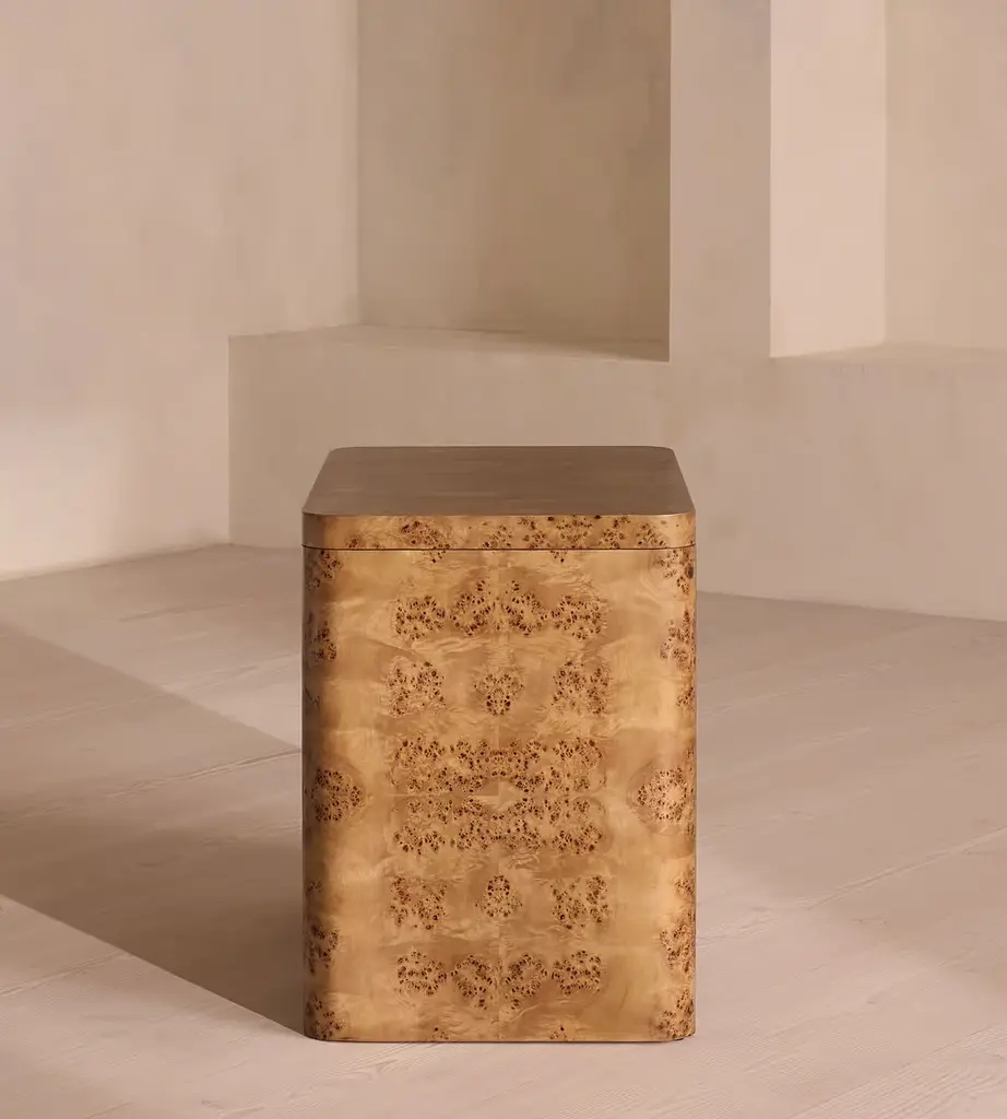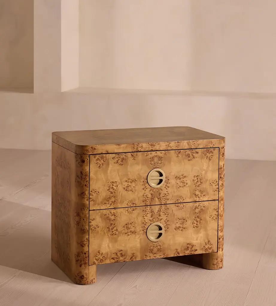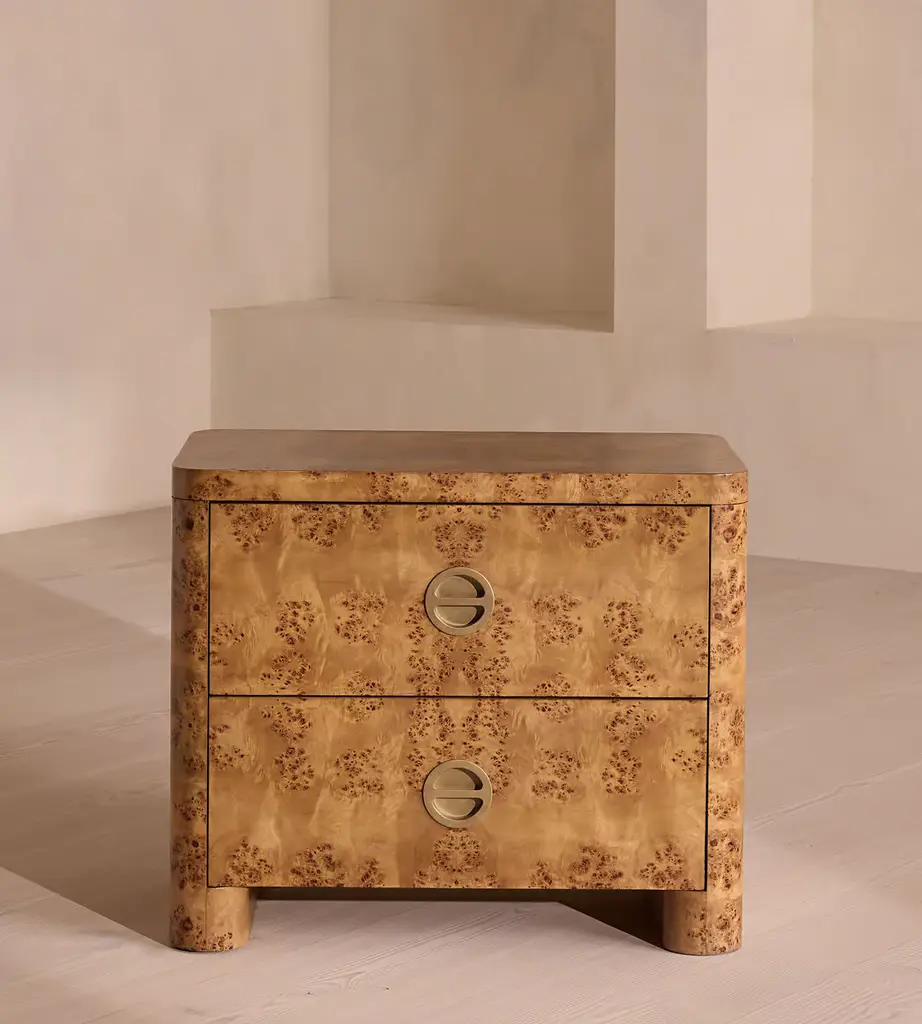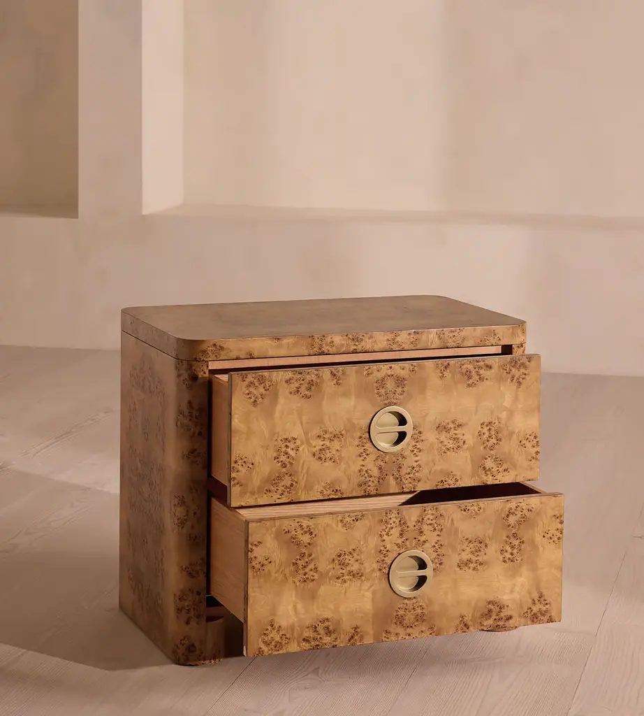 Book-matched burl veneer sheets are chosen to mirror their exact position in the tree, creating symmetry and enhancing a clean silhouette. Inspired by Soho House Hong Kong, the Warwick bedside table is made from book-matched burl veneer with smoothed edges. Each sheet is carefully selected to mirror its exact position on the tree, creating a clean, symmetrical finish.