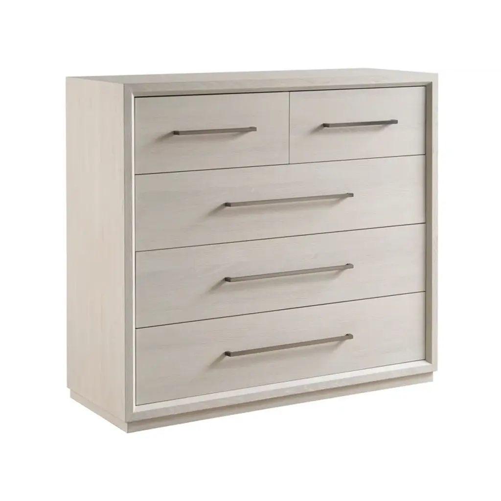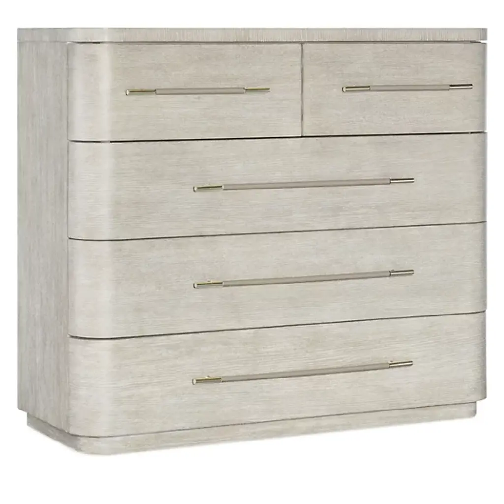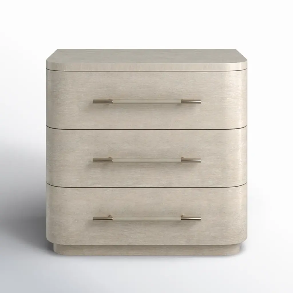 Born from passion with incredibly crafted aesthetic details, the Seiche woven wave nightstand's captivating lines and sublime curves promise a new level of interior expression. Grasscloth wrapped around three bleached oak drawers with custom hand-cast hardware in an eclectic mix of materials that capture a dazzling sense of organic movement and form.