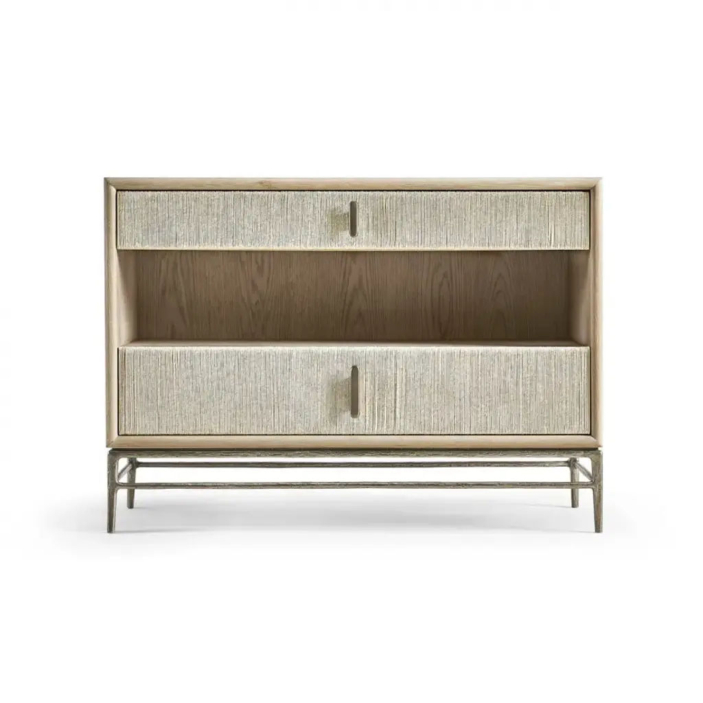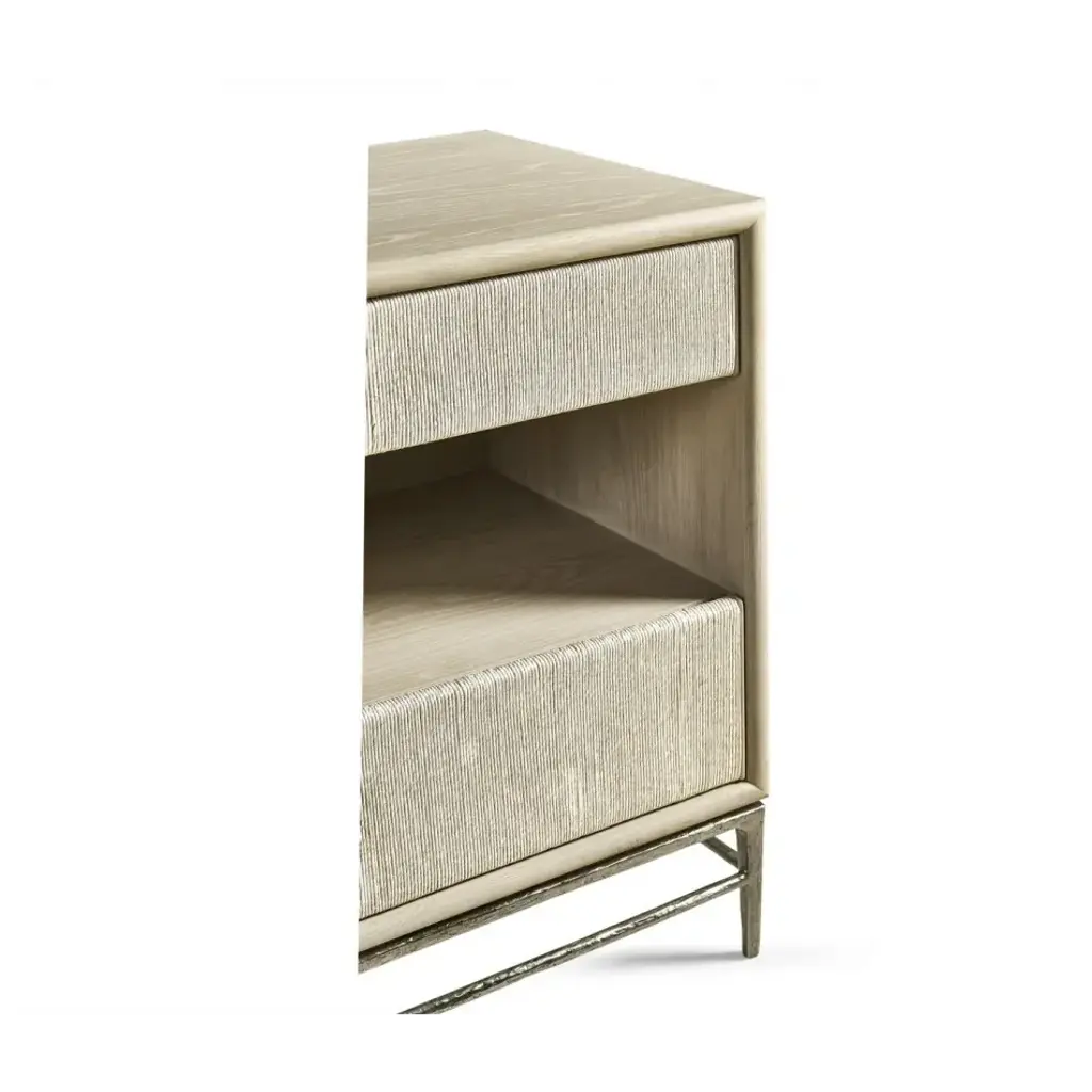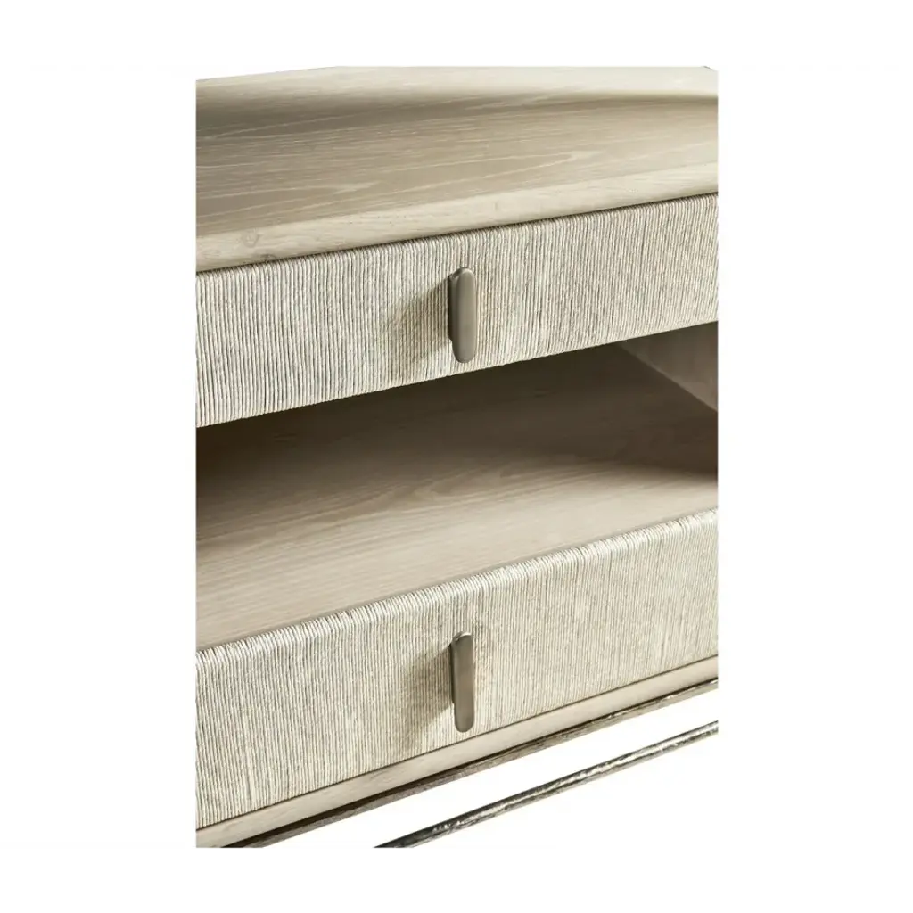 001-1-802-CRD (36.125") & 001-1-803-CRD (42") The stylish design of Jonathan Charles' Clapotis Nightstand, replete with two Danish Cord-wrapped drawer fronts adding style to the classic tone and feel of contemporary vision without shortcuts. A Cast Stainless Steel base and vertical hardware handcast in Jonathan Charles' foundry are finished in elegant Satin White Brass for a luxurious and sleek effect befitting refined and eclectic spaces.