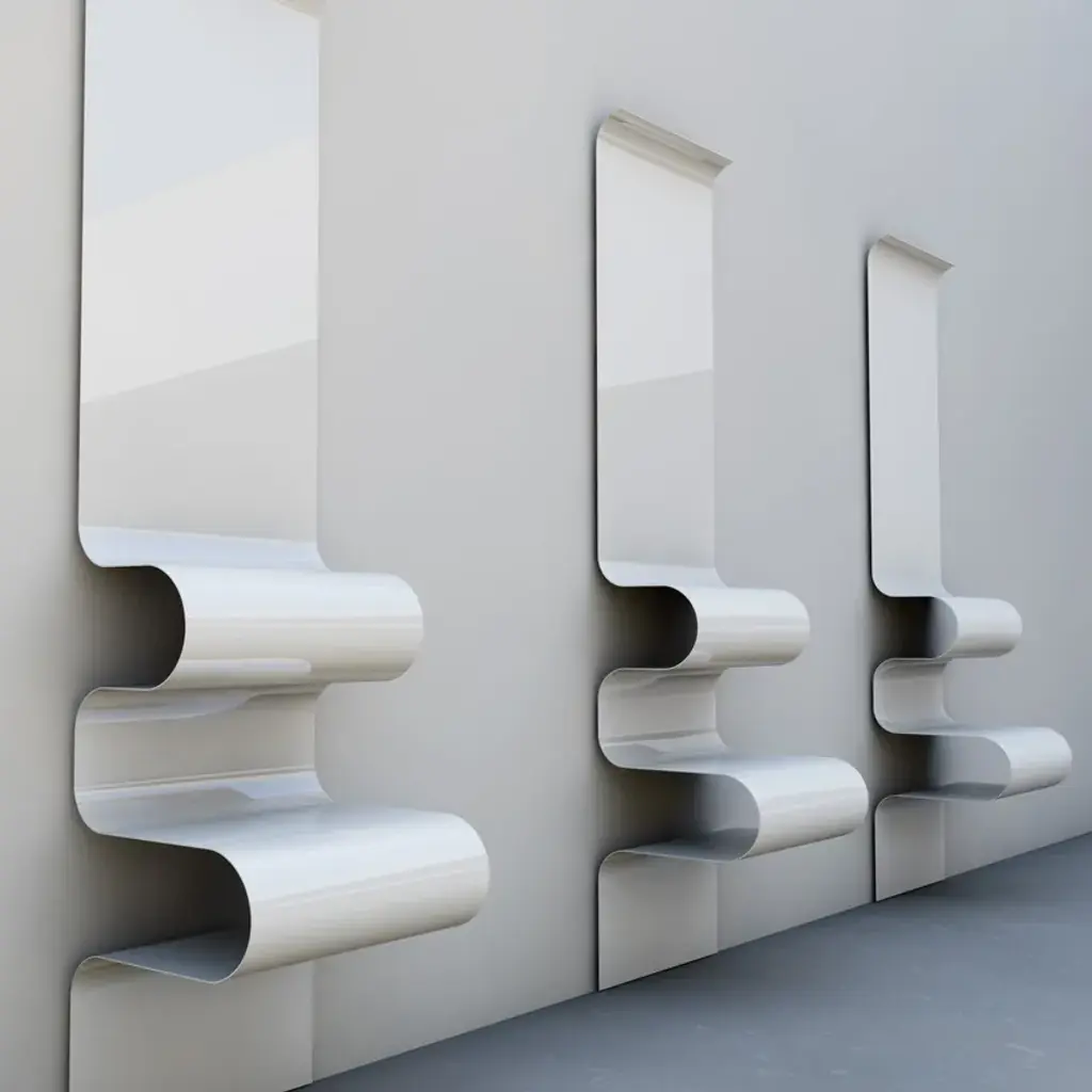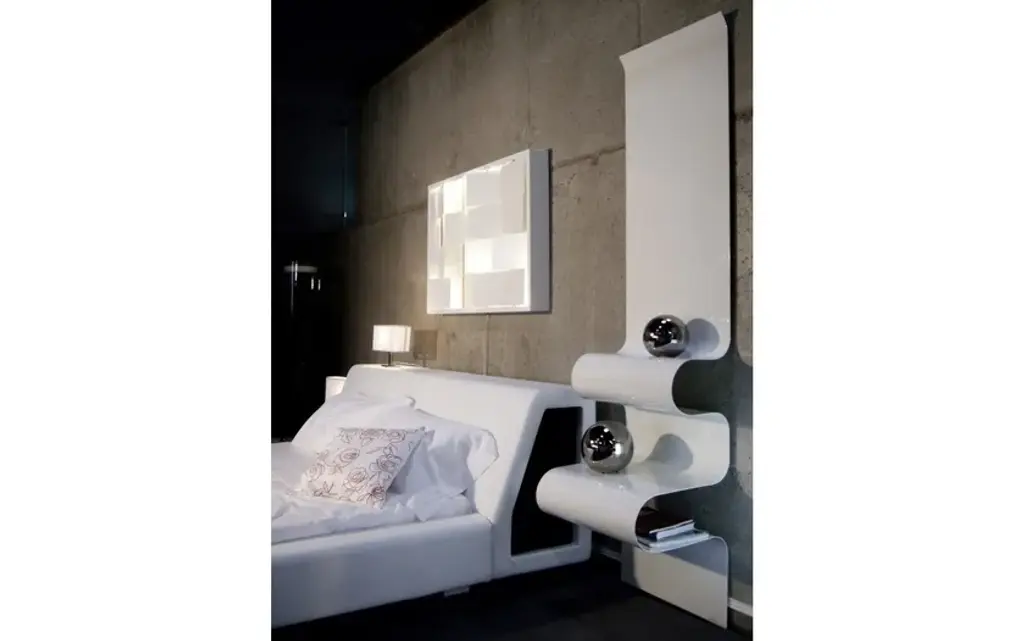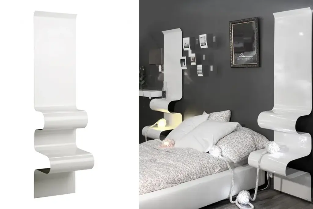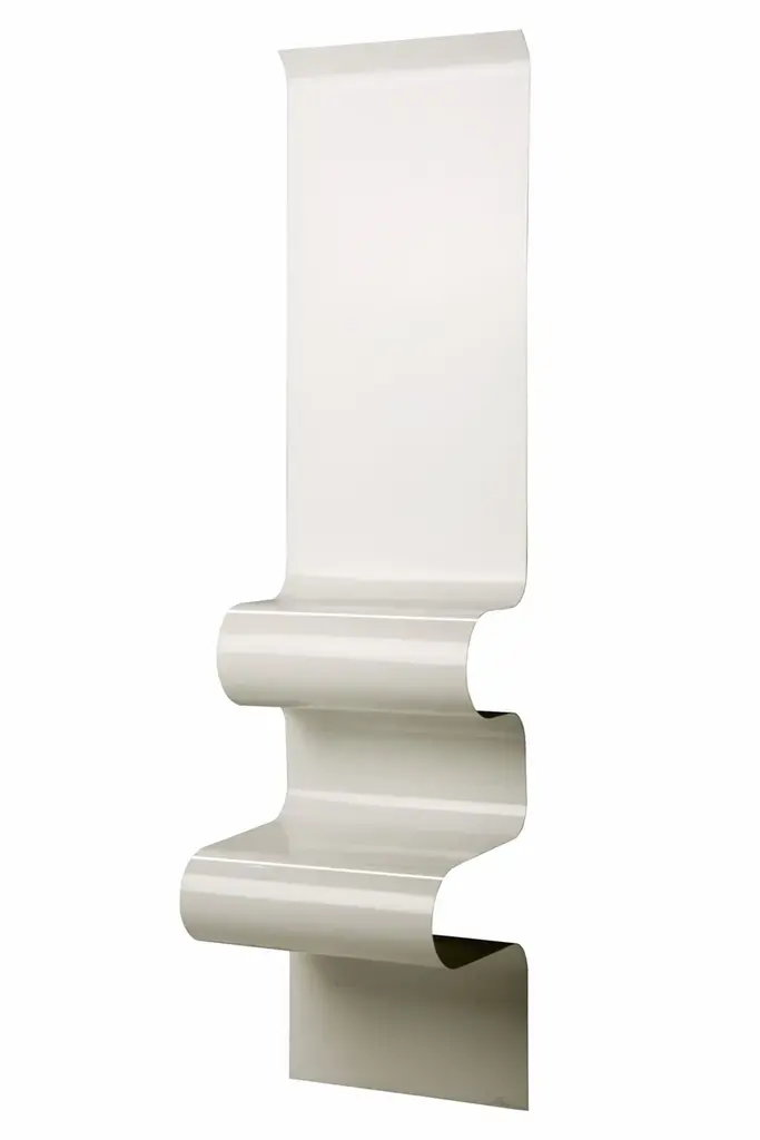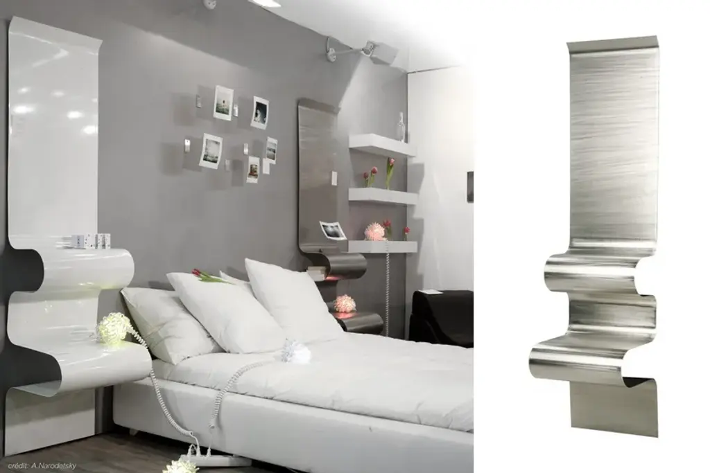 Powder coated aluminium Bookshelf, low table, bedside or small furniture. Range of shelves in powder-coated aluminium or silver aluminium, also available customized, in all colours.Julien Vidame has built his own bending machine to get that shape because manufacturers could not. Waves are studied to receive objects, books, lights, above or inside, which offers a hiding game. They are much functional (strong) because there's a lot of space, and a flat surface to avoid objects to slide, as we can expect. Entirely pured, they bring out the impression of movement in a room. It's extremely simple, the setting up is made in 15min with its movable racks, become invisibles and peel off the wall 1cm this waved line.The range is studied to be stacked, the bookshelf above the small one goes from the floor to a standard ceiling high. This product works well for interior designers who wish to fill a wall with a deep and forceful concept, and functional too.