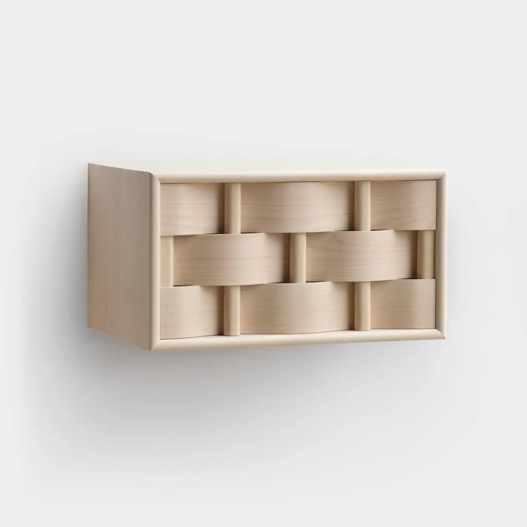 Weave bedside table Bedside table, made of solid birch wood and laminated birchveneér or solid oak wood and oak veneér. Modern yet classic, bold yet modest the bedside serves as a great example of Scandinavian contemporary design. Designed by Lukas Dahlén.The minimal yet expressive bedside is inspired by the most common kind of wood and weed weaving the Weave bedside represents an enlarged version of the technique of weaving something soft around a more stable structure. The top and bottom plane of the cabinet is held together by sticks kept together like a Windsor chair. The bedside comes in two standard sizes (W45 and W60) and these standard finishes: Birch with natural oil, Birch with black oil, Oak with natural oil, Smoked oak with natural oil. The bedside can also be ordered in custom sizes and finishes.