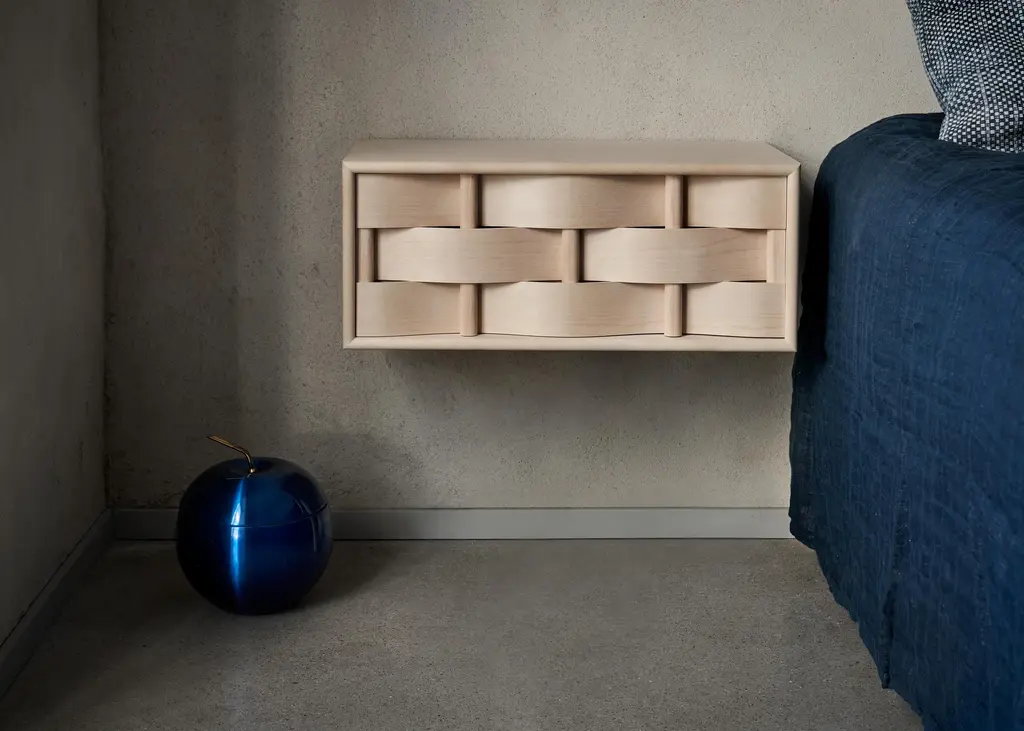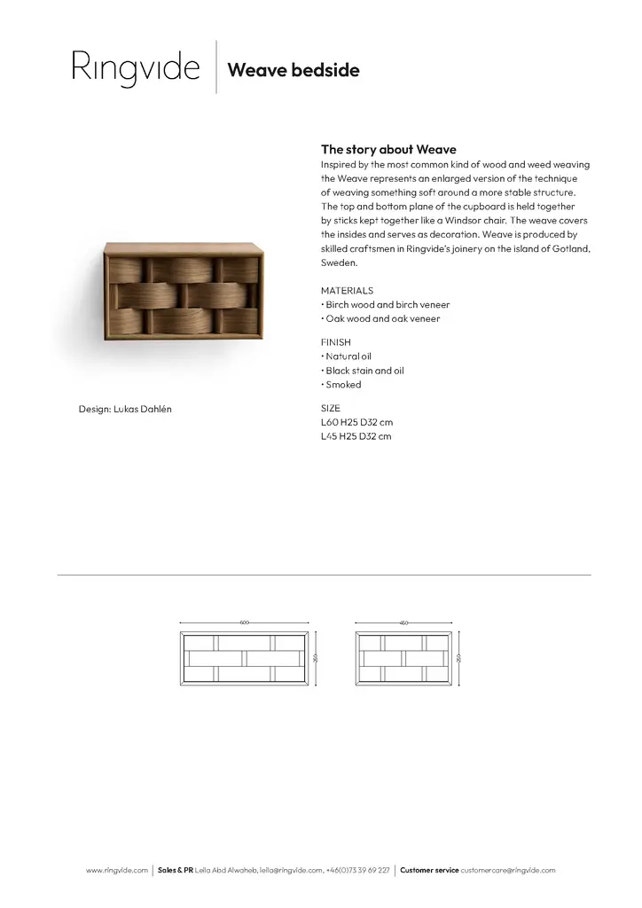 The weave series are modern yet classic, bold yet modest and serves as a great example of scandinavian high quality design. the weave bedside is made of solid birch wood and birch veneér. Inspired by the most common kind of wood and weed weaving the weave bedside represents an enlarged version of the technique of weaving something soft around a more stable structure. The top and bottom plane of the cabinet is held together by sticks kept together like a windsor chair. the bedside table is made in two standard sizes in solid birch and oak wood. standard finishes/woods: birch natural oil, birch black oil, oak natural oil, oak smoked. standard sizes: l45 h25 d32 cm / l60 h25 d32 cm signed by maker,labeled by maker,imprinted by maker,labeled with country of origin