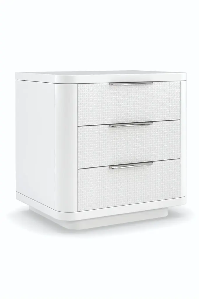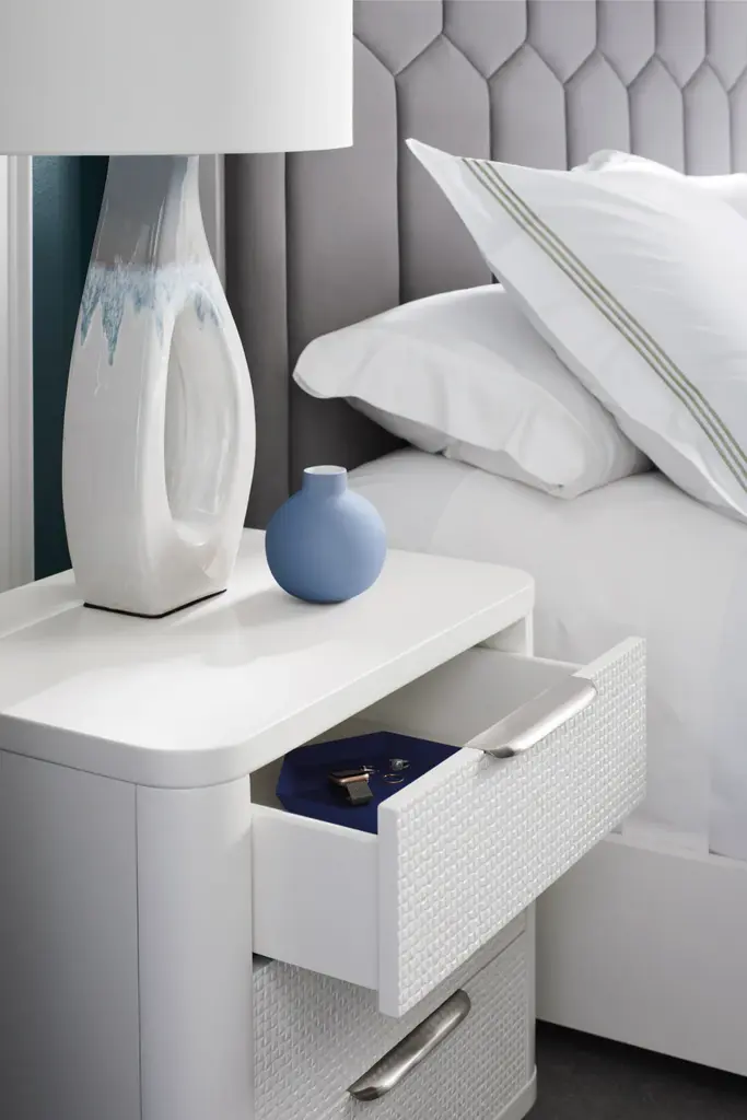 Quietly captivating in a Cloud White finish, this nightstand features rounded edges and a welcoming texture. Carved drawer fronts add tactile appeal with a woven mini-tile motif, accentuated by finger-cup pulls in Satin Nickel. A USB port and cutouts in the back let you charge devices and keep cords out of sight. Style with our In Touch bedside table and Loving Touch dresser to create a calming retreat for yourself or your guests.Download Assembly Sheet