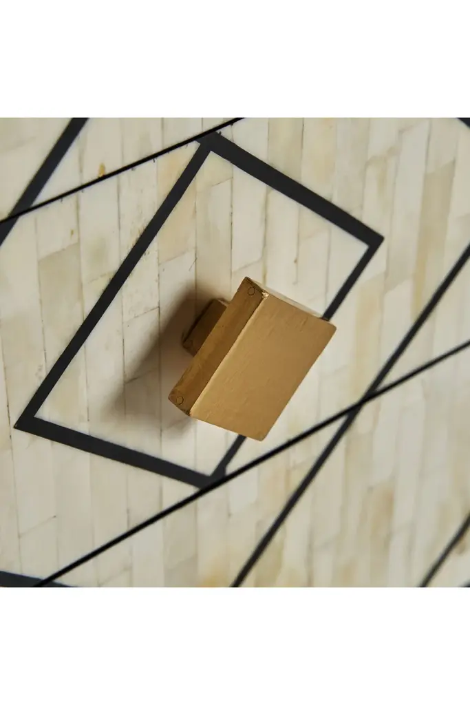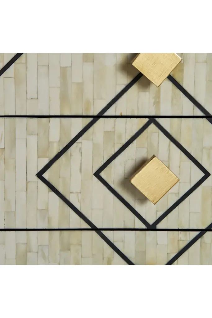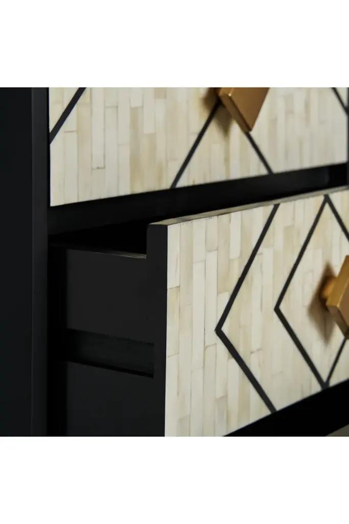 Immerse yourself in luxury with the Charmes Nightstand from Vical Home. Featuring a distinctive bone front and a sturdy iron frame in black, white and gold, this nightstand is the epitome of elegance. Its size makes it both practical and stylish, ensuring that every corner speaks of sophistication.