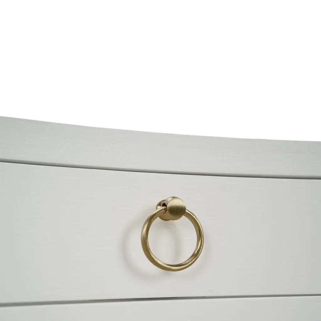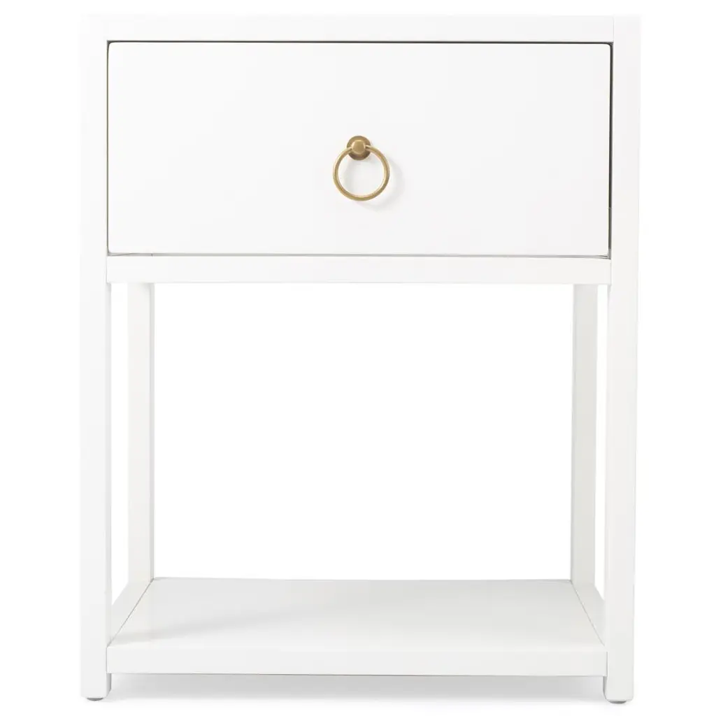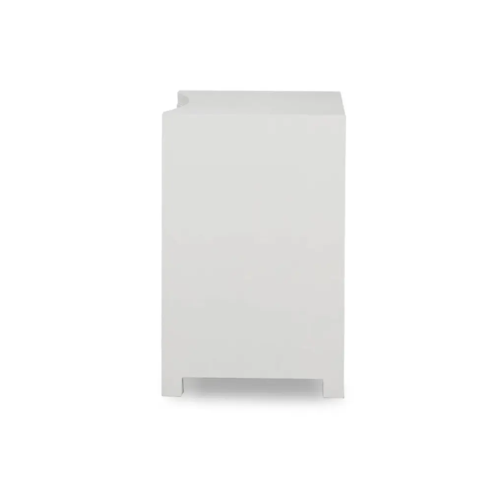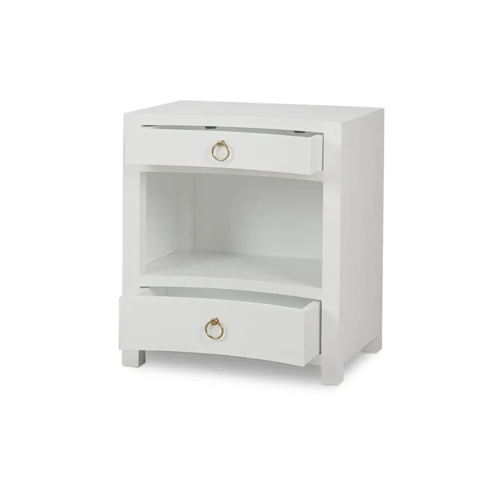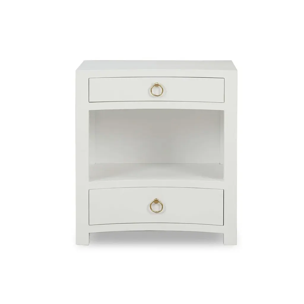 This elegant piece features a sleek, minimalist design wrapped in true white linen, exuding a calm and serene aesthetic. The subtle texture of the linen finish enhances its modern appeal, while the two drawers provide ample storage for your bedside essentials. Adorned with chic gold ring pulls, this bedside table effortlessly combines functionality with refined elegance, making it a standout piece in any room. Dimensions: 25" W x 18" D x 28" H