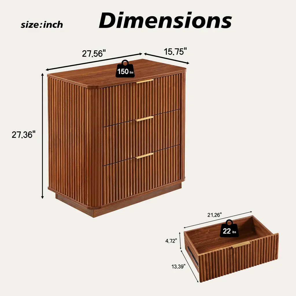 Integrating curved table corners with curved wave enhances the aesthetic of the space. Enough storage to accommodate some daily necessities such as cosmetics, books. Easy to clean. Waterproof desktop, can immediately dry off water without leaving any traces. Product information Product Type 3 Drawers Dresser/Nightstand Product Size 27.6''W x 15.8''D x 27.4''H Top Weight Capacity 150LBS (uniform distribution)