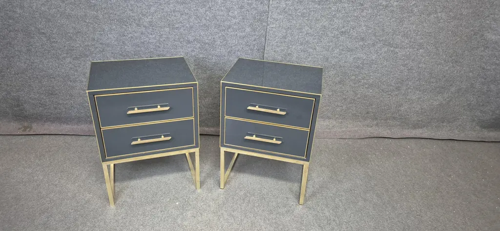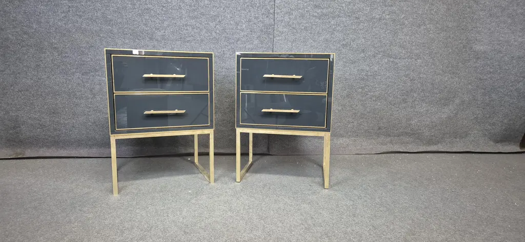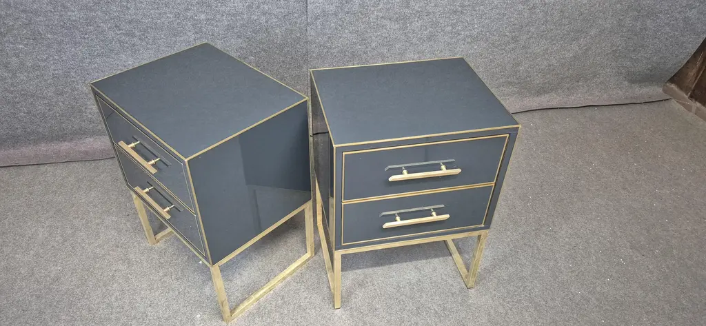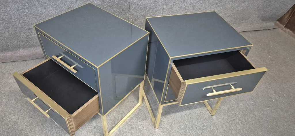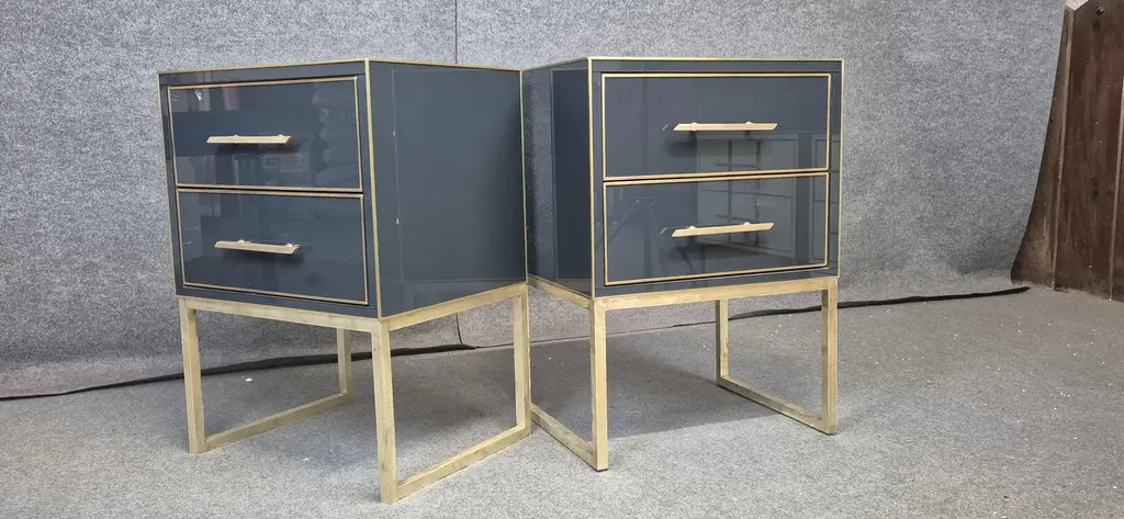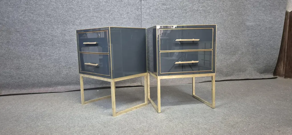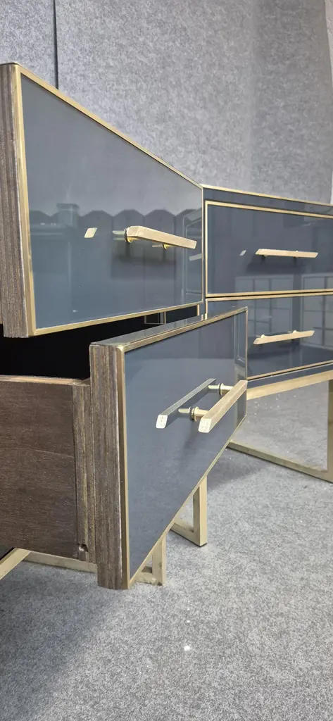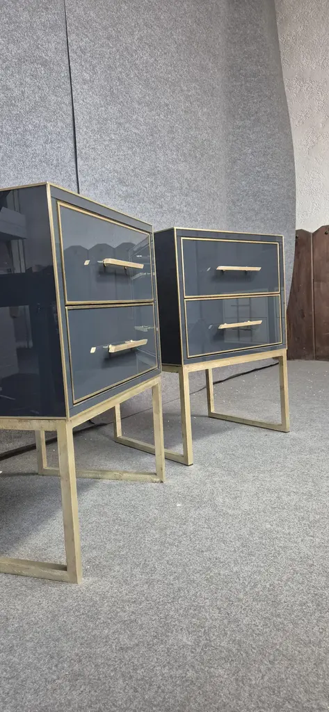 Pair of solid wood bedside tables with grey Murano glass, brass edges and handles: an example of Italian craftsmanship and mid-century modern style. Each bedside table features a smooth grey Murano glass surface, elegantly framed by hand-finished brass edges and handles. The solid wood frame ensures durability, while the interior of the two drawers is lined with luxurious black velvet, adding a touch of sophistication. These bedside tables are entirely handmade in Italy, using techniques such as hand painting, carving and welding, which make each piece unique. The combination of Murano glass, brass and velvet creates a harmonious and refined look, perfect to elevate any bedroom. Presented at Milan Fashion Week, this pair of bedside tables stands out for its artistry, quality materials and timeless design. Labeled by Maker