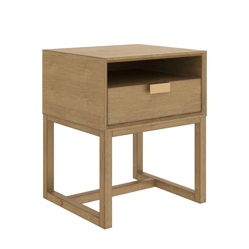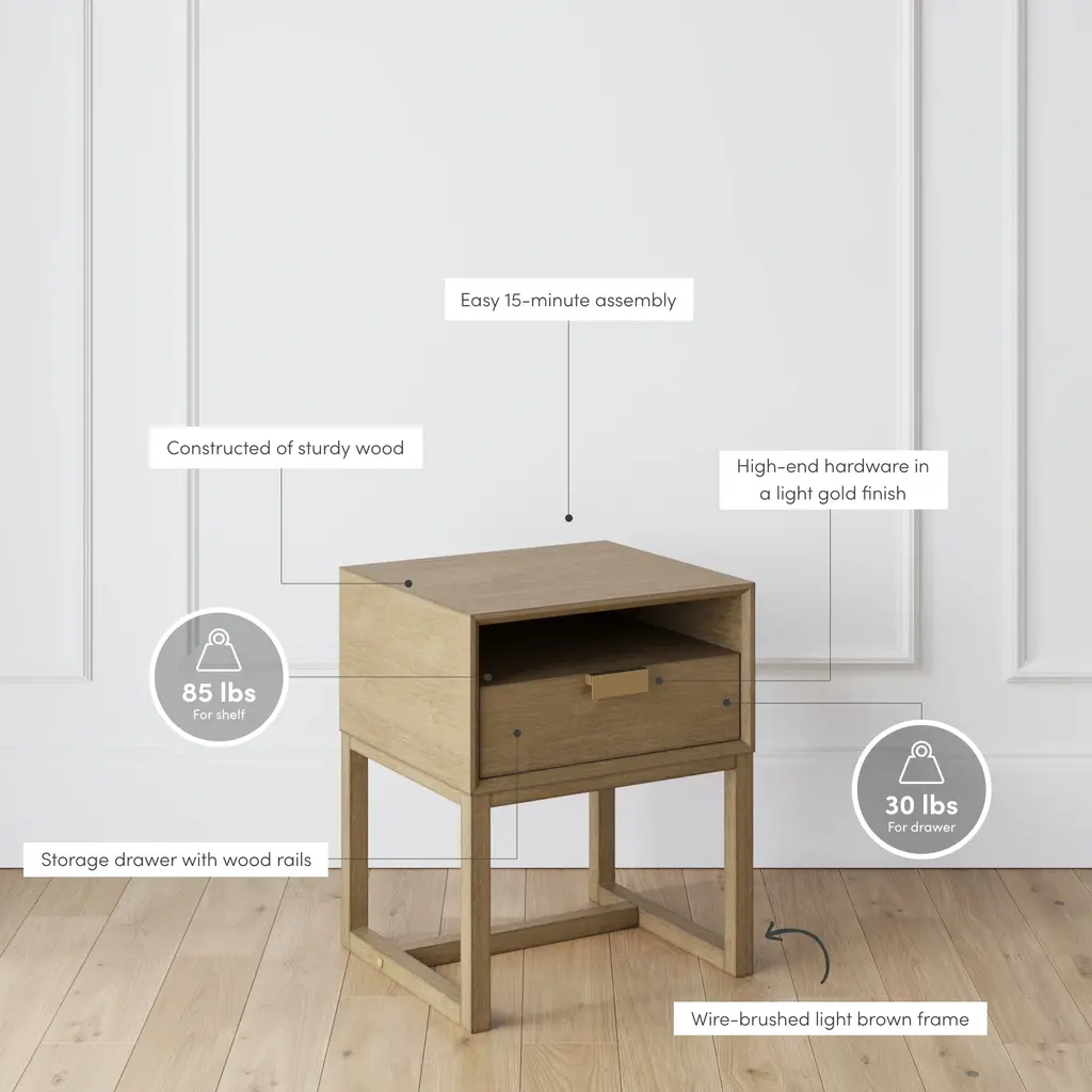 Complete your dream living room or bedroom with the stunning Luke side table. Crafted to last with a sturdy wood construction, Luke features a wire-brushed light brown body and contrasting pale gold metal drawer handle that brings a touch of glam to any space. Choose what to display or what to hide with its pull-out drawer and open cubby. The drawer is the perfect storage solution for electronics, books, or other necessities (like late night snacks), while the cubby is the perfect resting spot for your phone or glasses. Simple and sweet, Luke is a modern farmhouse essential!