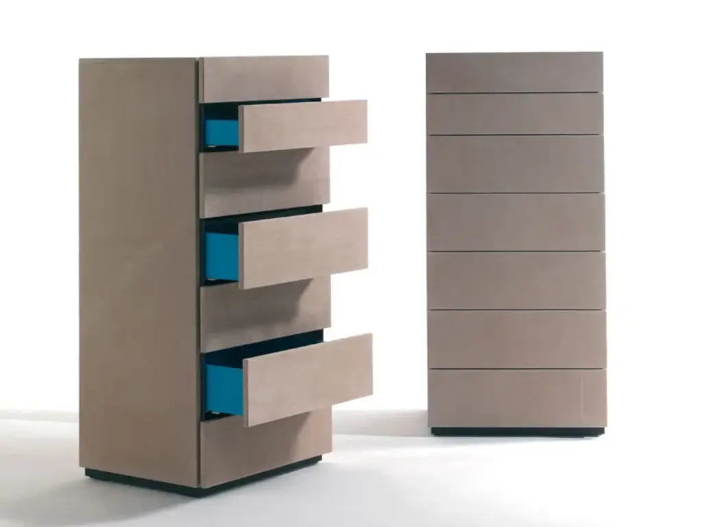 The Wooden Grooved Nightstand by Lema is a floor container system comprised of drawers, night tables and seven drawer dressers, all with great capacity, that become part of the bedroom through their discreet charm. Rigorous geometric purity of essential and compact volumes, monoliths of material and color marked by the shape of the grooved profile of the handle, at times lateral and at others central. The attention given to proportion, the slight differences in alignment between the parts and the material palette enhanced by the top in wood, matt or glossy lacquered, or natural stone, characterize a group of understated and elegant products, easy to combine with diverse styles of beds.