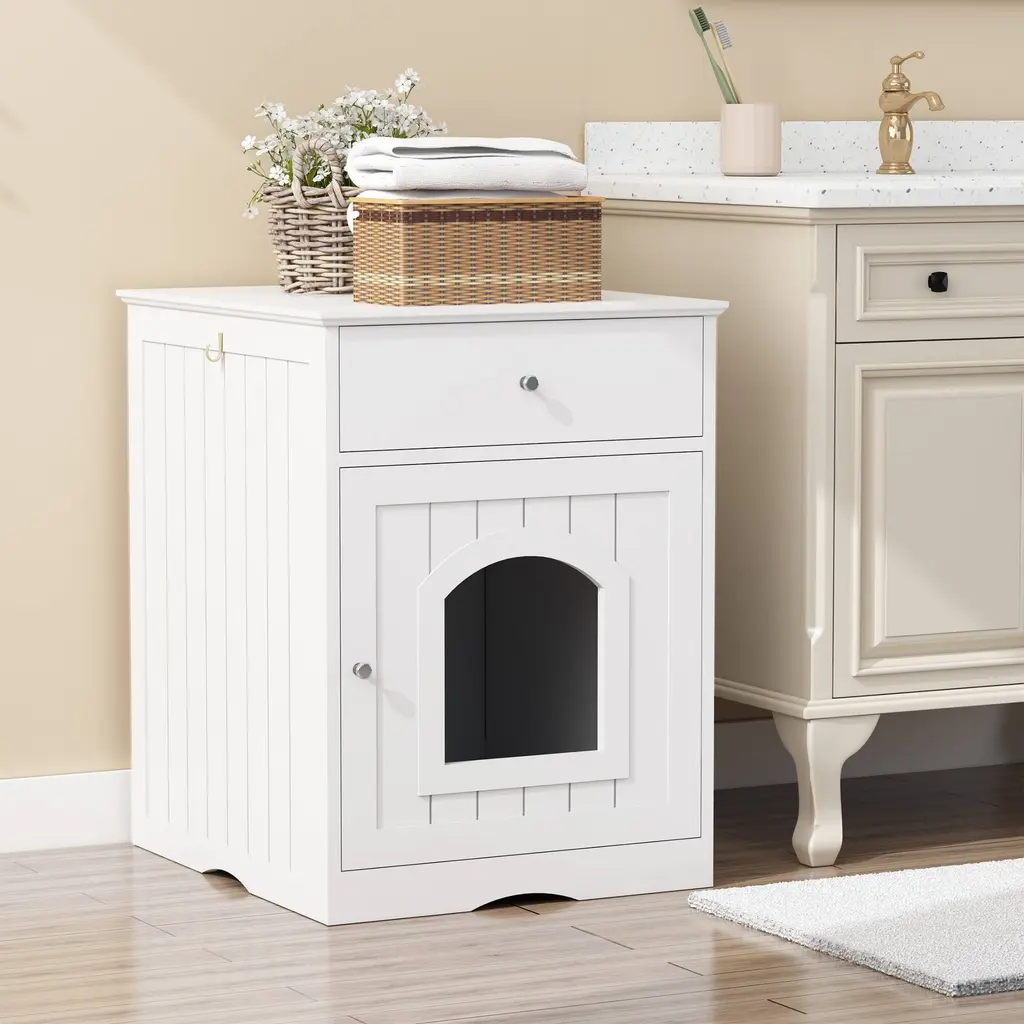 Wooden Pet House Cat Litter Box Enclosure With Drawer, Side Table, Indoor Pet Crate, Cat Home Nightstand - White