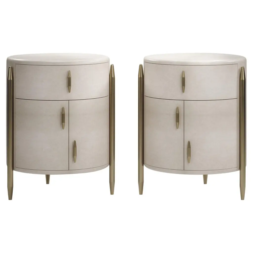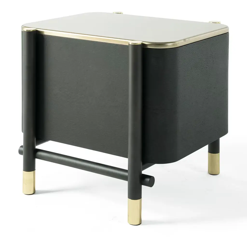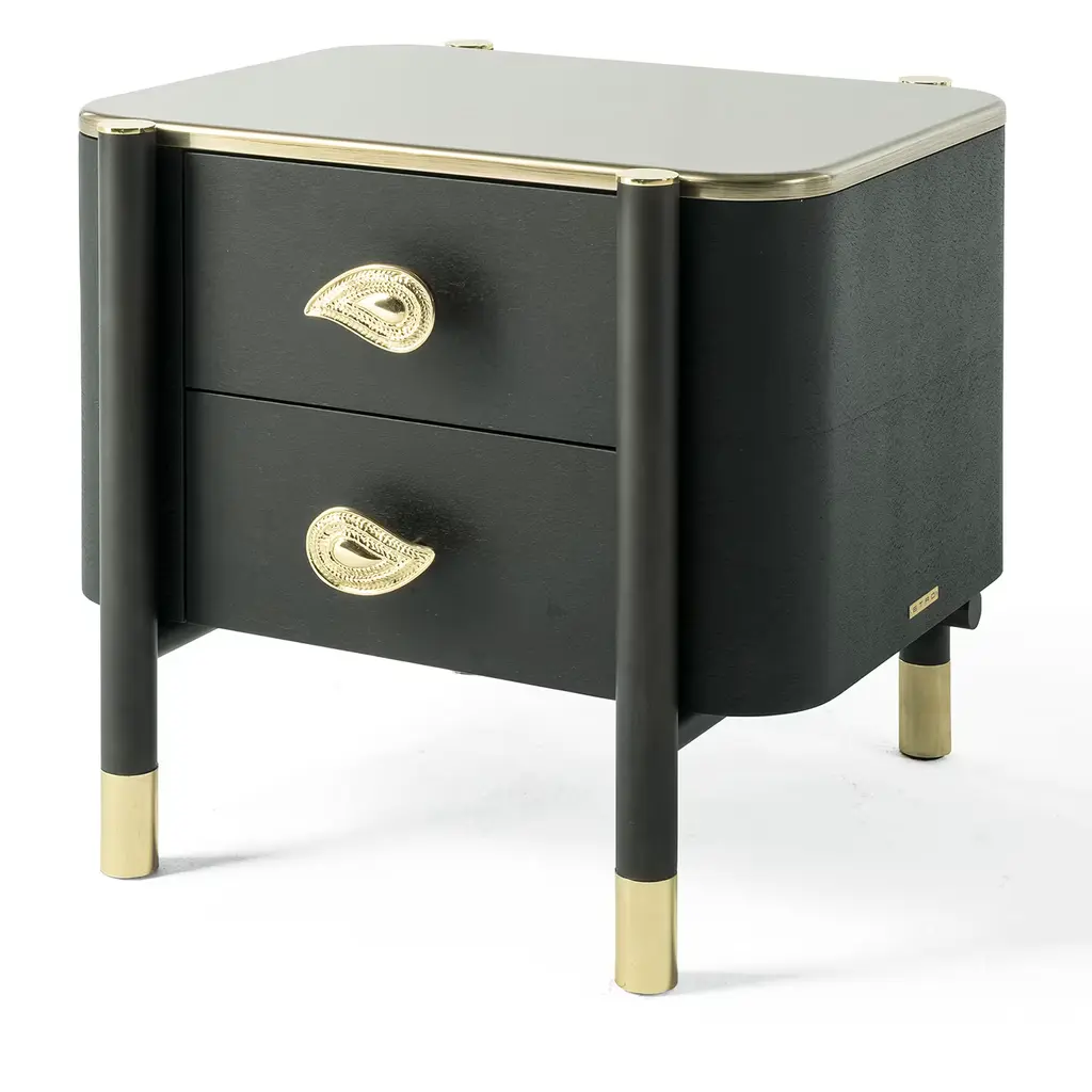 Characterized by a sophisticated dialogue between different materials, the night table of the Woodstock line is designed to meet functional and aesthetic needs. The structure in dark wengé dyed wood with tips in polished brass reflects the style of the other furnishings of the line, while the iconic Paisley symbol that lends its emblematic shape to the handle becomes a decorative element full of suggestions and meanings. Woodstock Structure in matt Dark Wengé dyed wood, with polished brass tips.