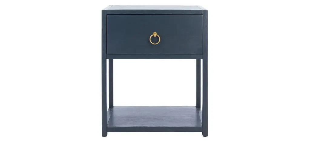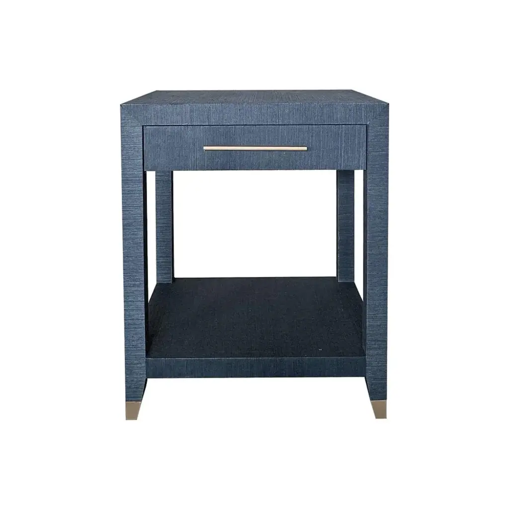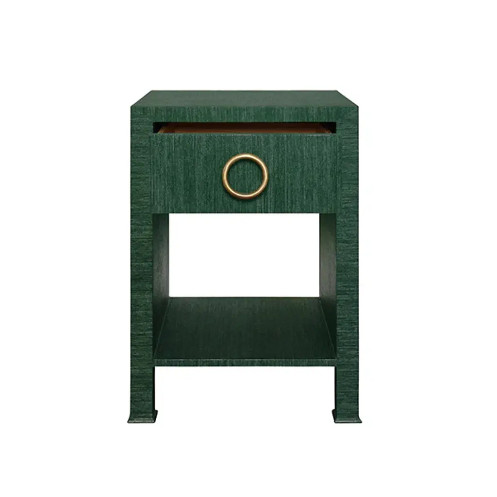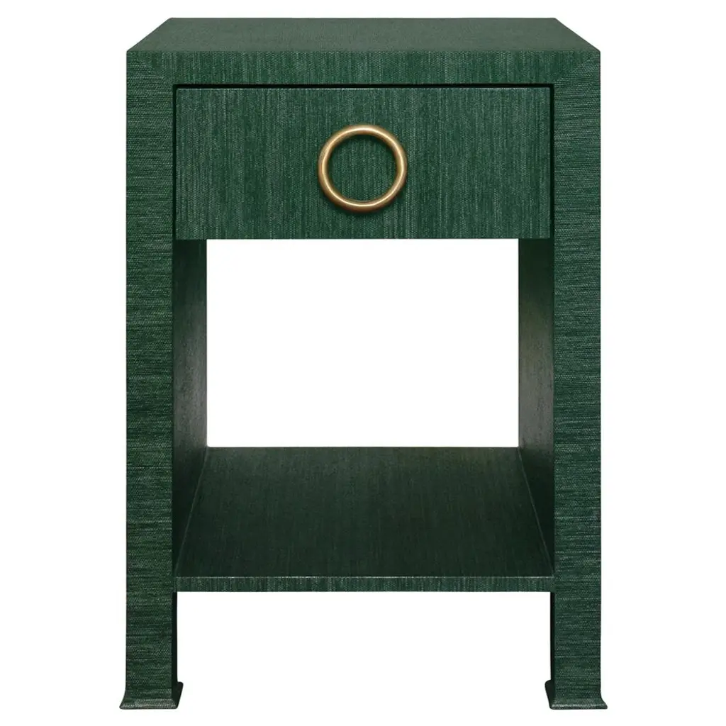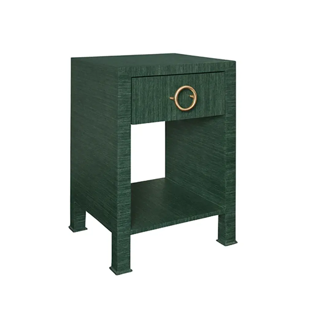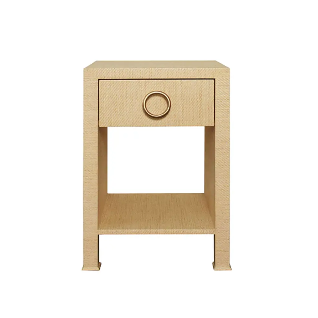 The elegant Malcolm side table by Worlds Away complements a broad range of interior design styles. Finished in textured grasscloth in three different colors and complimented by brass circle hardware, the Malcolm offers both storage and style.