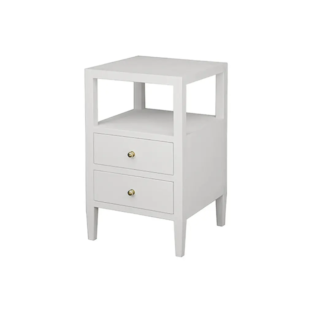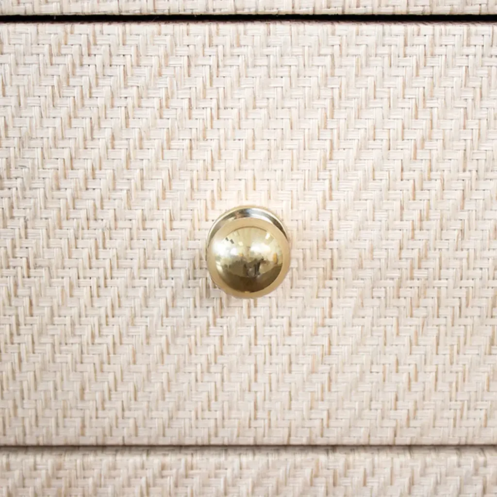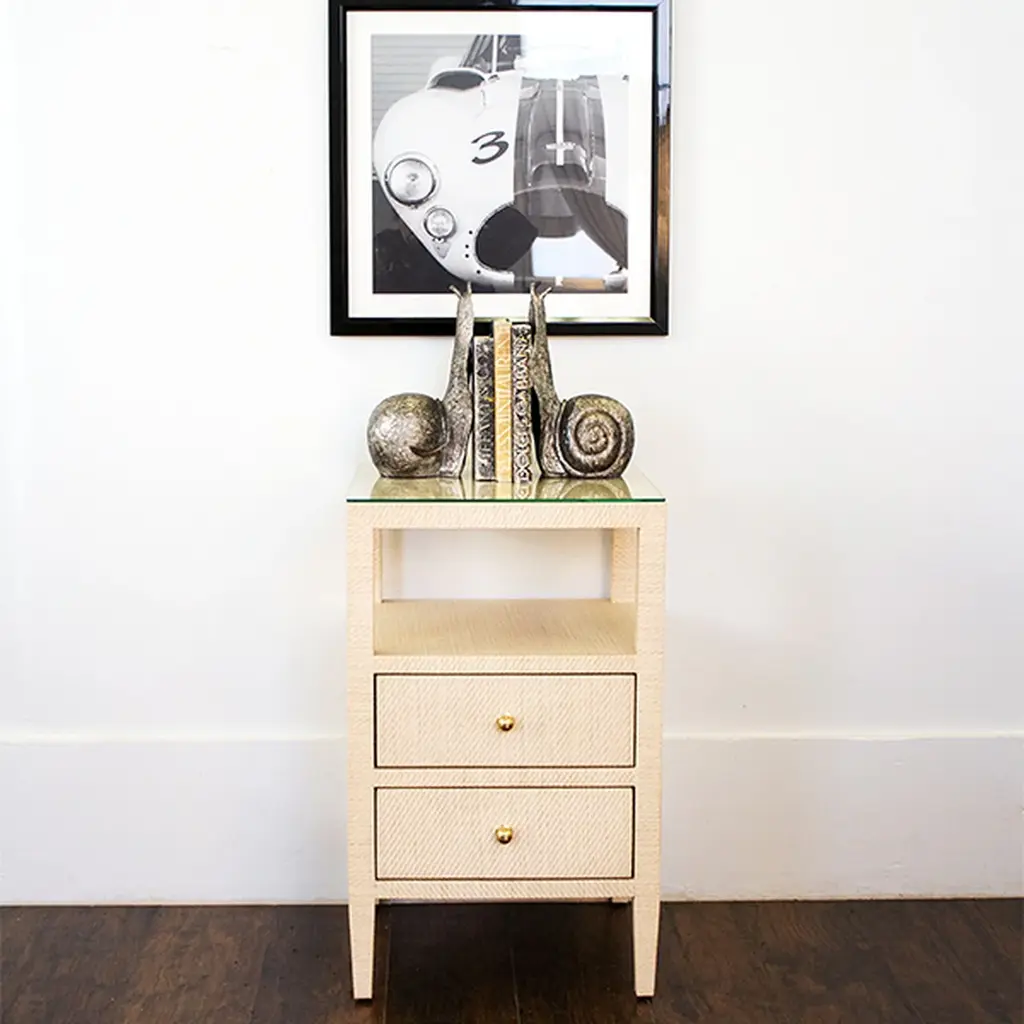 The Roscoe Side Table from Worlds Away features a square shape that is perfect by the bed or sofa. Available in a Varity of finishes including grasscloth, linen, or burl wood the texture of the Roscoe brings depth to all furniture around it. Two drawers on the Roscoe nightstand allow for small items to be tucked away for safekeeping. Finished with brass hardware, the side table is minimal and modern and a designer favorite.