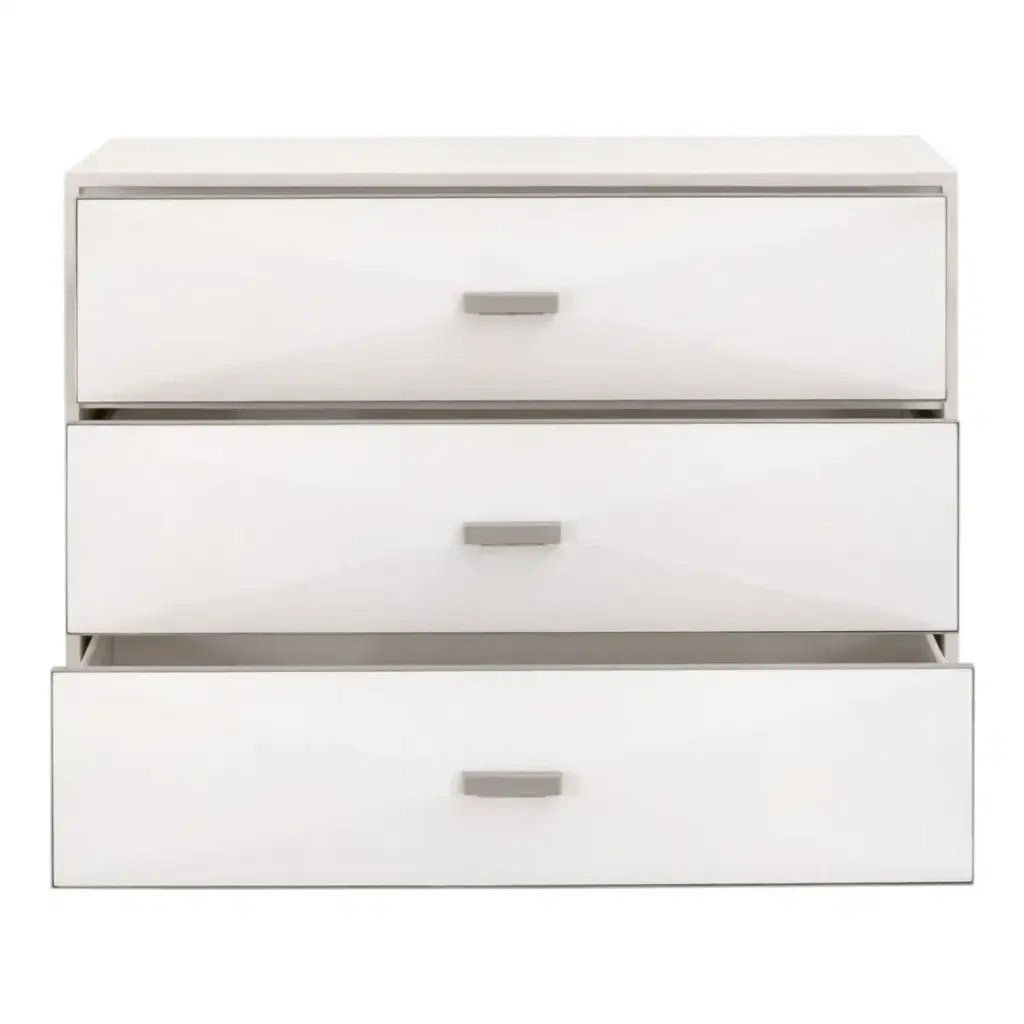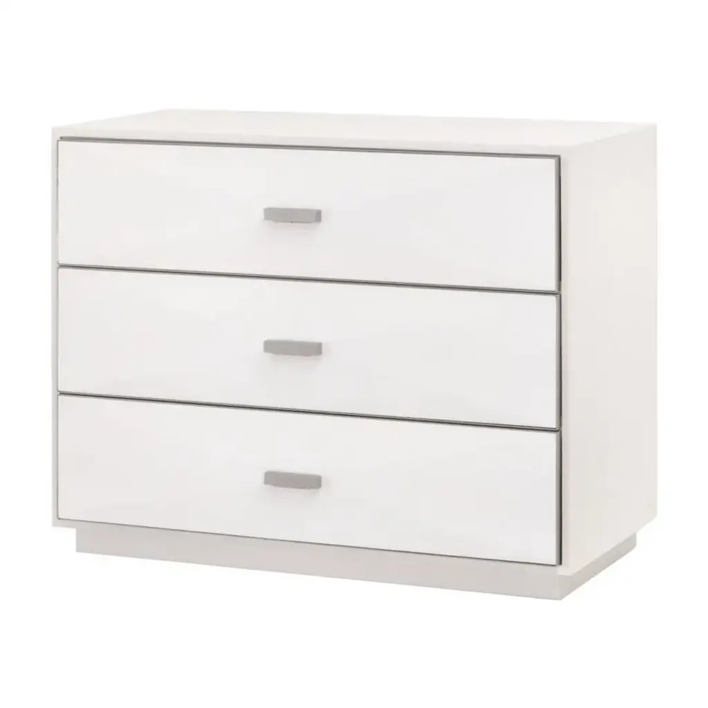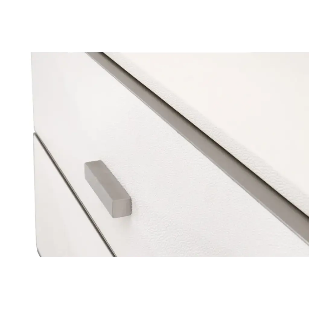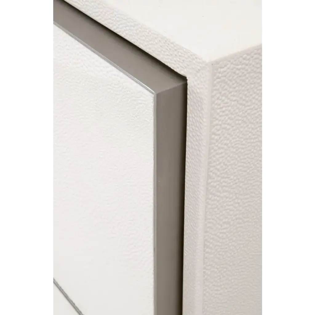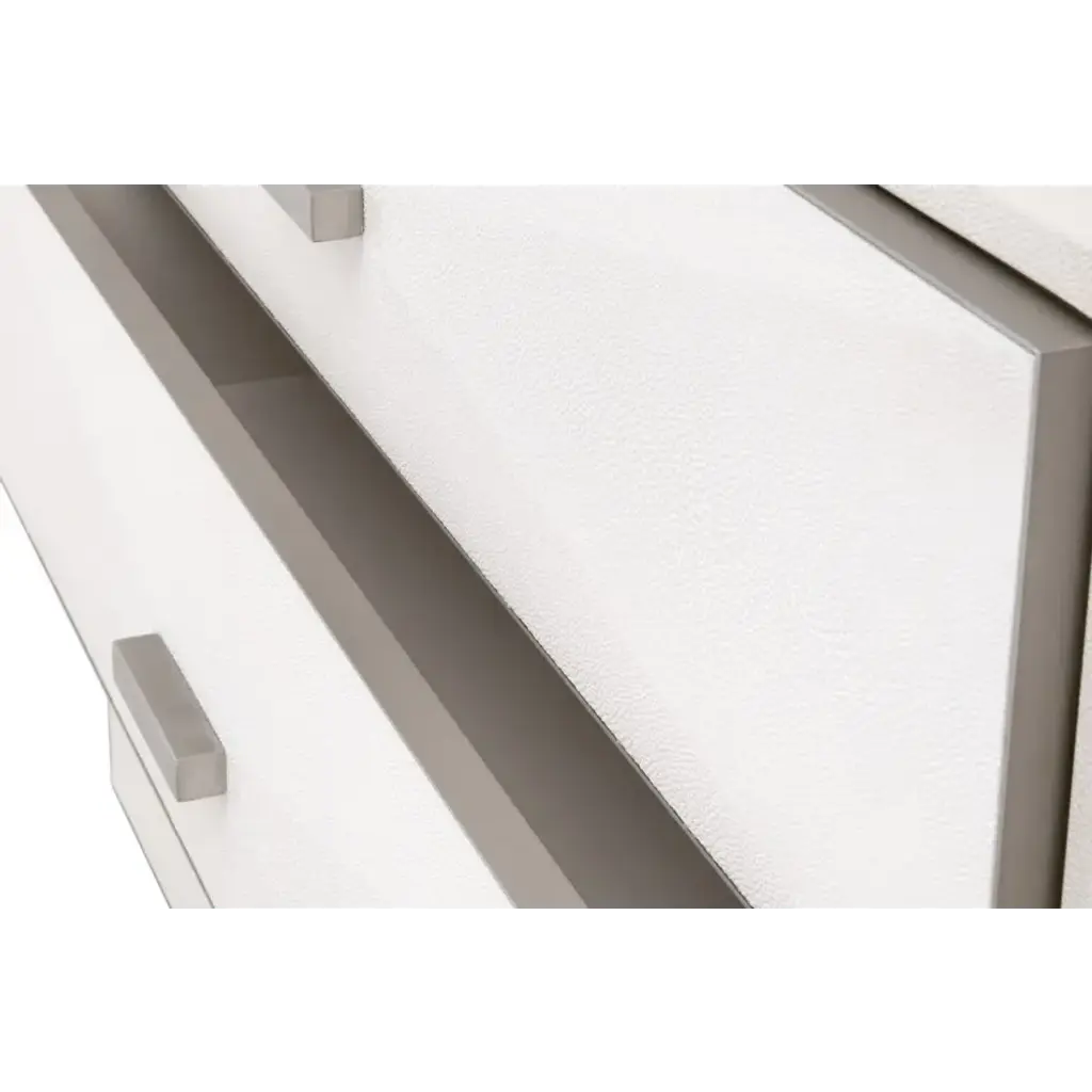 Transition your bedroom to a light and airy atmosphere with the Wynn Shagreen Nightstand by Essentials for Living. It is constructed with a pearl white faux shagreen resin made to resemble real stingray skin. The textured shagreen is subtly accentuated by a 3-dimensional design on the front of the drawers, which adds depth and dimension to the nightstand. It measures 38†wide, 19.5†deep, and 30.25†high, and features three large felt-lined storage drawers. The drawers are accented by a thin, brushed stainless-steel frame, which ties in nicely with the rectangular brushed steel handles. With the calming white hues and transitional design of this nightstand, you’ll find this piece will work well in many settings.