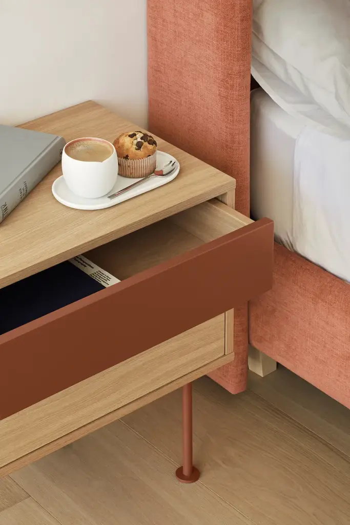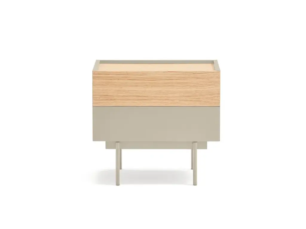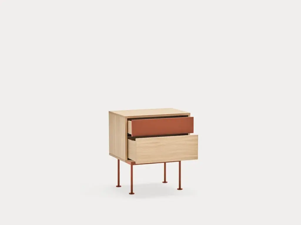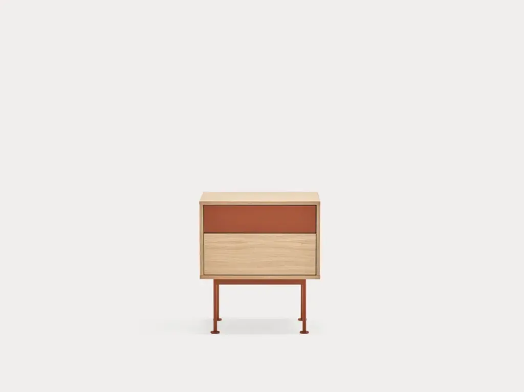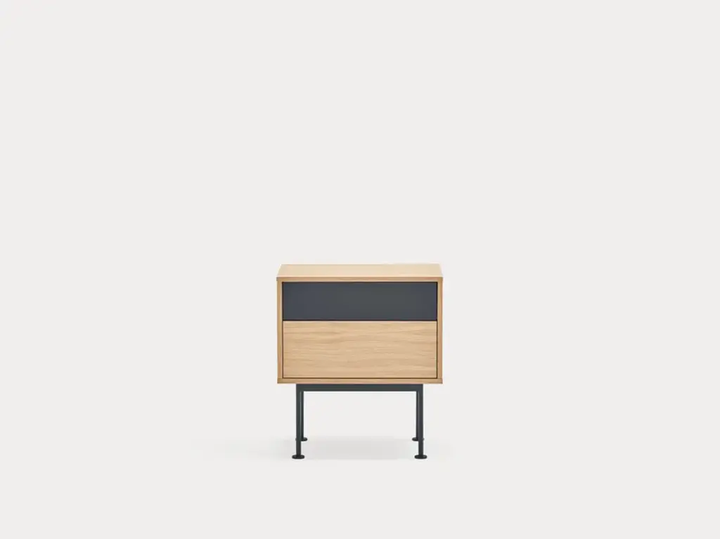 Yoko is an oak veneer bedside table except for some fronts, which are lacquered MDF. The legs are metallic and lacquered with the same colour as the fronts.Yoko is a collection that aims, through its simplicity and versatility, to offer a modern furnishing solution suited to the needs of contemporary homes.Completely veneered in oak, Yoko combines the natural beauty of wood with color accents, making it perfect to fit into different environments.