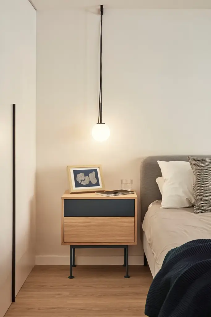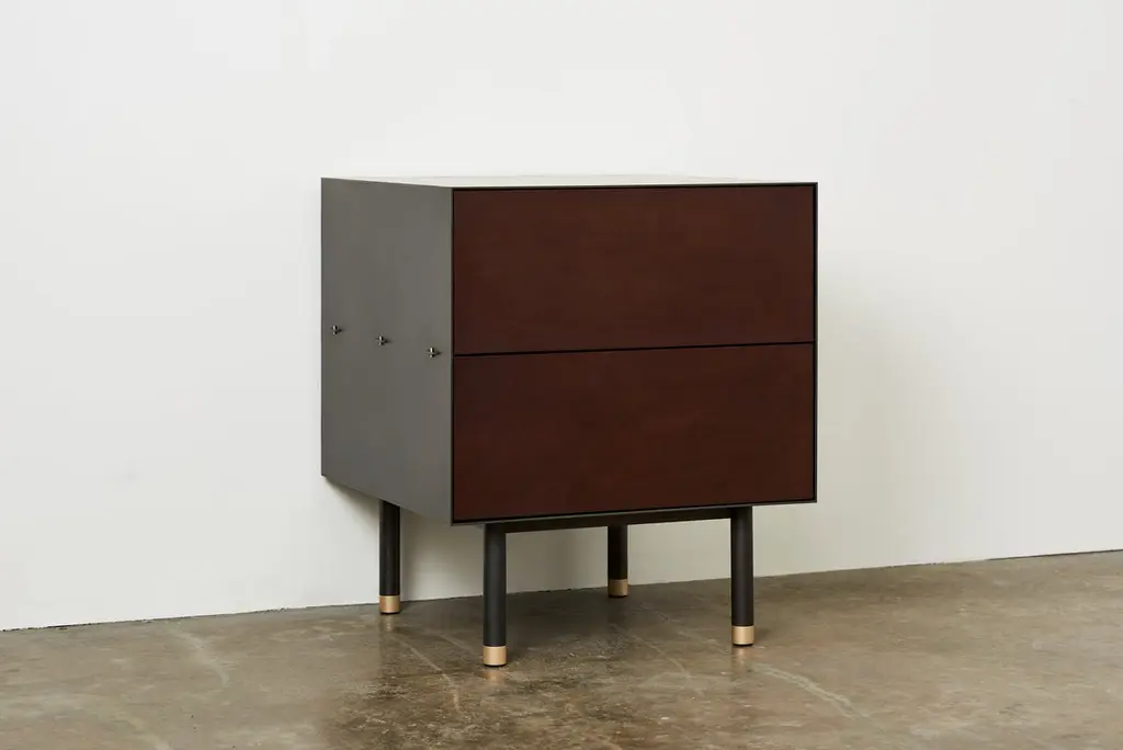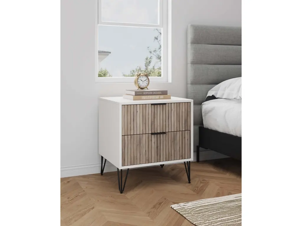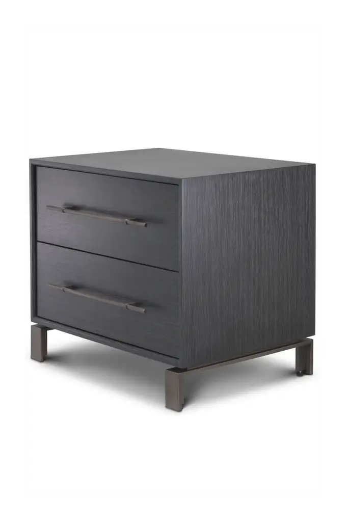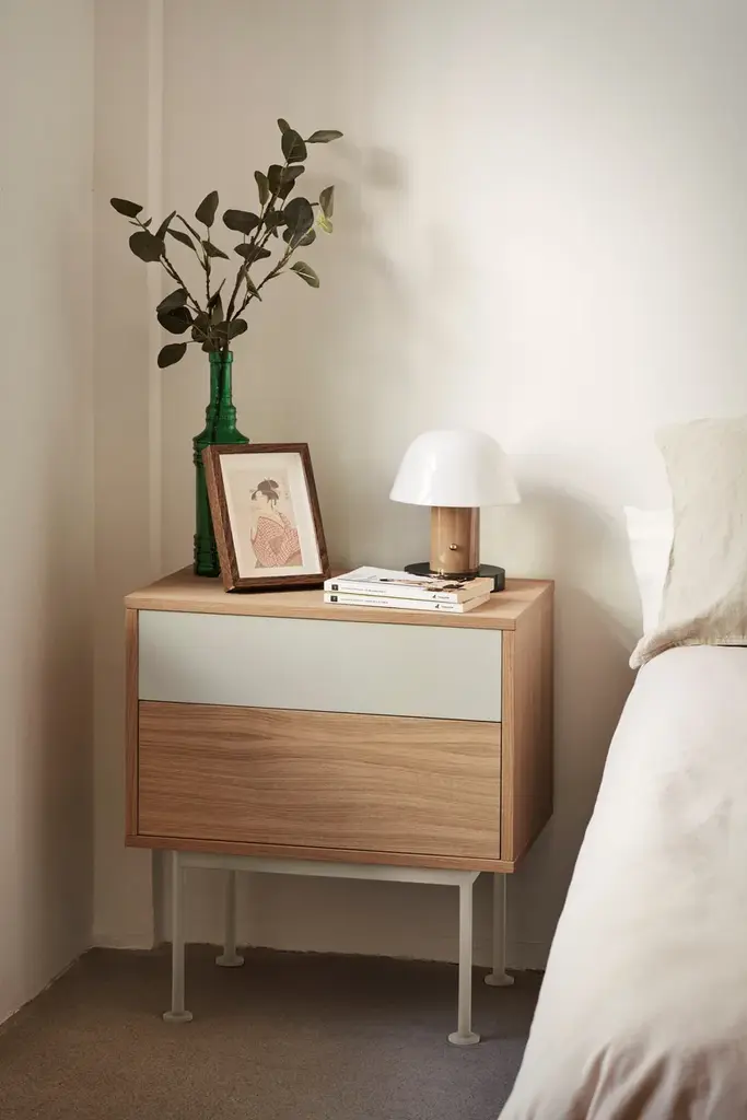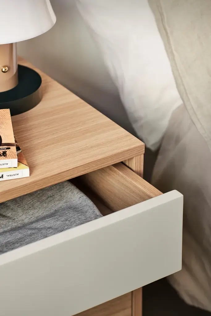Yoko is an oak veneer bedside table except for some fronts, which are lacquered MDF. The legs are metallic and lacquered with the same colour as the fronts.Yoko is a collection that aims, through its simplicity and versatility, to offer a modern furnishing solution suited to the needs of contemporary homes.Completely veneered in oak, Yoko combines the natural beauty of wood with color accents, making it perfect to fit into different environments.