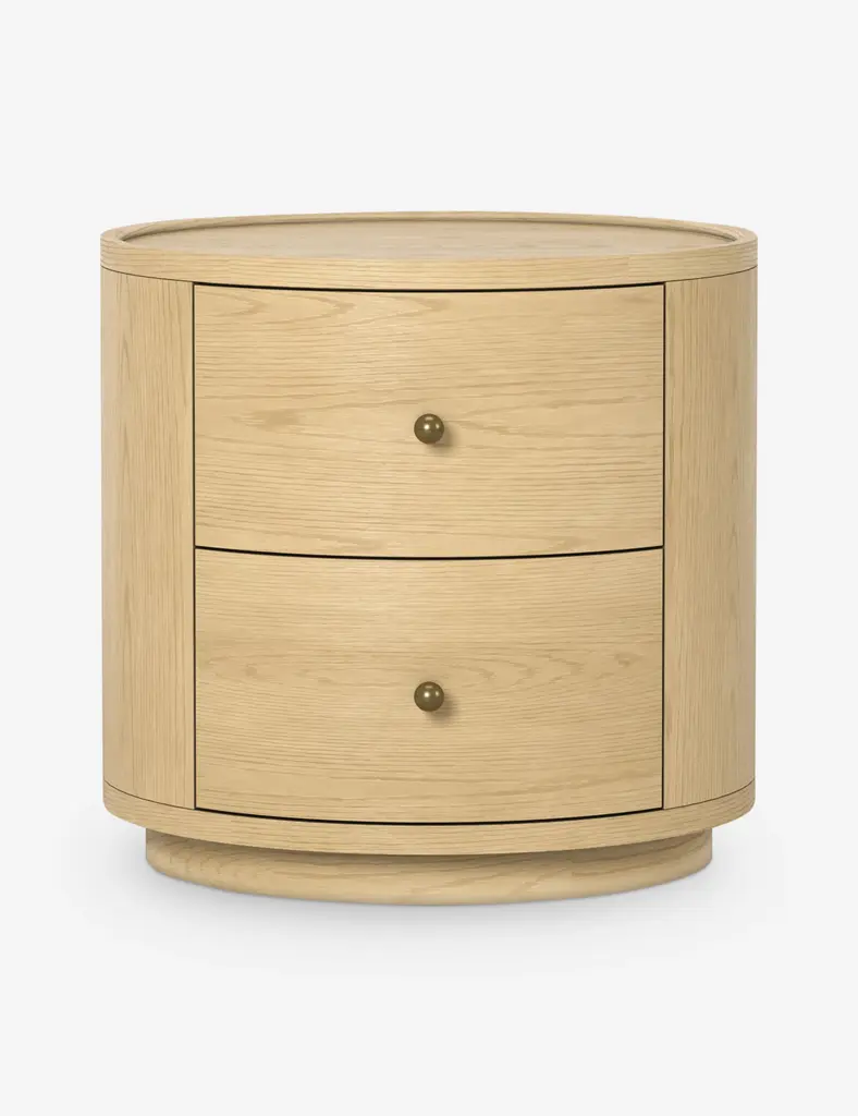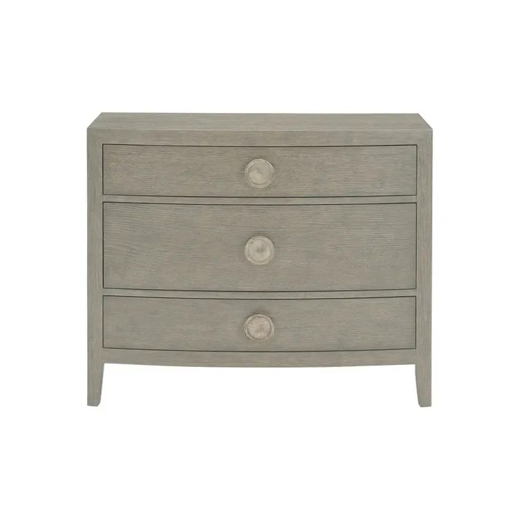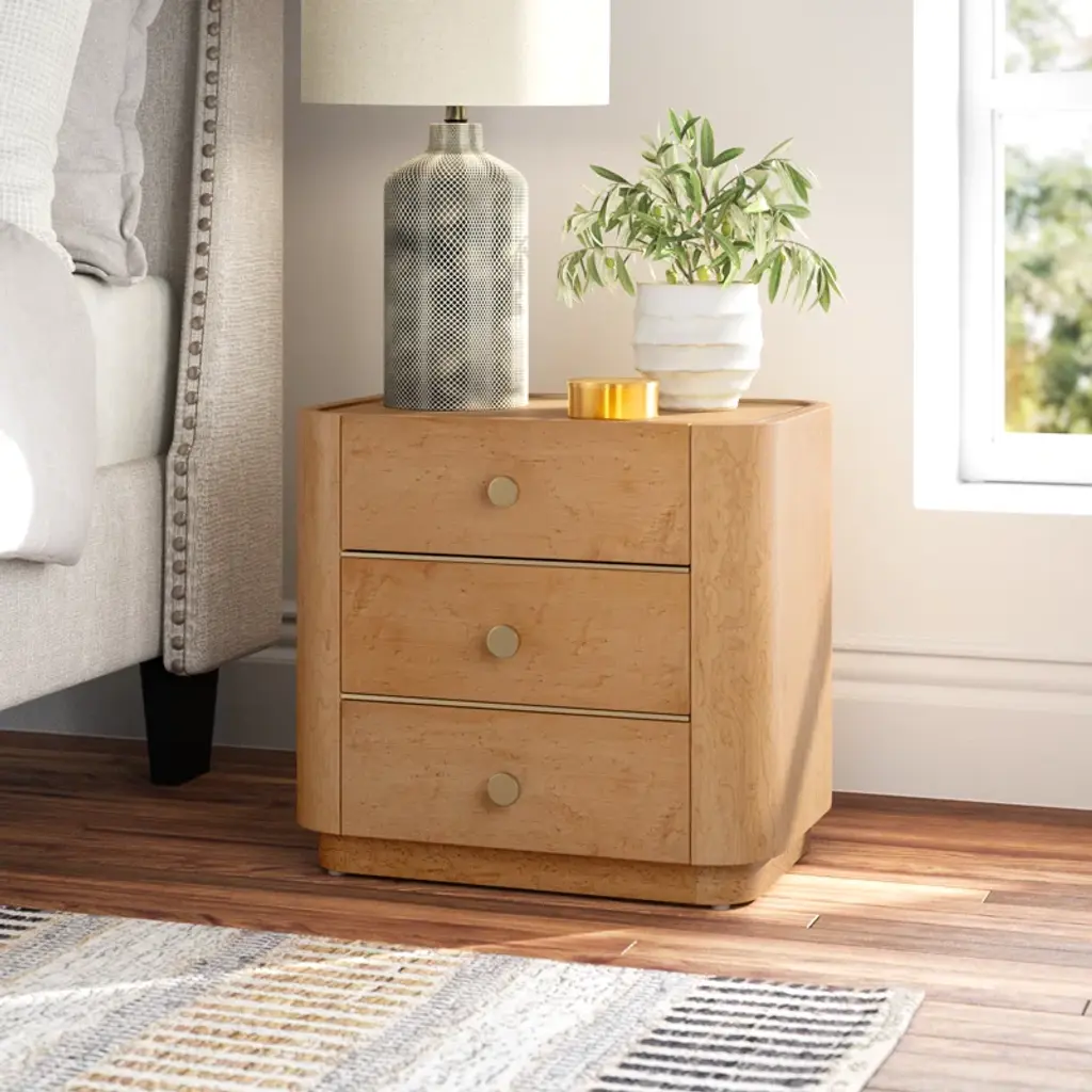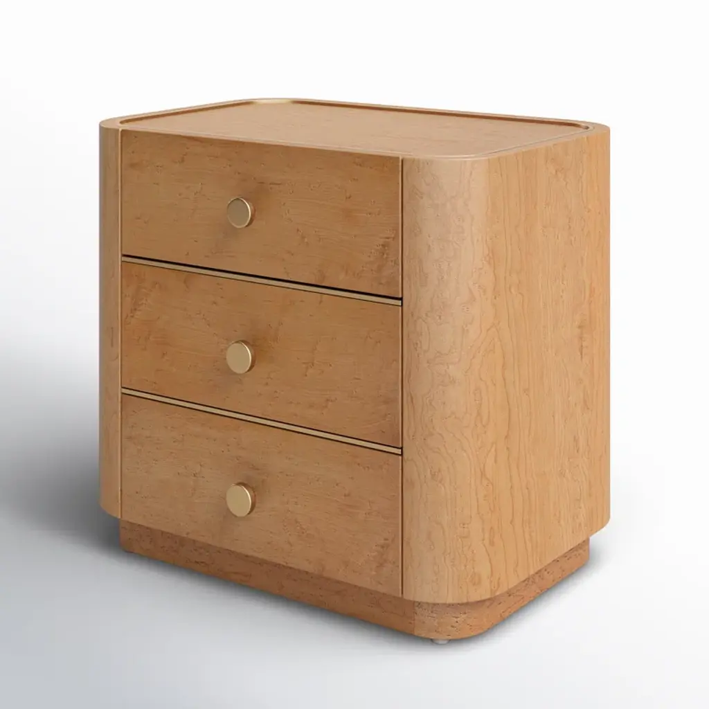 A captivating blend of timeless style and practicality. The variations in the wood make each nightstand totally unique and special. Its brass inlay and matching knobs add a touch of refinement, while the thoughtfully designed proportions provide ample storage space with three drawers. Elevate your bedroom with this charming and functional piece of furniture.