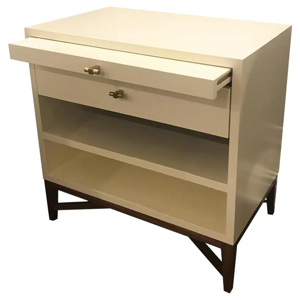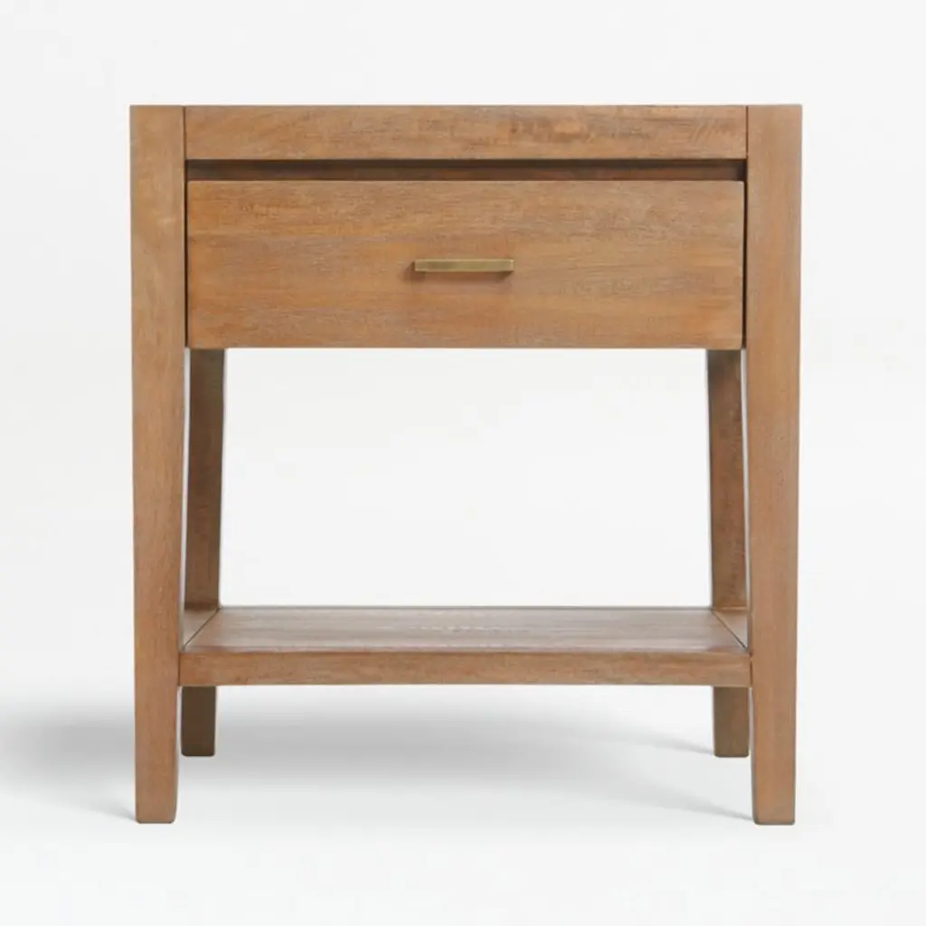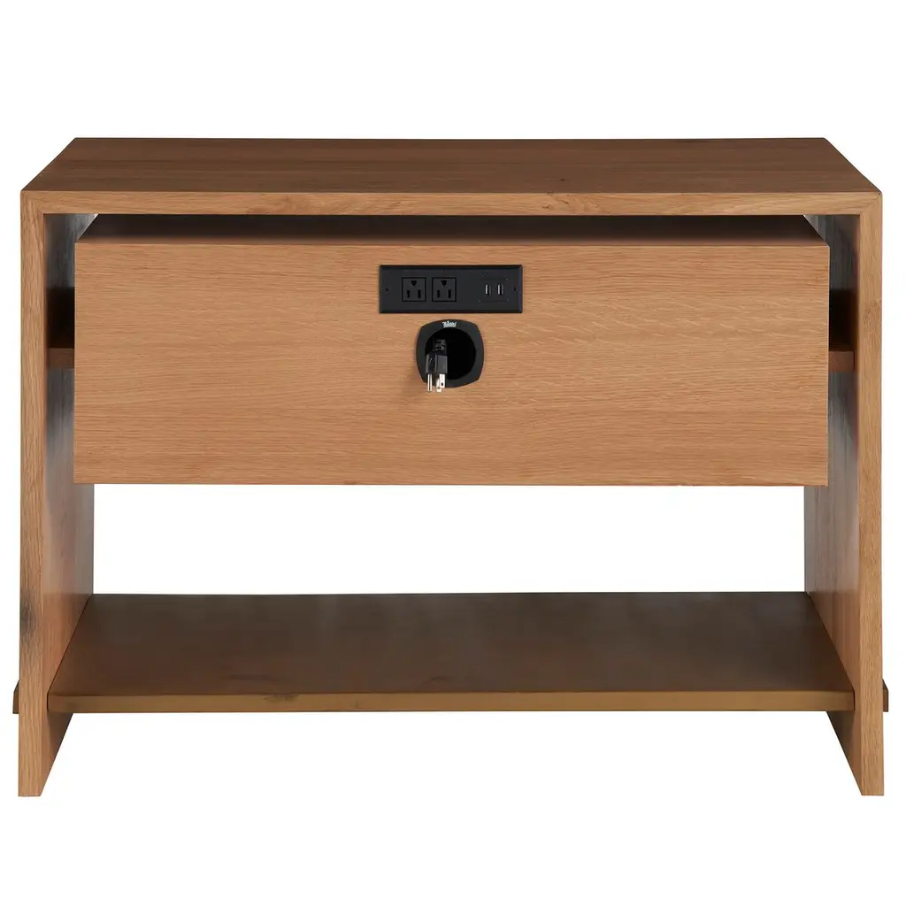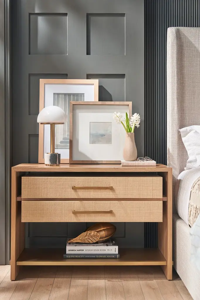 The Zander Nightstand captures the essence of mid-century modern charm with its two-tonal aesthetic. This piece features raffia drawer faces, complemented by elegant gold hardware and framed with an oak top and sides, creating a harmonious balance of texture and color.