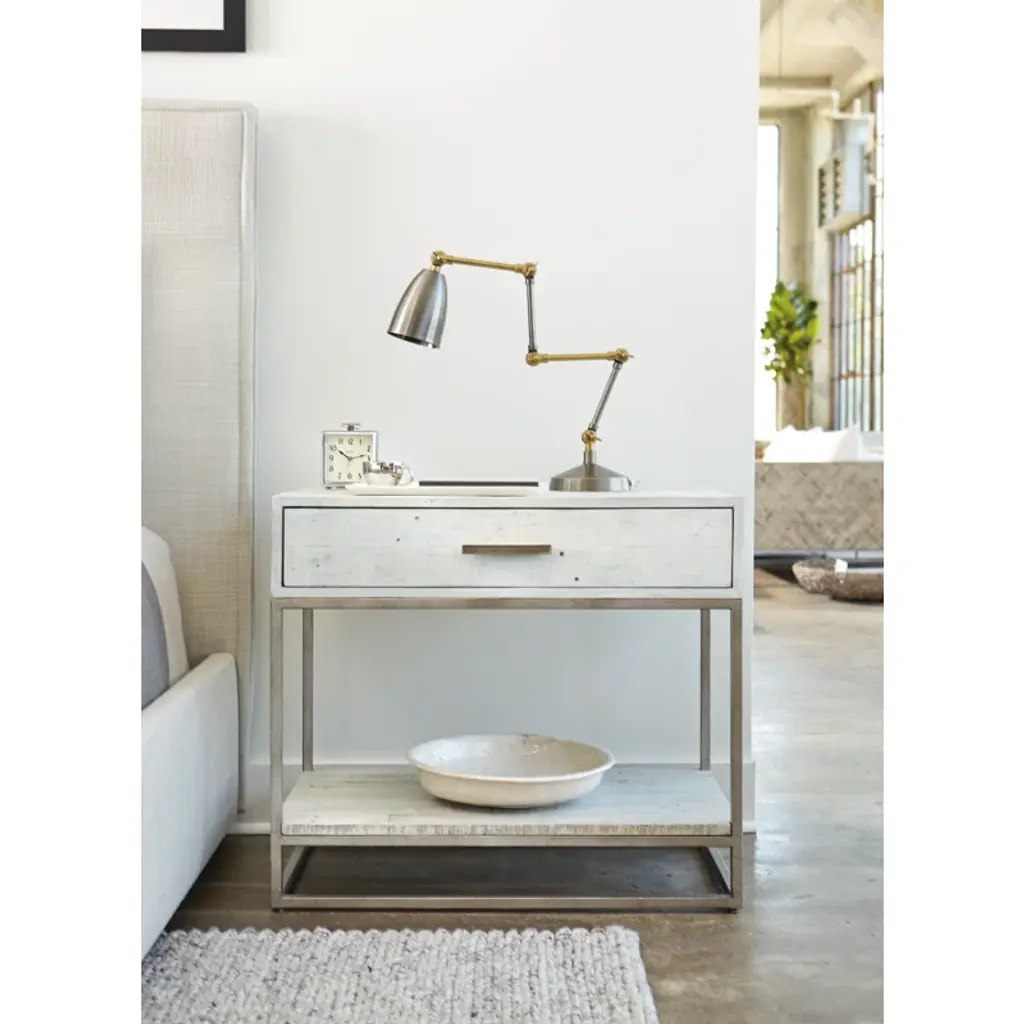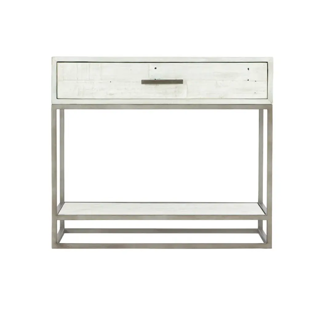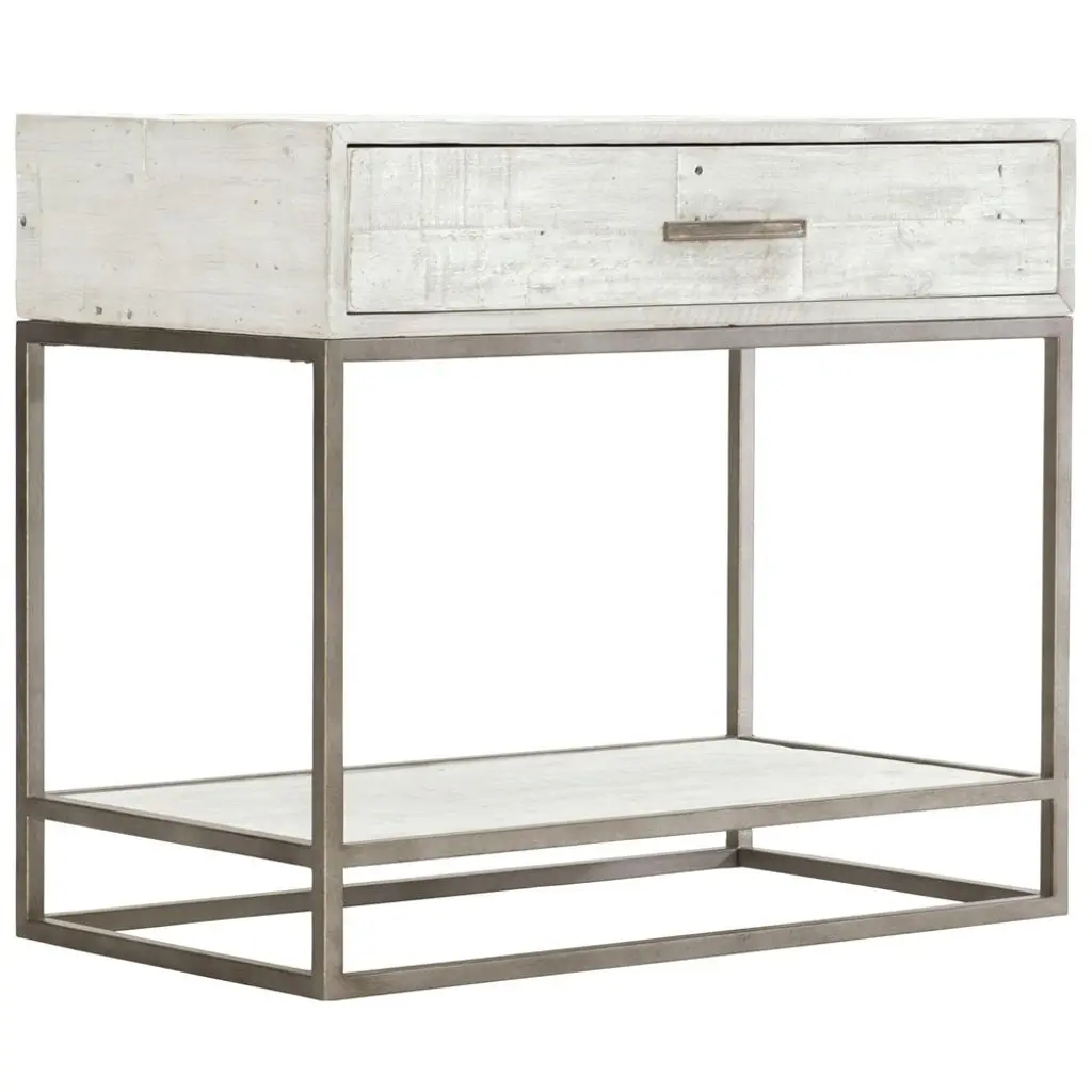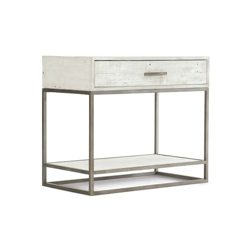 This collection, part of Bernhardt's eclectic Loft brand, blends the best features of the farmhouse and mid-century design, with a one-of-a-kind appeal and laid-back vibe. The planked wood top and drawer box with a single drawer are supported by a tubular steel base with stark, clean lines. A bottom wood shelf matches the top's design. This piece is designed by Bernhardt Furniture, a luxury heritage brand that is renowned for iconic furniture design.