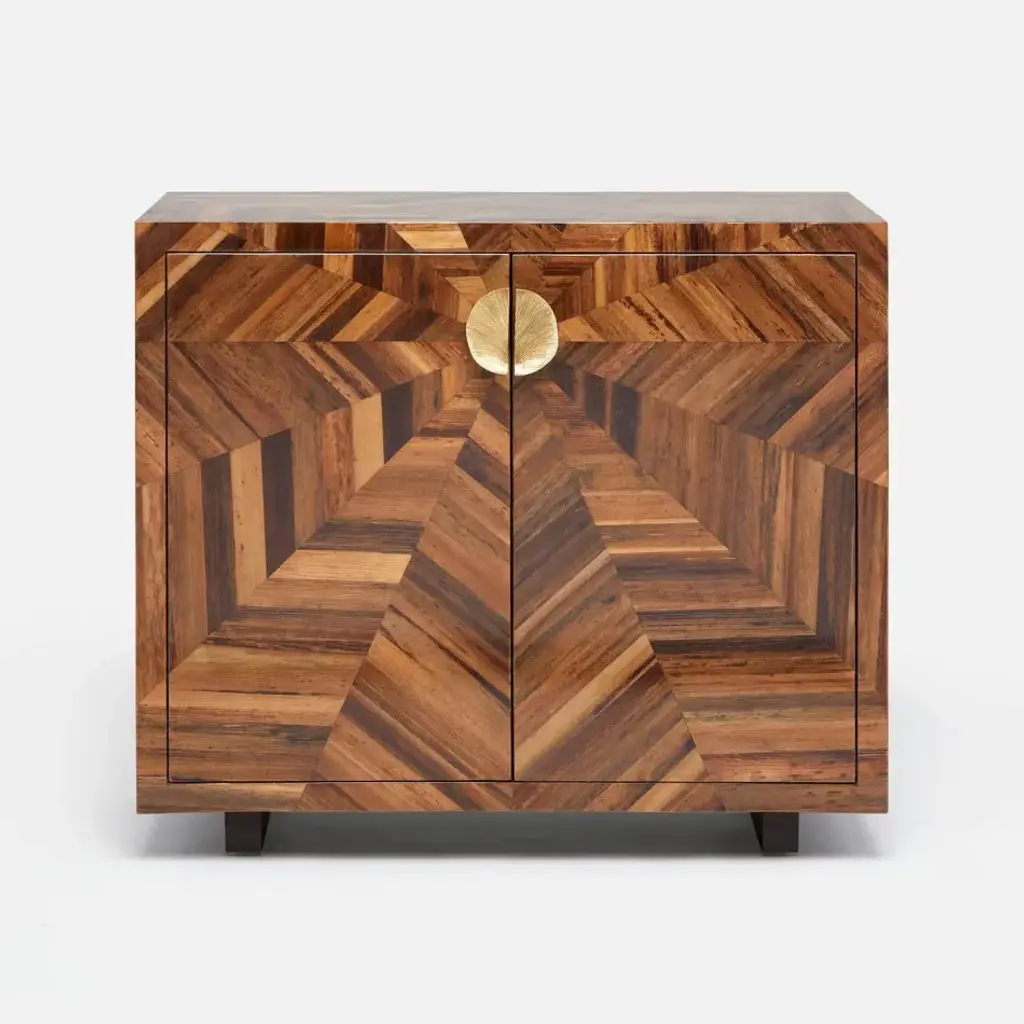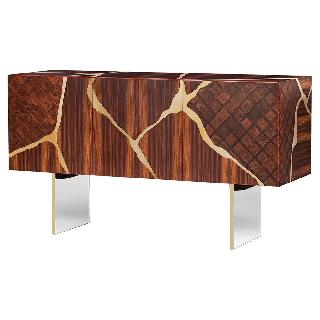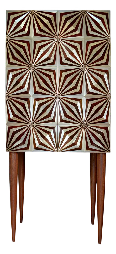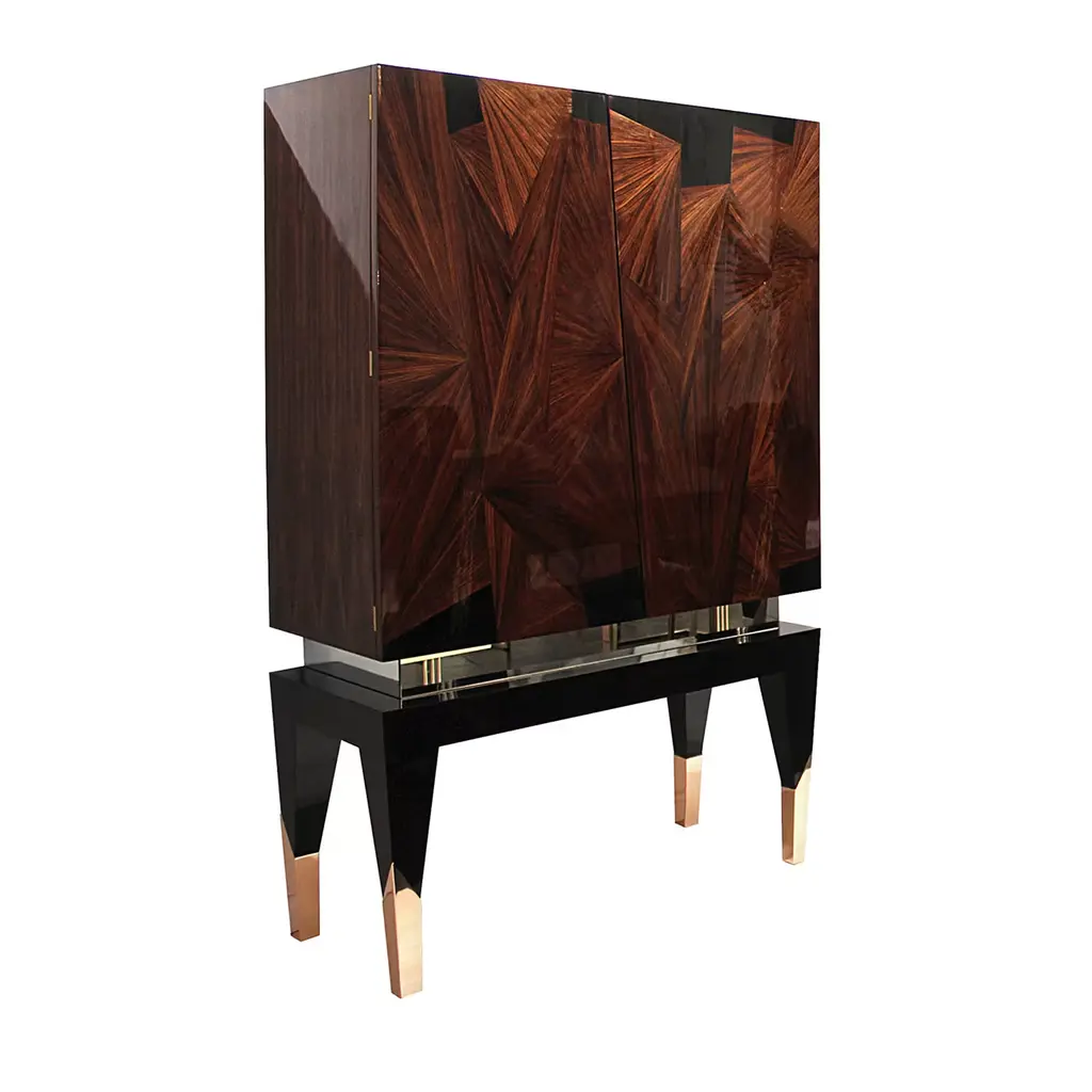 Bedside table of the ZARAFA collection with structure in multilayer wood veneered in ebony macassar 03E with coriander inserts in Ferrara walnut burl.Night compositions series. Frame in blockboard and multi-ply with ebony veneer for the exterior and interior. The top is available in ebony veneered hollow core or in marble from the samples available. The drawers have concealed runners fitted with the silent close system. The top interior is upholstered in leather. The base frame is in lacquered solid tulipier.