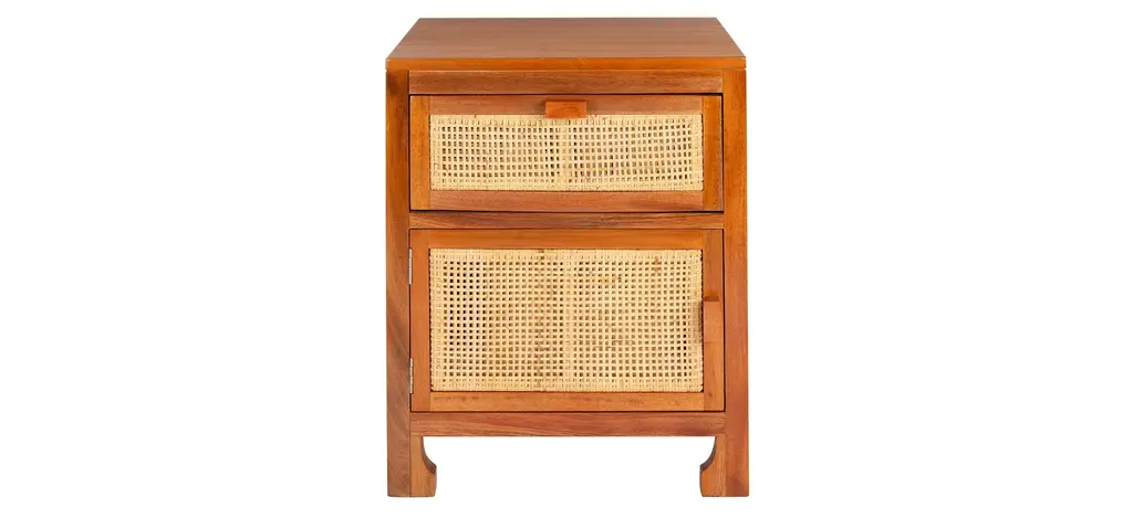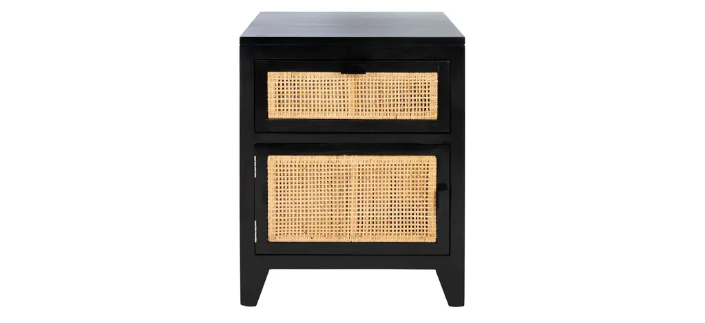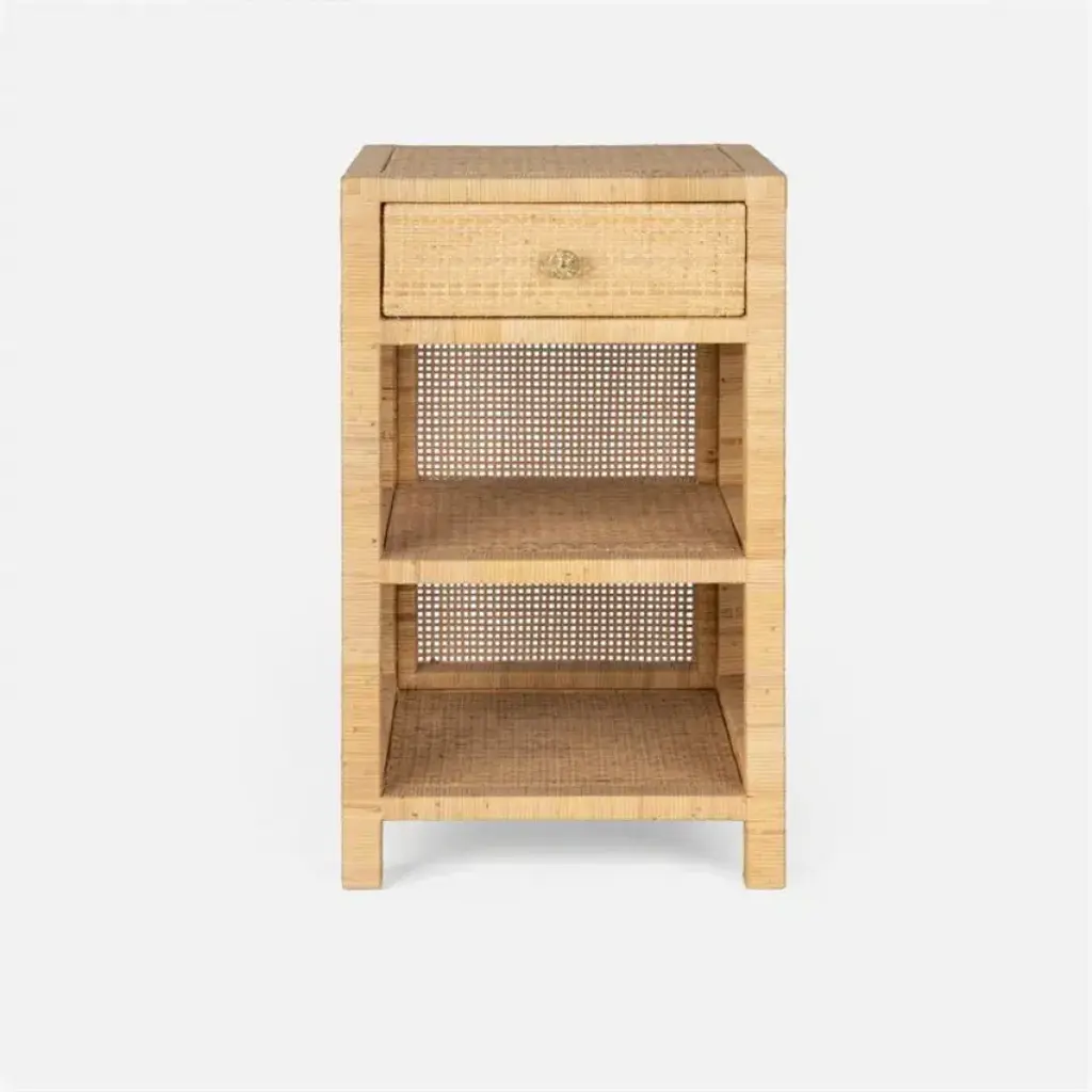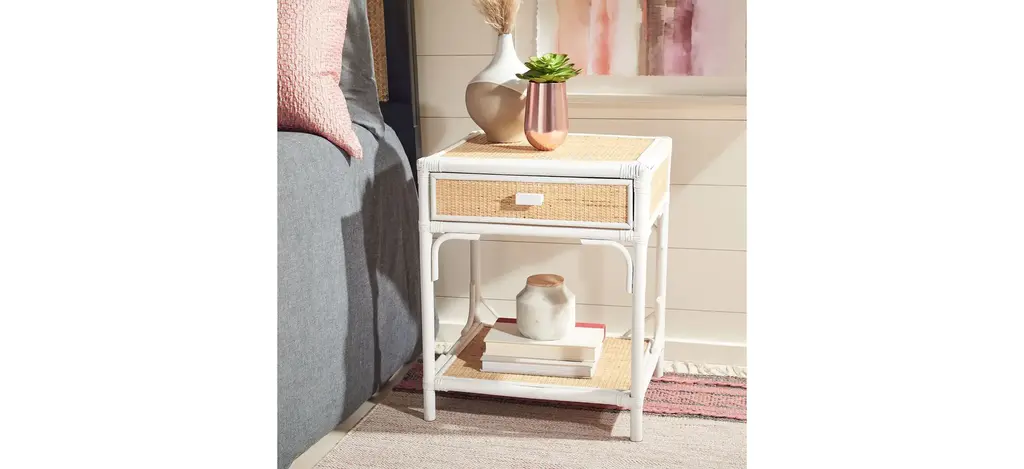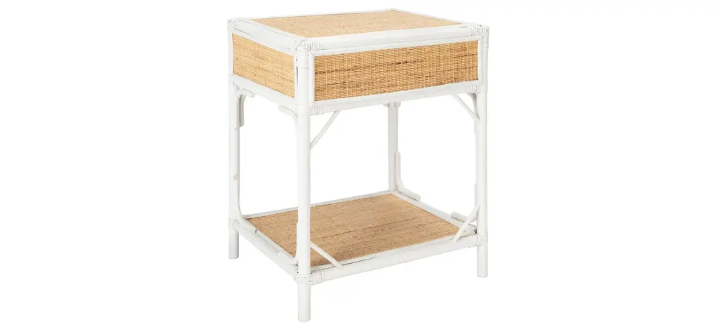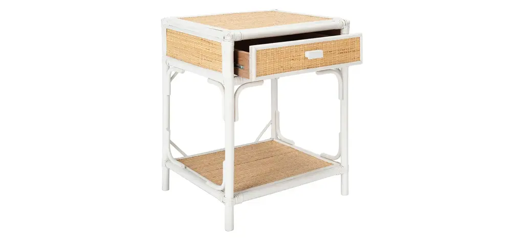 British Colonial style is reimagined for today's contemporary coastal interiors in this Zinnia Nightstand. Zinnia's bamboo style frame, open bottom shelf, and natural rattan drawer give it unique visual depth, while its clean white finish ensures Zinnia compliments any room's color scheme.