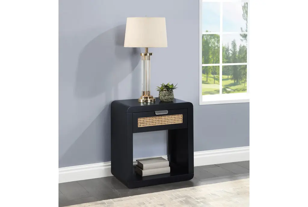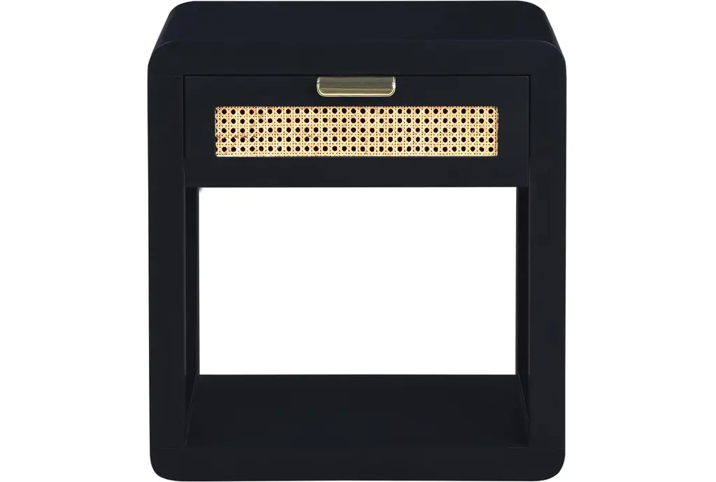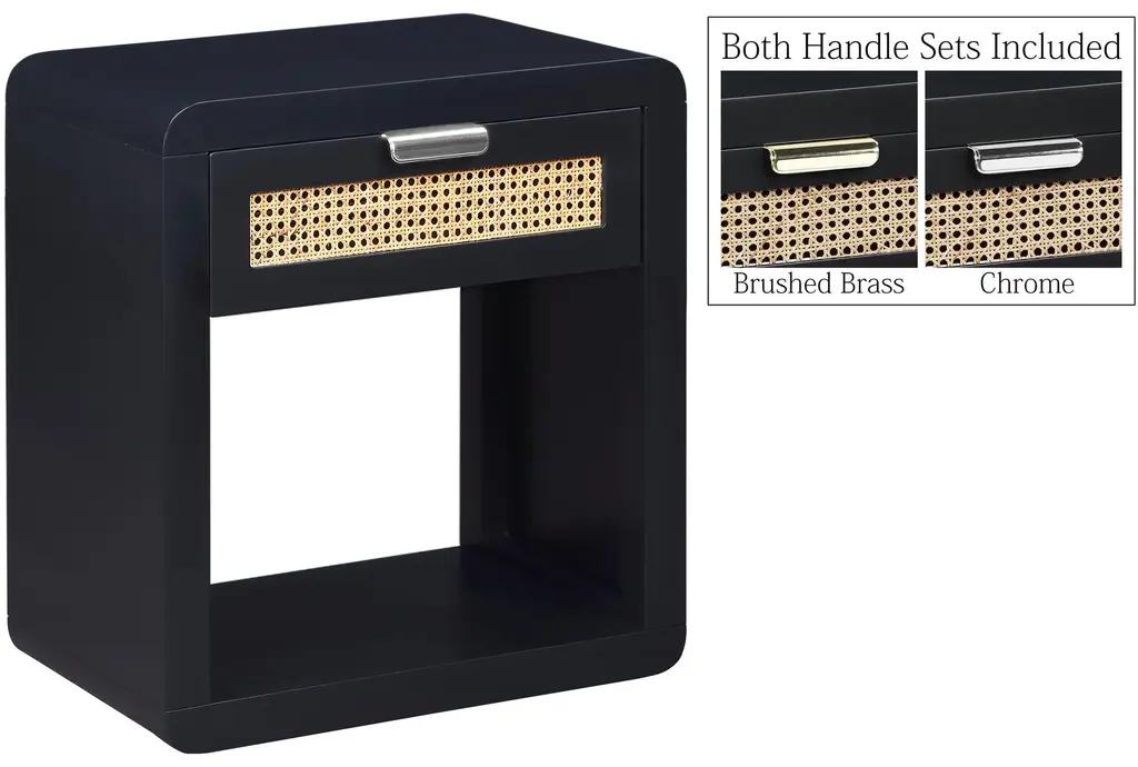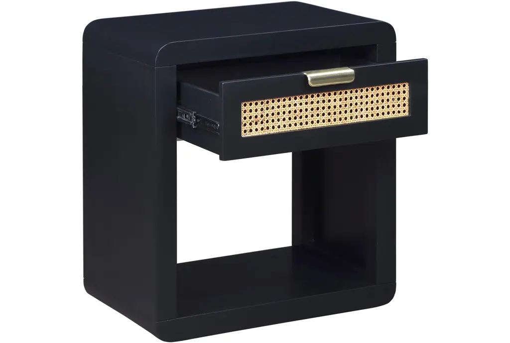 The Zypheria Black & Cane 1-Drawer 24" Wide Night Table is a perfect blend of modern and mid-century design. Crafted from poplar wood, MDF, and natural cane, this night table features a sleek black finish that adds a touch of elegance to any bedroom decor. The natural cane drawer front and the option of brushed brass or chrome handles provide versatility and style.