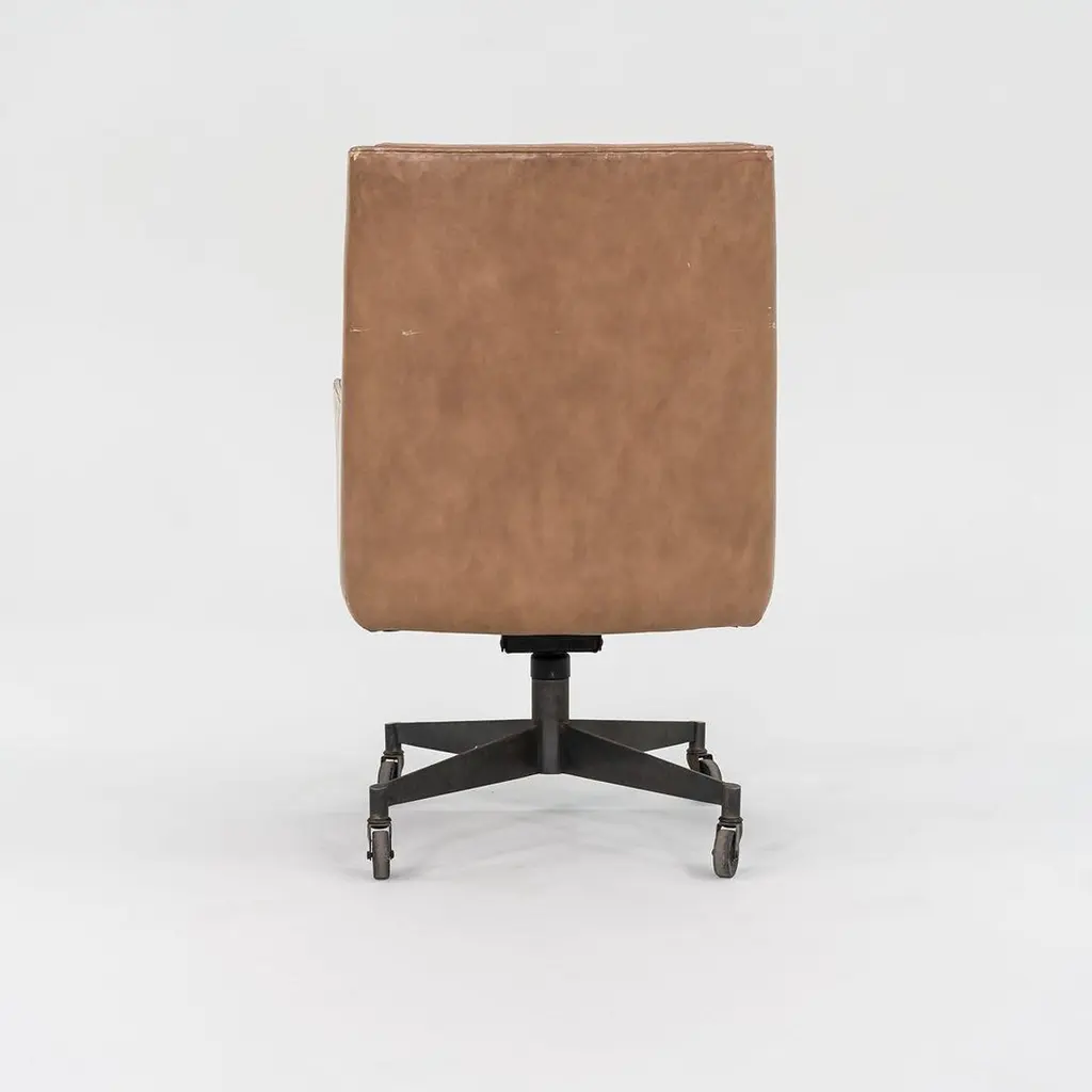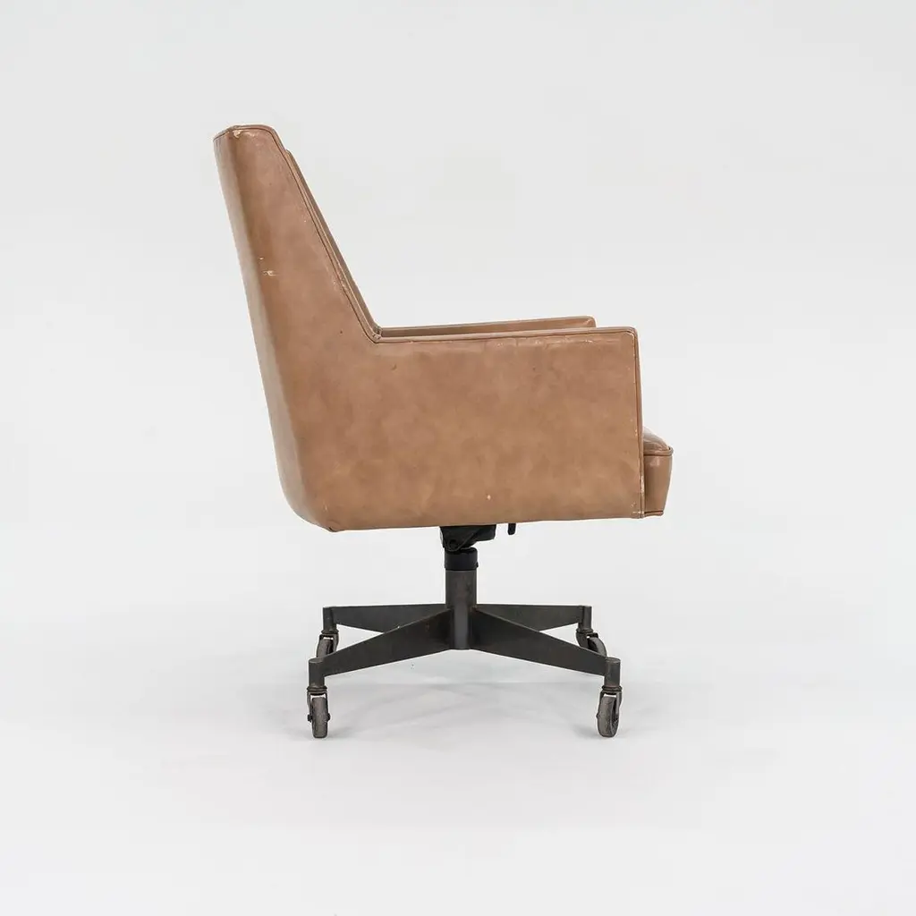 These are large Desk Chairs in Tan leather with Bronze Four-Star Bases, produced by Stow-Davis Furniture of Grand Rapids, MI. in the 1960s. The listed price includes one chair, and we have three chairs available for purchase in this colorway. Their frames are constructed of bronzed steel, and they come equipped with heavy duty casters. Each chair measures 25 inches deep, 24 inches wide, and 38 inches high. They have several marks and scratches on their leather upholstery, many of which have been touched up. There are some scuffs on the bases, and on the casters as well. Overall, these chairs are in good condition. Please see photos.