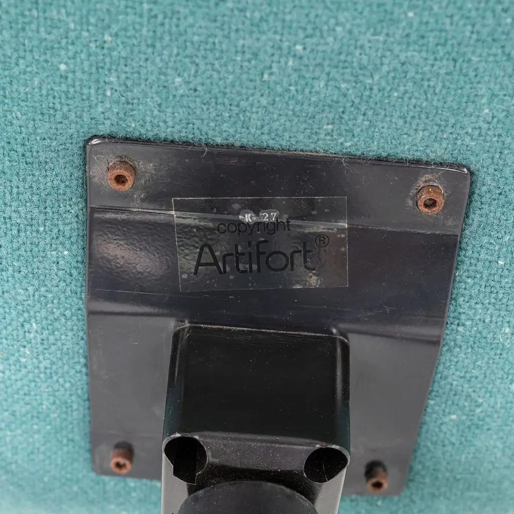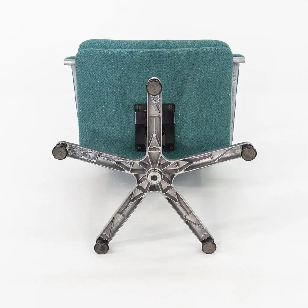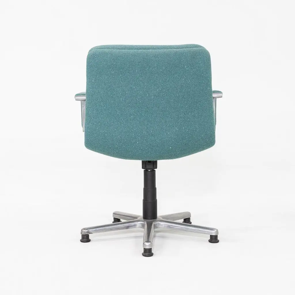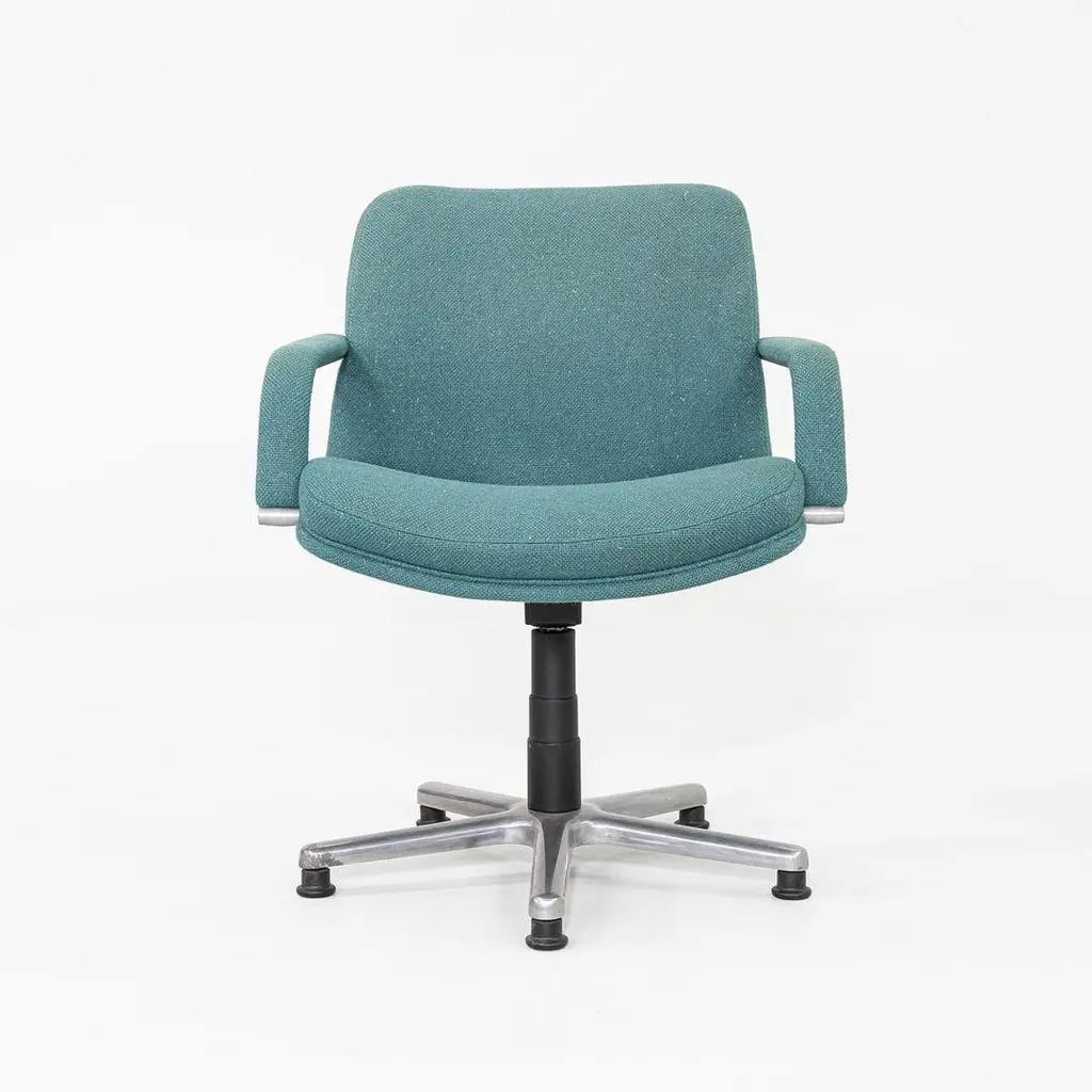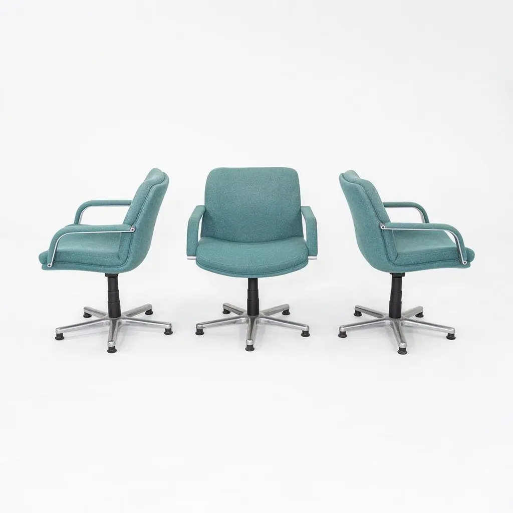 This is a Large Swivel Desk or Conference Chair, designed by Geoffrey Harcourt for Artifort in the 1970s. The chairs were produced in The Netherlands. The listed price includes one chair, and we have three chairs available for purchase. The upholstery on these chairs is done in a durable Teal hopsack fabric. They have strong swivel bases, and have curved ergonomic backrests. The upholstered cushioned armrests add comfort. Each chair measures 28.7 inches deep, 27.2 inches wide, and 29.1 inches high. They have a seat height of 15.4 inches. There are some scuffs and scrapes on the frames, and there are some small tears on the fabric of the seats. There are also a few light spots here and there. Overall, these chairs are in good condition. Please see photos.
