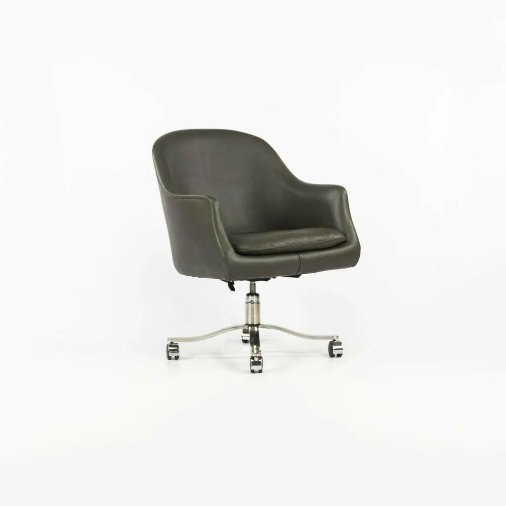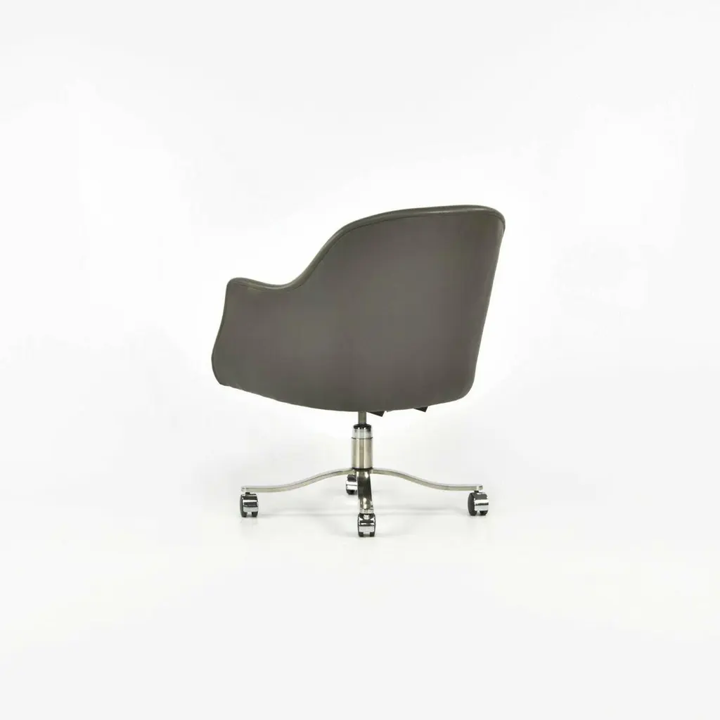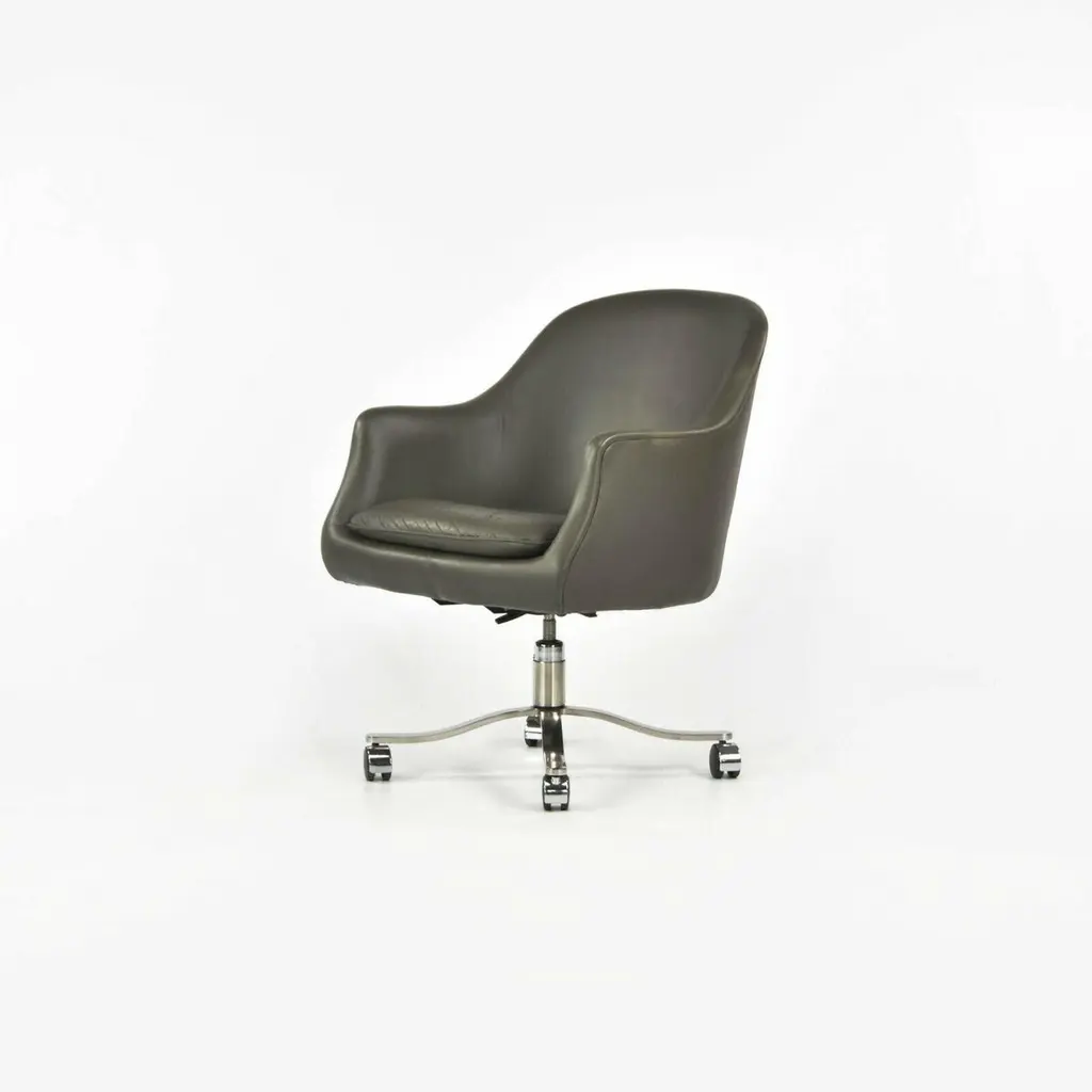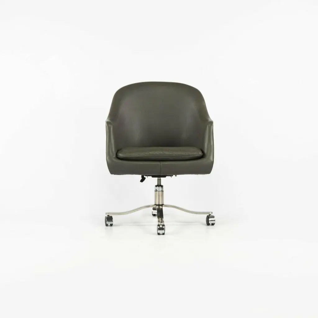 Listed for sale is one (the price listed is for one chair, but two are available) very rare Nicos Zographos rolling bucket desk chairs in gray leather with polished stainless steel alpha bases. The chairs are in very good to excellent vintage condition showing some wear from use and light wear to the bases (see photos). The chairs retain their original Zographos labels and date to circa late 1980s.As noted, the price listed is for one chair. Two chairs are available.For reference, Nicos Zographos, the renowned industrial designer, became a household name at Skidmore, Owings, and Merrill (SOM) architects during the late 1950's and continued to have a relationship with the architectural firm for many decades. He split off to form Zographos Designs Limited. Zographos pieces are known for their uncompromising craftsmanship and quality of materials.Each chair measures 38 inches tall by 28 inches wide and 28 inches deep. They height is adjustable.