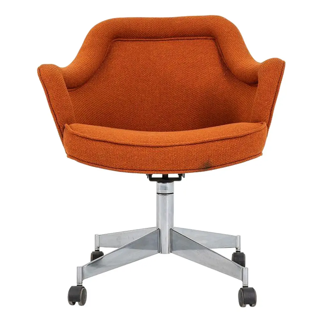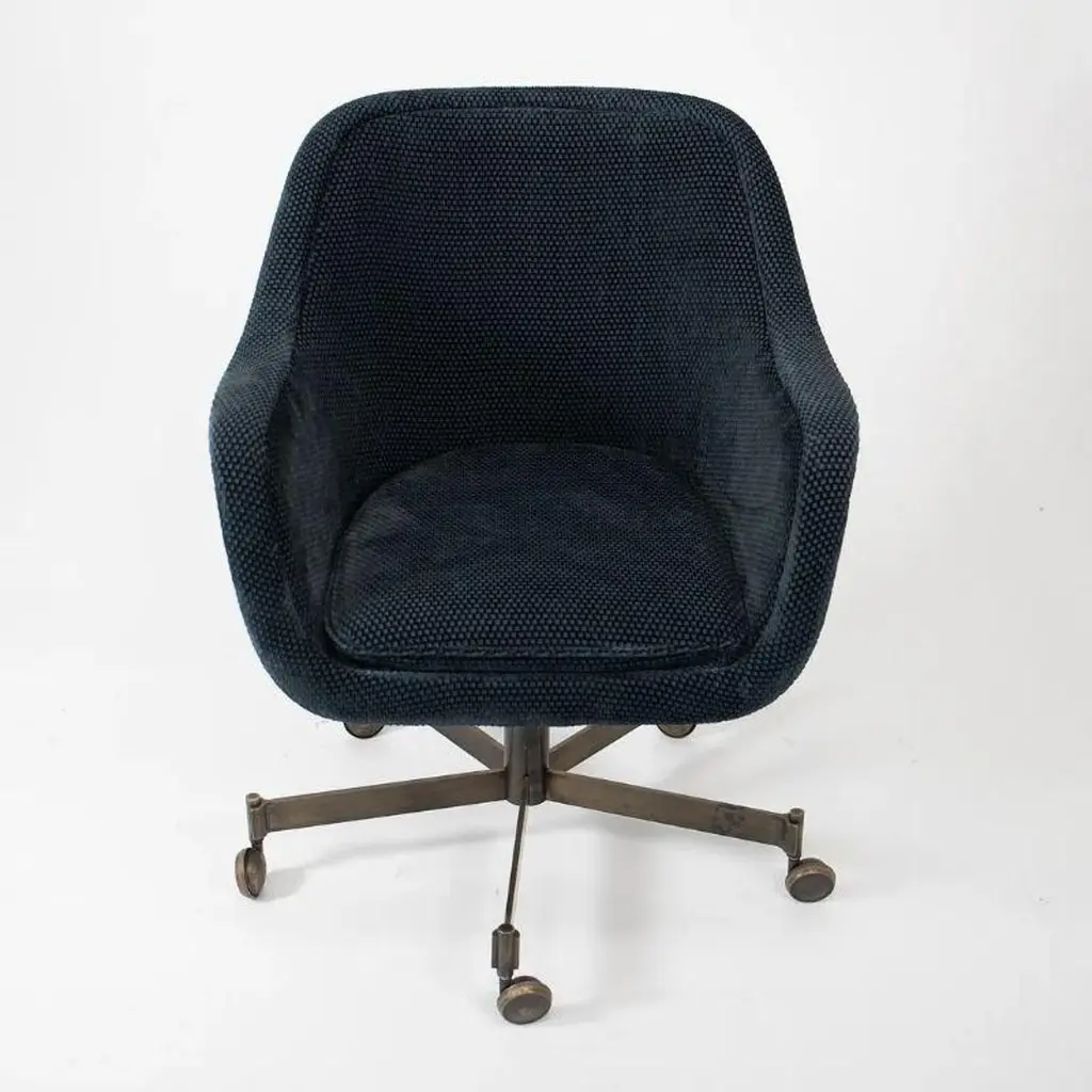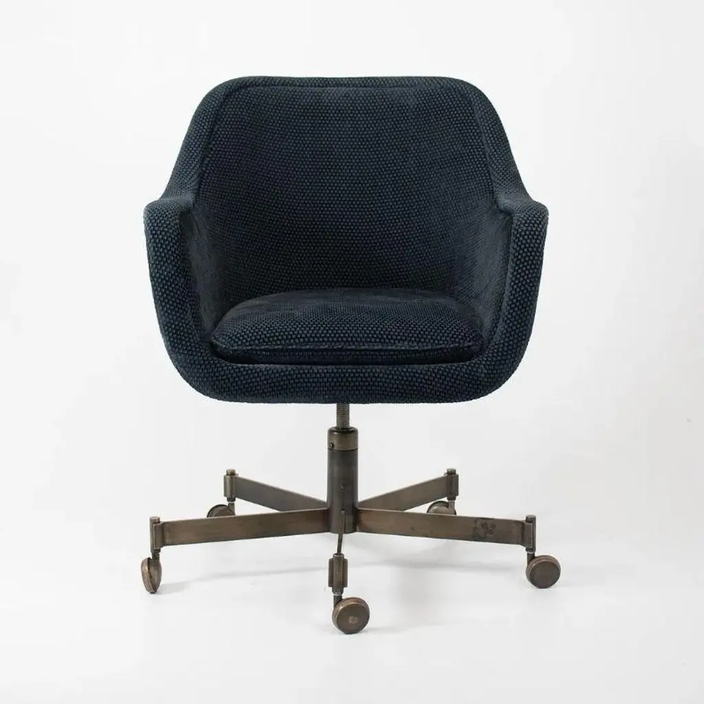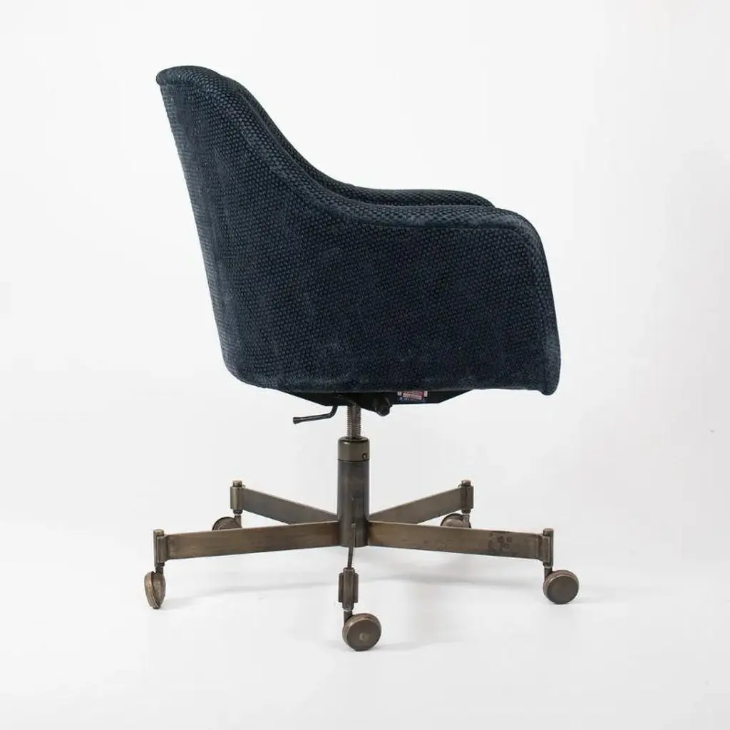 This is a single sculptural barrel-back desk chair, retaining its original blue fabric upholstered seat, and resting on a bronze 5-point base with Shepherd Profile casters. This chair was designed by Ward Bennett and produced by Brickel Associates, ca. 1969. This particular design was introduced in 1964 and is a classic example of Bennett's work during the 1960’s. Condition overall is very good to excellent with some light wear to the upholstery from use. See photos. Two chairs are available. The price listed is for each chair. Each chair measures 33.5 inches tall by 27 inches wide and 26 inches deep. The seat height is adjustable between 17 inches -21 inches. The price listed is for one chair. As noted, two chairs are available. Over the span of Bennett’s career, he designed more than 150 chairs. He compared his design process to that of an artist creating a sculpture, working by piecing the chairs' elements together gradually until he approved of the design as a whole. Using the highest quality materials was integral to Bennett, and making deliberate design choices in order to ensure the most comfortable seating situation was fundamental. Perhaps this is why Ward Bennett’s designs are considered more de rigueur than ever.