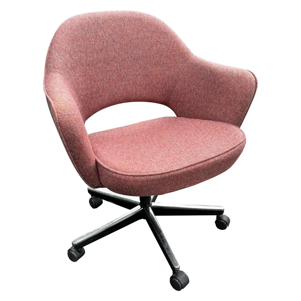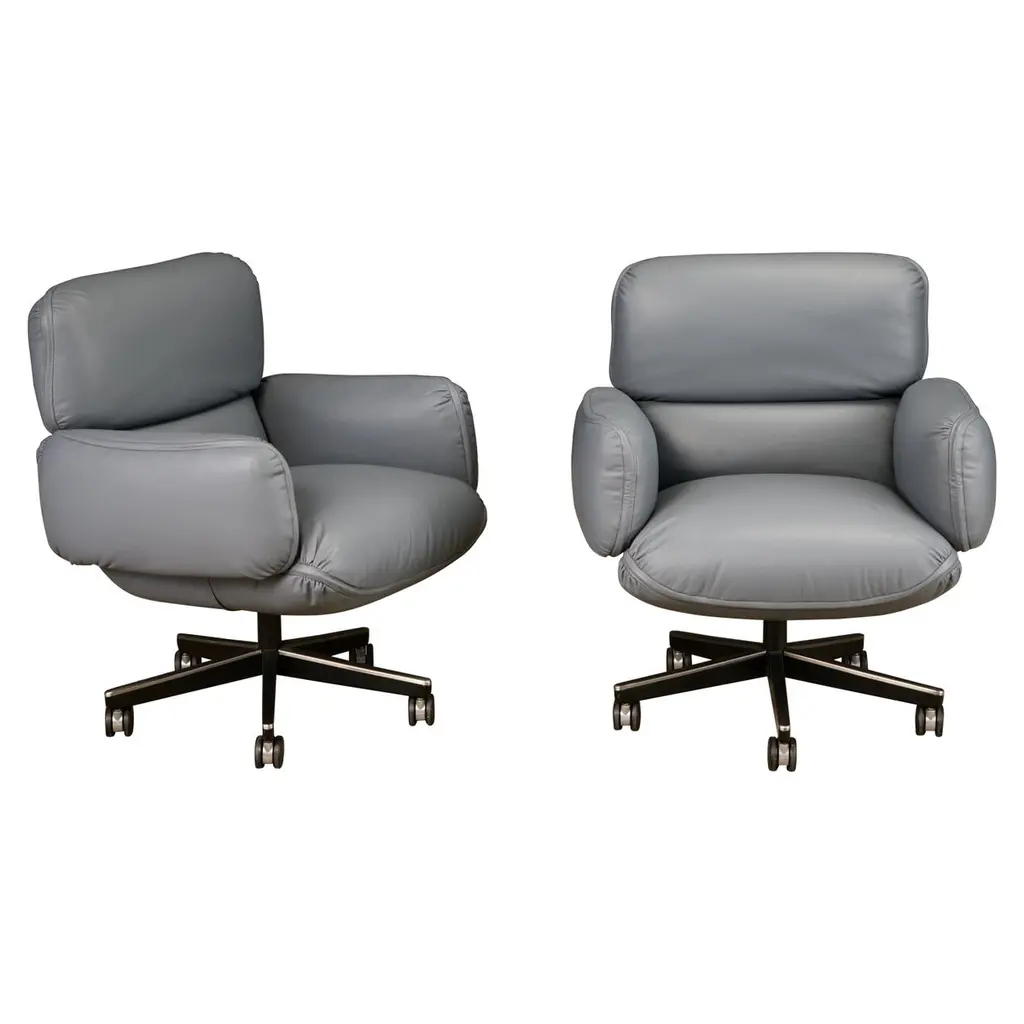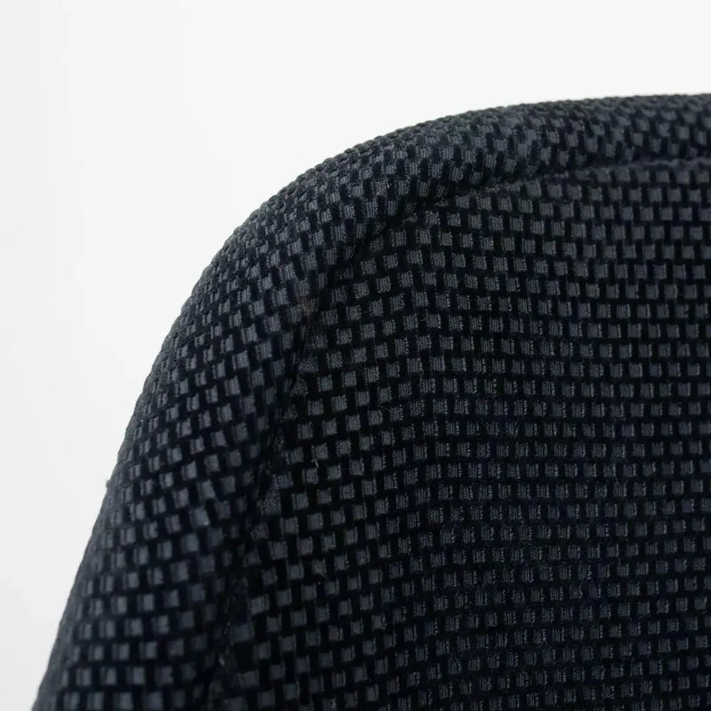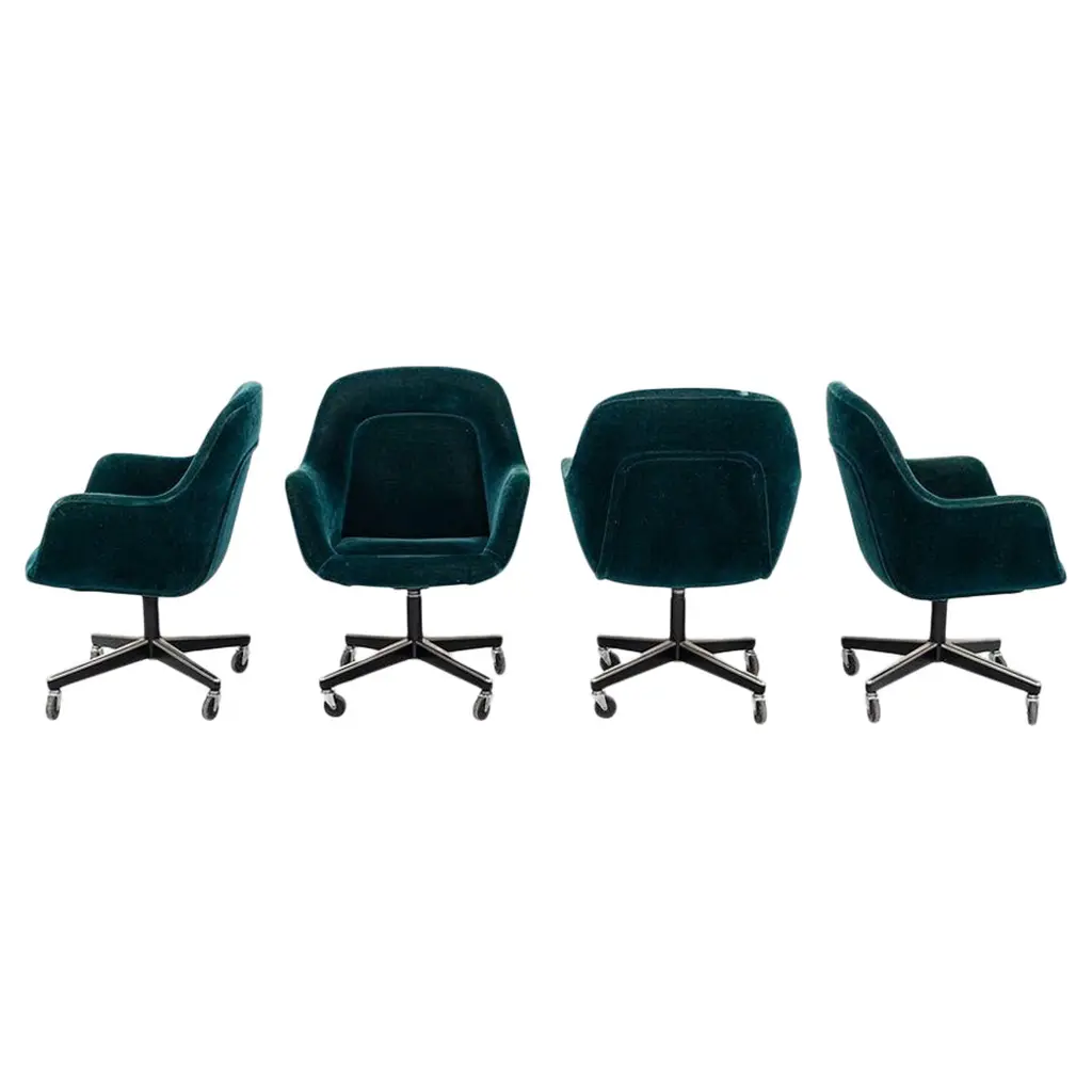 This is a single sculptural barrel-back desk chair, retaining its original blue fabric upholstered seat, and resting on a bronze 5-point base with Shepherd Profile casters. This chair was designed by Ward Bennett and produced by Brickel Associates, ca. 1969. This particular design was introduced in 1964 and is a classic example of Bennett's work during the 1960’s. Condition overall is very good to excellent with some light wear to the upholstery from use. See photos. Two chairs are available. The price listed is for each chair. Each chair measures 33.5 inches tall by 27 inches wide and 26 inches deep. The seat height is adjustable between 17 inches -21 inches. The price listed is for one chair. As noted, two chairs are available. Over the span of Bennett’s career, he designed more than 150 chairs. He compared his design process to that of an artist creating a sculpture, working by piecing the chairs' elements together gradually until he approved of the design as a whole. Using the highest quality materials was integral to Bennett, and making deliberate design choices in order to ensure the most comfortable seating situation was fundamental. Perhaps this is why Ward Bennett’s designs are considered more de rigueur than ever.