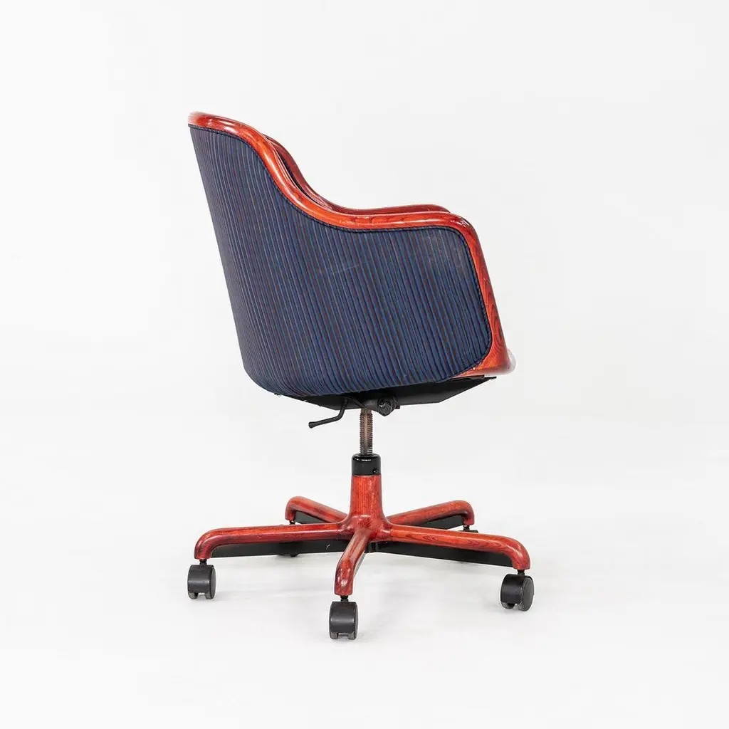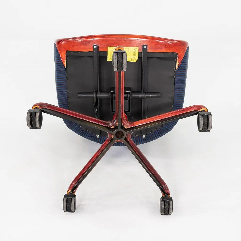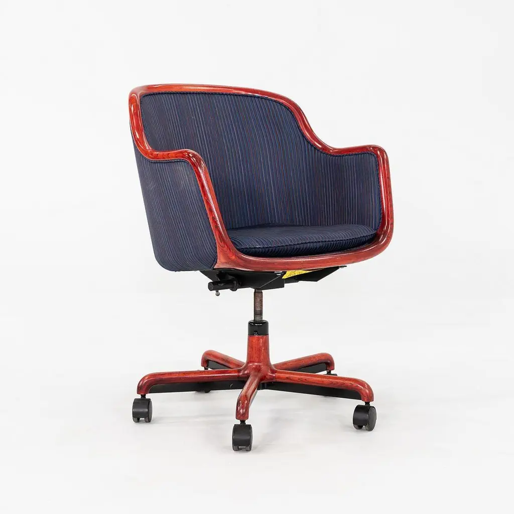 This is an Executive Office Chair designed by Ward Bennett for Brickel Associates in 1970. This particular example was produced in 1986 in the United States. The chair features a red enameled steel frame with an upholstered seat, back, and cushion in blue fabric. The listed price includes one chair and there are four available. The chair measures 22 inches deep, 25.25 inches wide, and 34.25 inches high, with. a seat height of 18 inches. These pieces do show wear from previous use including scratches and surface blemishes on the frames and light stains on the fabric. Overall, each chair is in good condition. Please see photos.