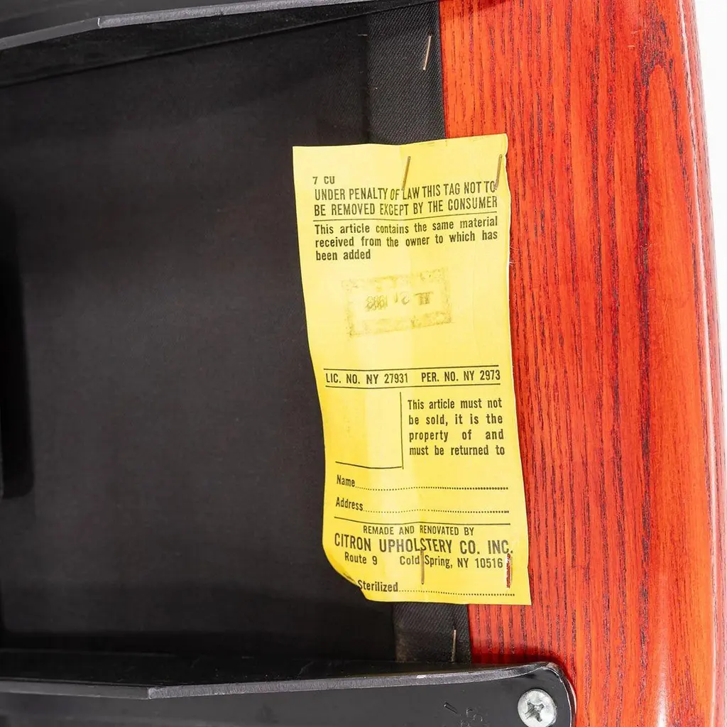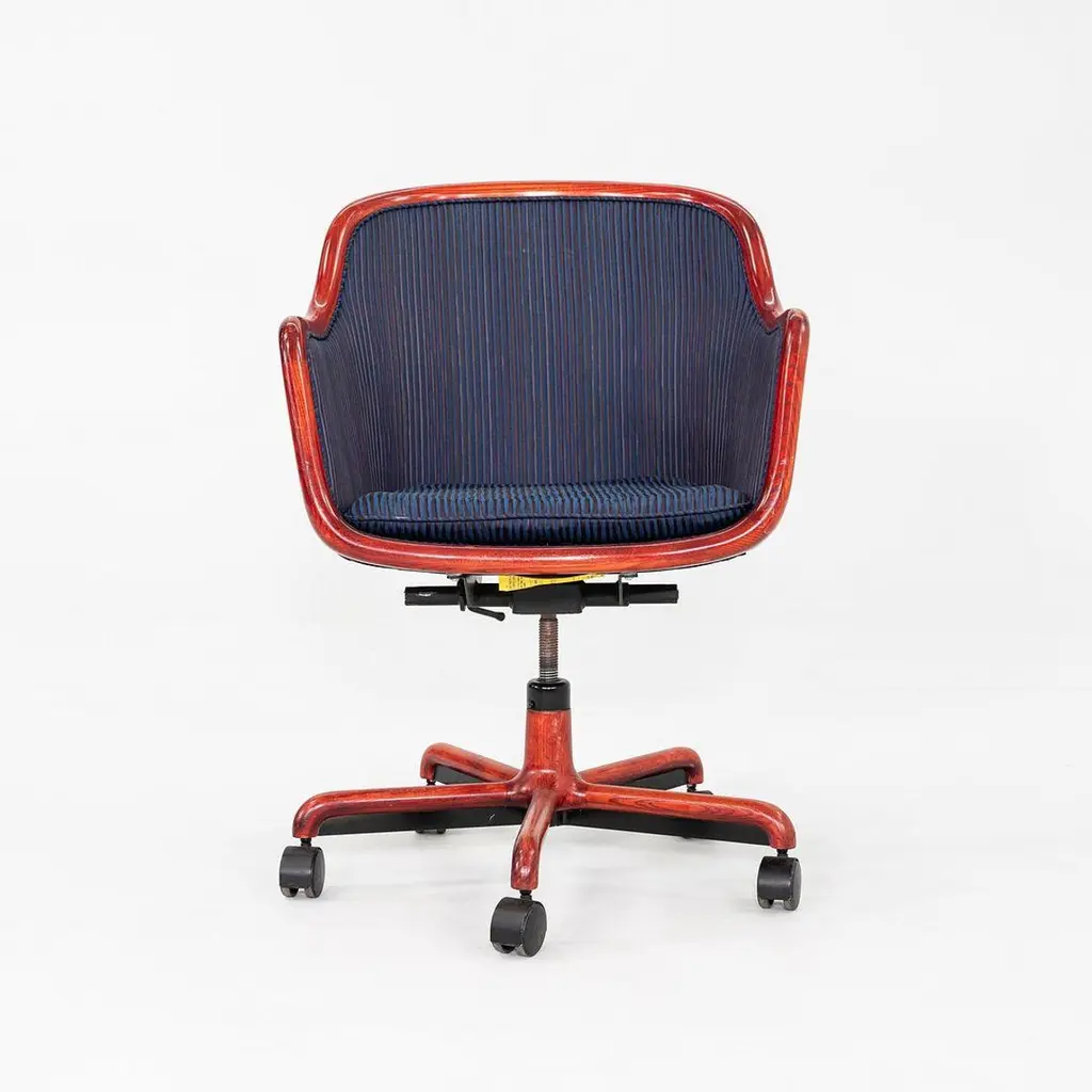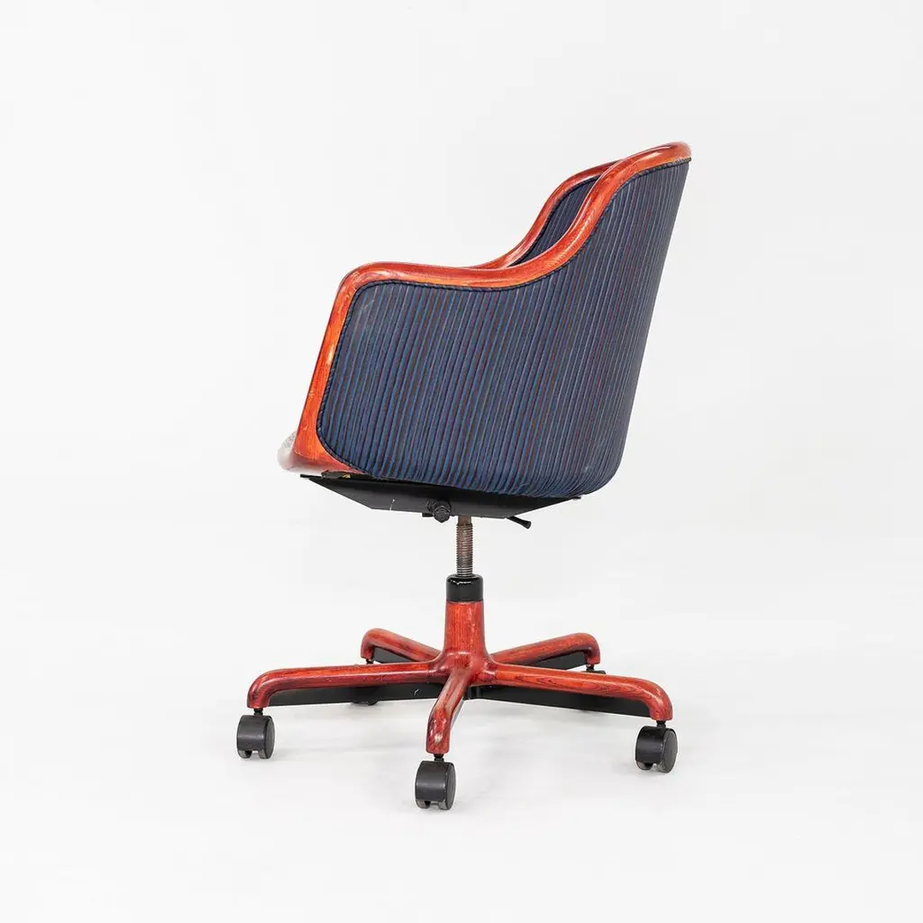 This is an Executive Office Chair designed by Ward Bennett for Brickel Associates in 1970. This particular example was produced in 1986 in the United States. The chair features a red enameled steel frame with an upholstered seat, back, and cushion in blue fabric. The listed price includes one chair and there are four available. The chair measures 22 inches deep, 25.25 inches wide, and 34.25 inches high, with. a seat height of 18 inches. These pieces do show wear from previous use including scratches and surface blemishes on the frames and light stains on the fabric. Overall, each chair is in good condition. Please see photos.
