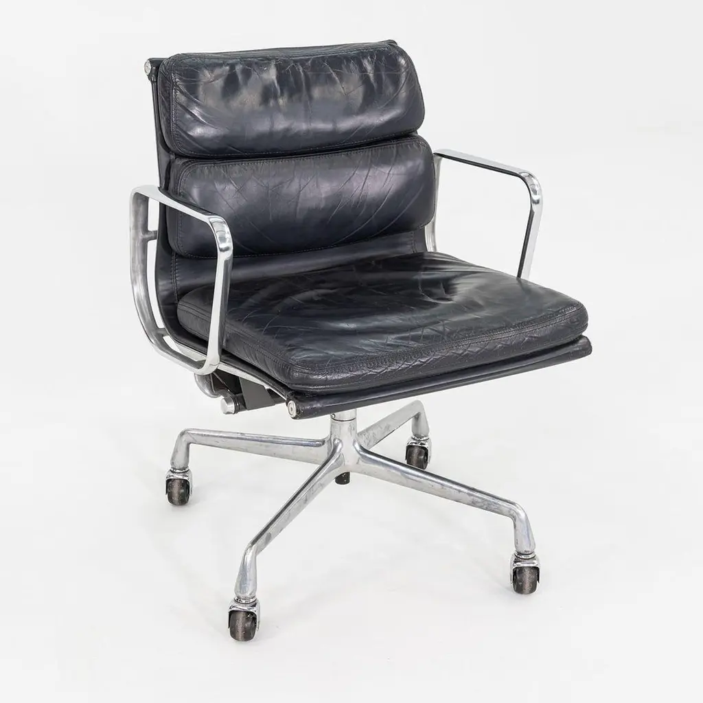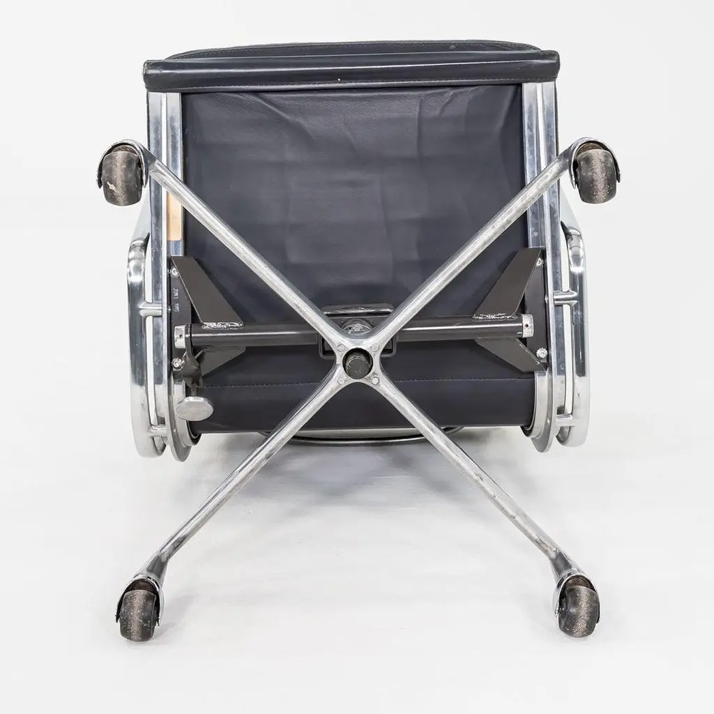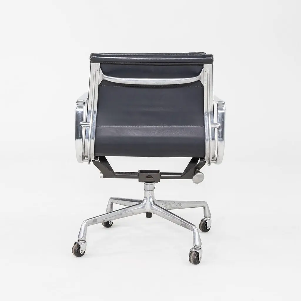 This is an Eames Aluminum Group Soft Pad Management Chairs, Model EA418, originally designed by Charles and Ray Eames for Herman Miller in 1969. These examples date to the year 1989. Their design features a cast aluminum frame, and they have an adjustable 4-star base on casters. Their seats have plush cushions that are 2 inches thick, and they're upholstered in black leather. The listed price includes one chair and there are seven available to purchase. Each chair measures 24 inches deep, 22.5 inches wide, and 34 inches high with a seat height of 20.5 inches. The chairs do show wear consistent with previous use, but overall are in good to very good condition. Please see photos.