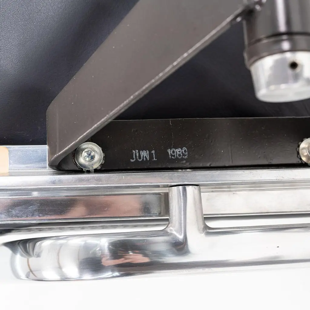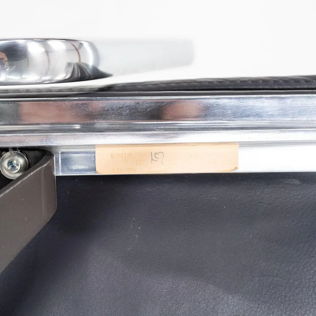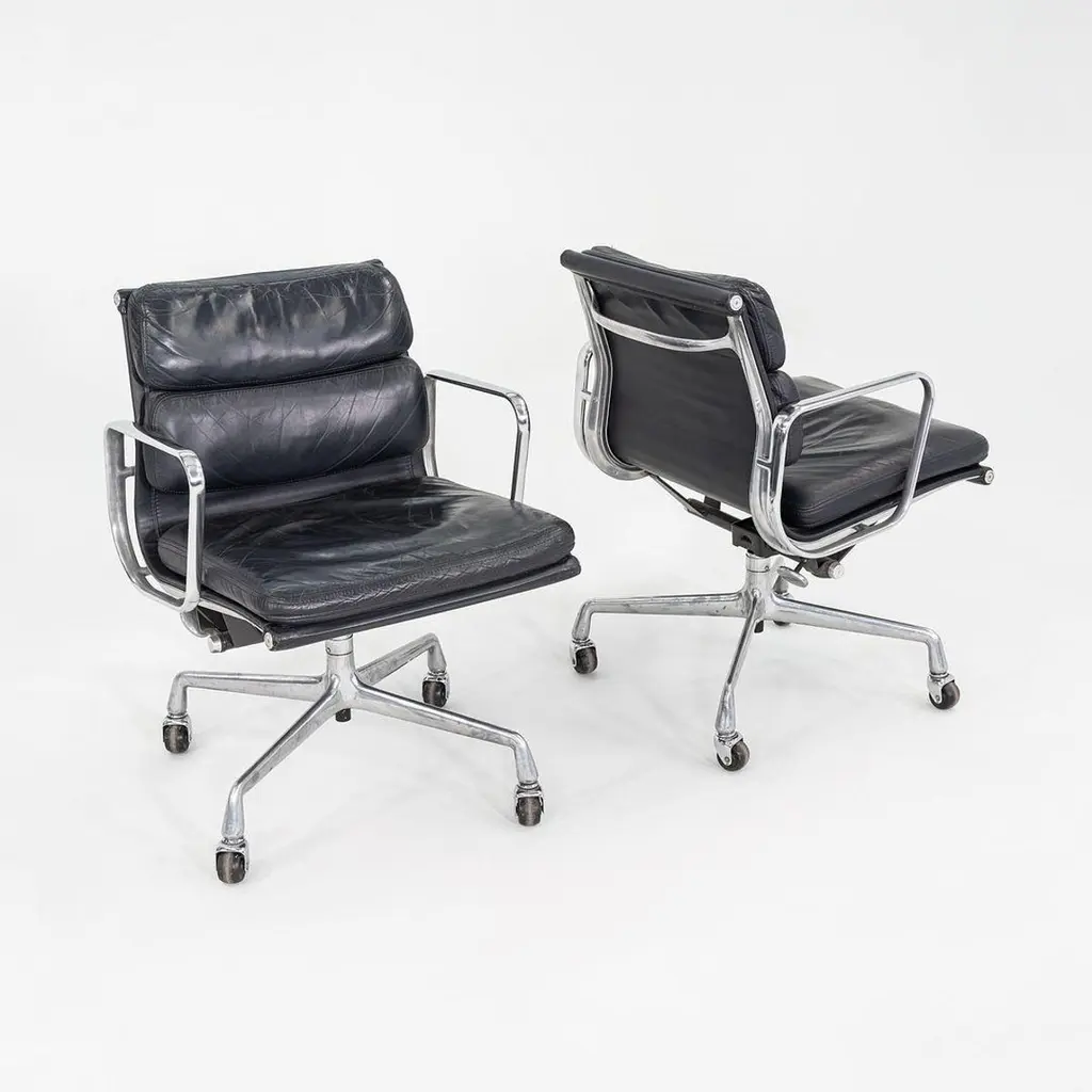 This is an Eames Aluminum Group Soft Pad Management Chairs, Model EA418, originally designed by Charles and Ray Eames for Herman Miller in 1969. These examples date to the year 1989. Their design features a cast aluminum frame, and they have an adjustable 4-star base on casters. Their seats have plush cushions that are 2 inches thick, and they're upholstered in black leather. The listed price includes one chair and there are seven available to purchase. Each chair measures 24 inches deep, 22.5 inches wide, and 34 inches high with a seat height of 20.5 inches. The chairs do show wear consistent with previous use, but overall are in good to very good condition. Please see photos.